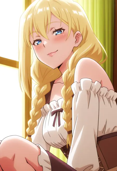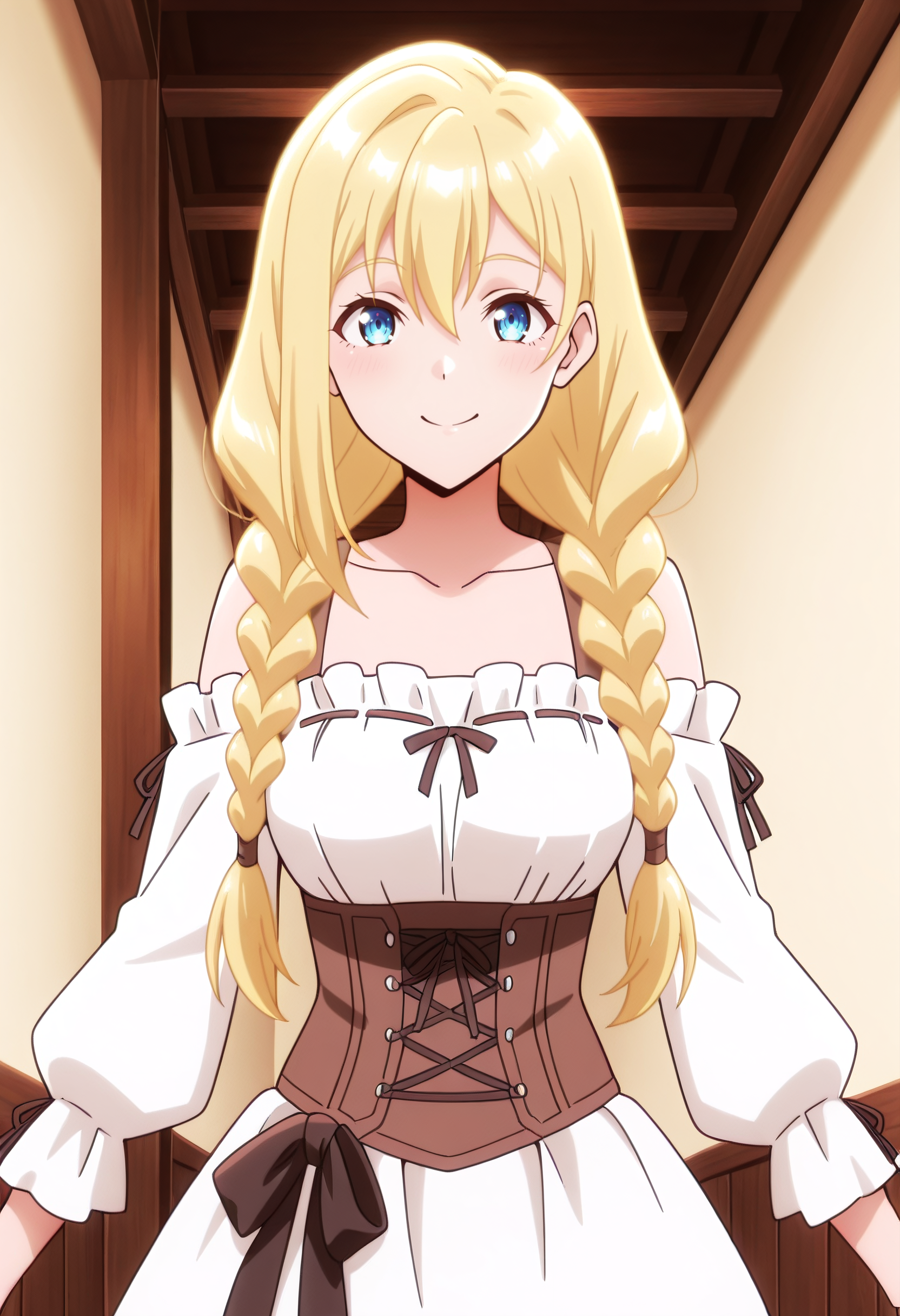 RoxyWhiteDress, 어깨 노출, 드레스, 긴 소매, 프릴, 땋은 머리, 잠금뼈, 분리된 소매, 두 줄 땋은 머리, 코르셋, 어깨 위 머리카락, 오프숄더, 프릴 소매, 흰 드레스, 흉부 아래, 흰 셔츠, 리본, 치마, 리본, 풍선 소매, 오프숄더 드레스,
