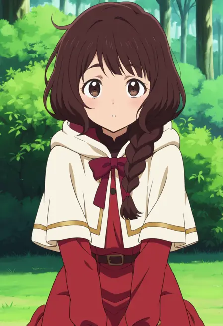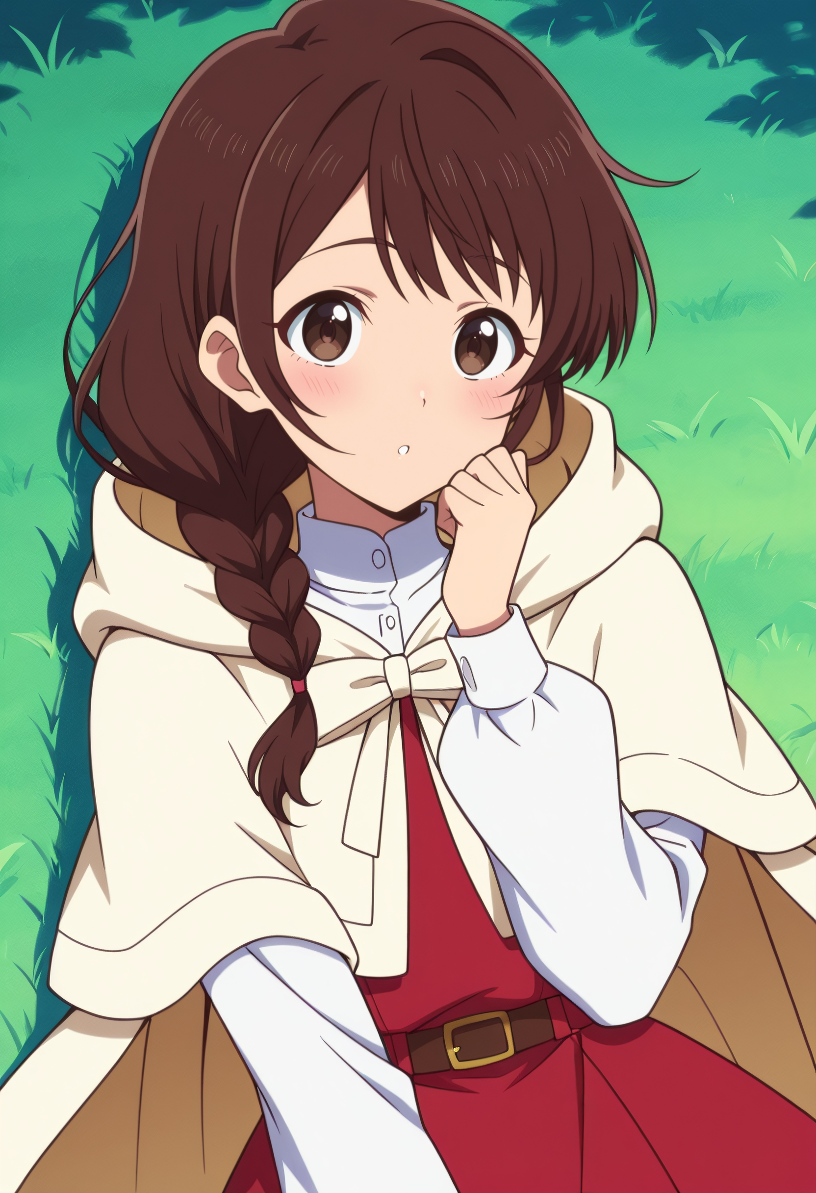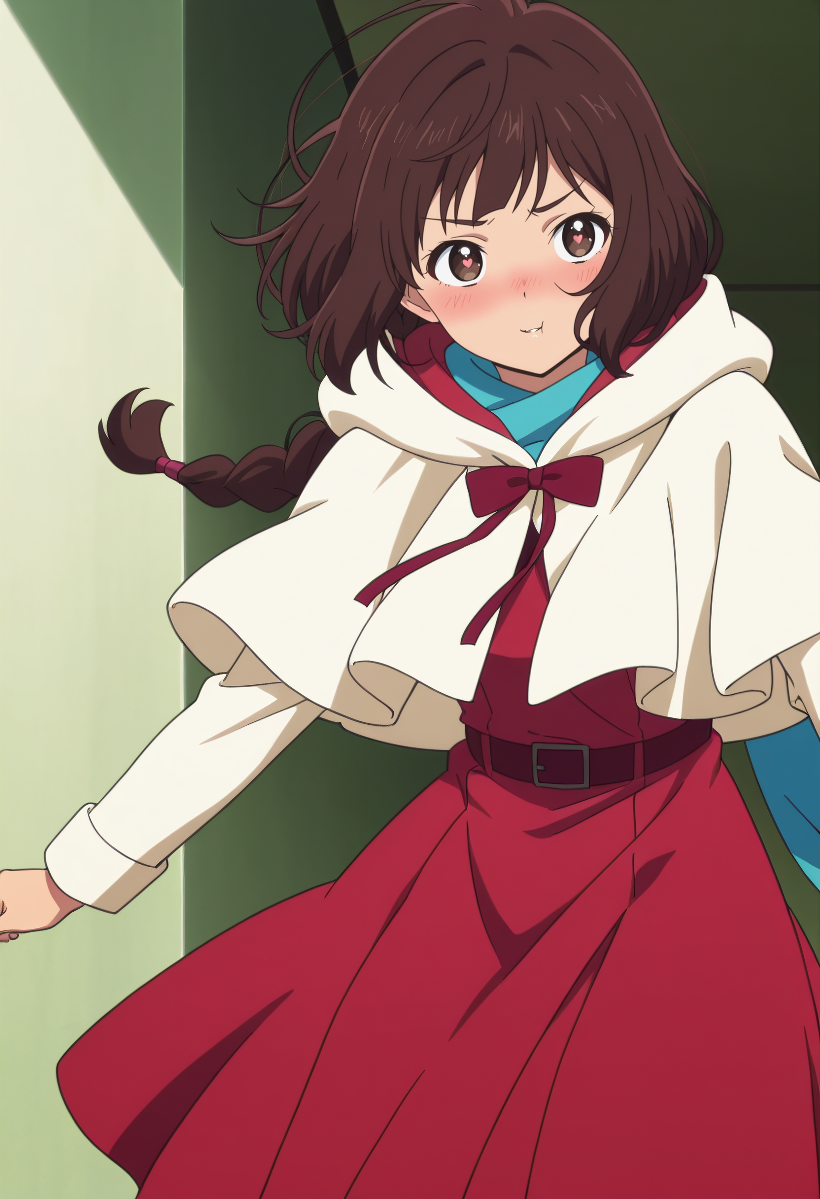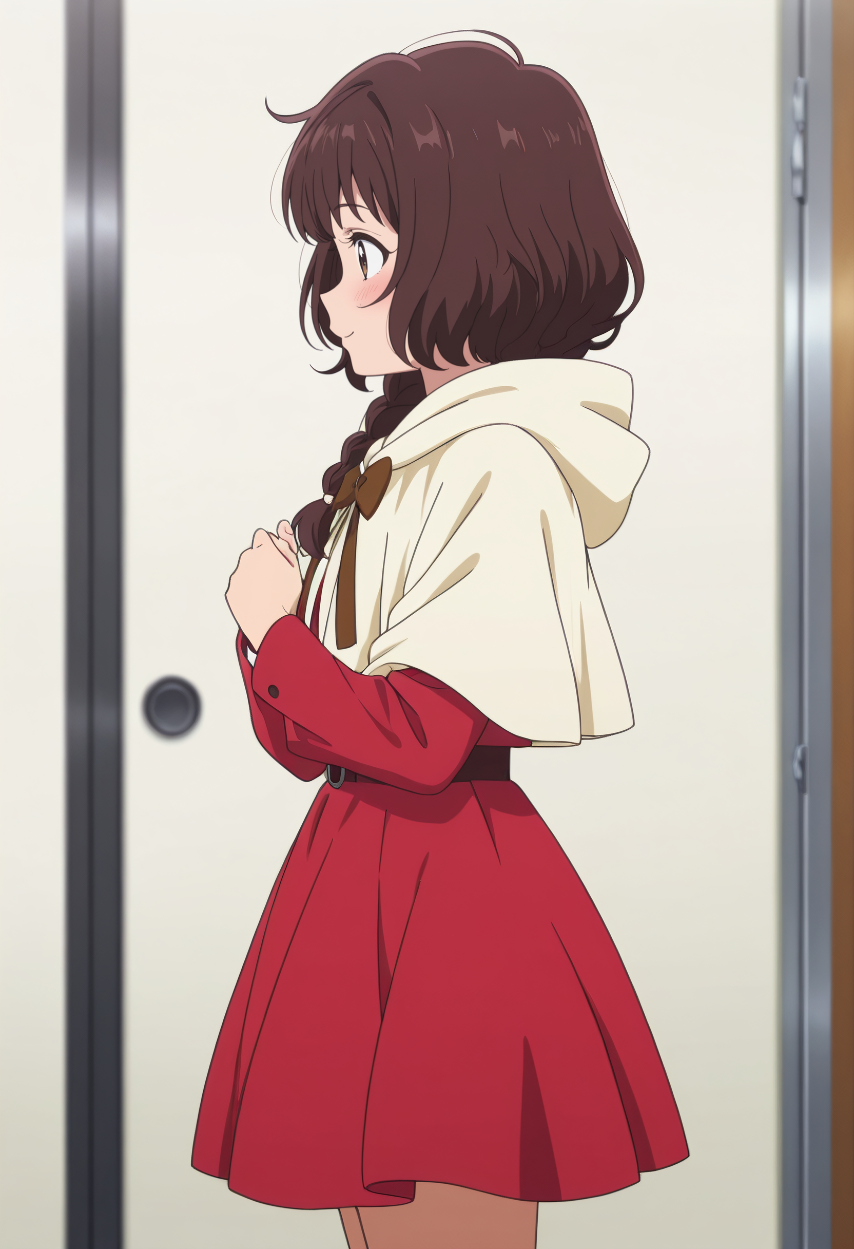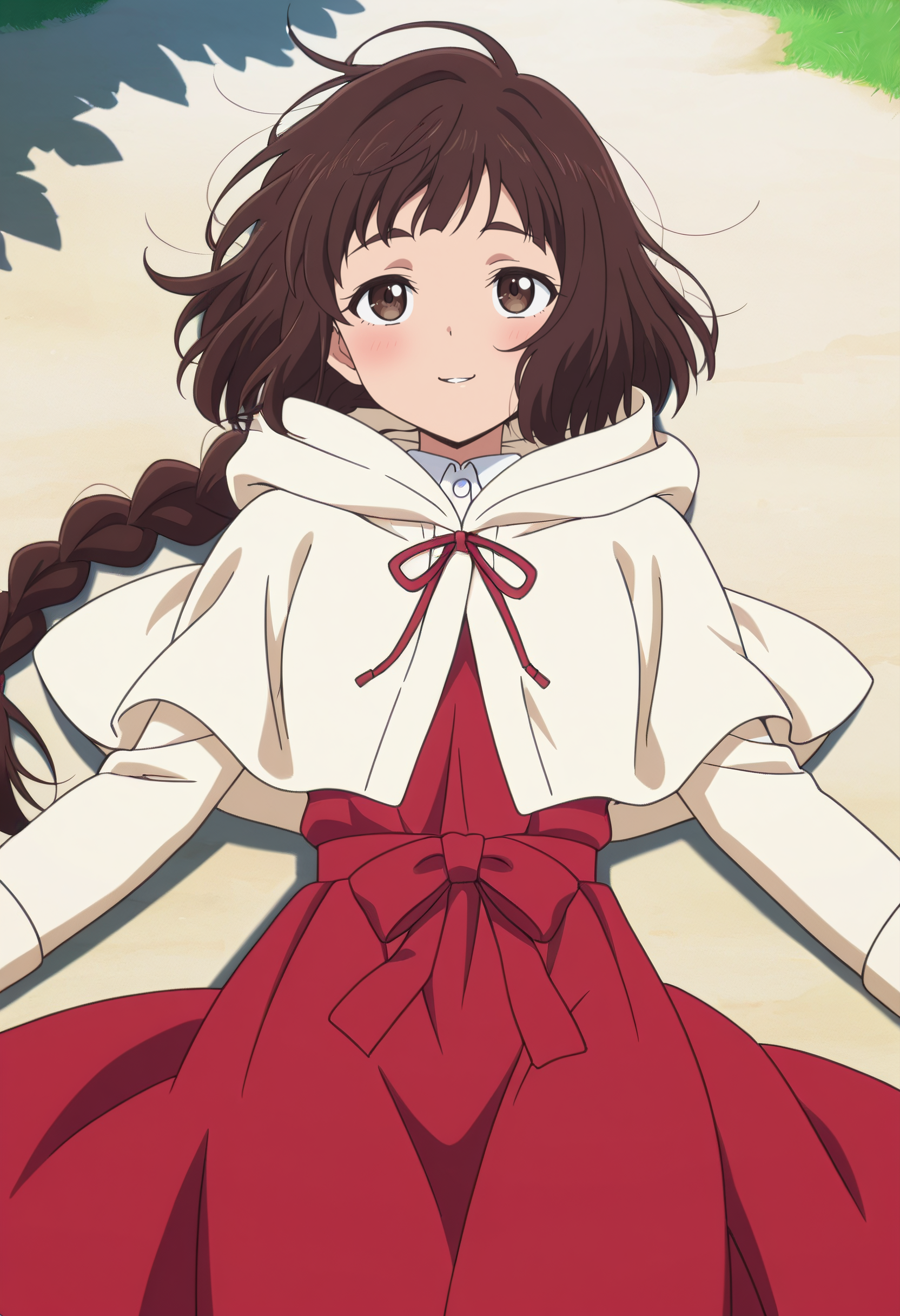 裙子,连衣裙,长袖,蝴蝶结,帽子,帽子下垂,连帽夹克,连帽衫,小斗篷,浅棕色小斗篷,红裙,红袖,纽扣,