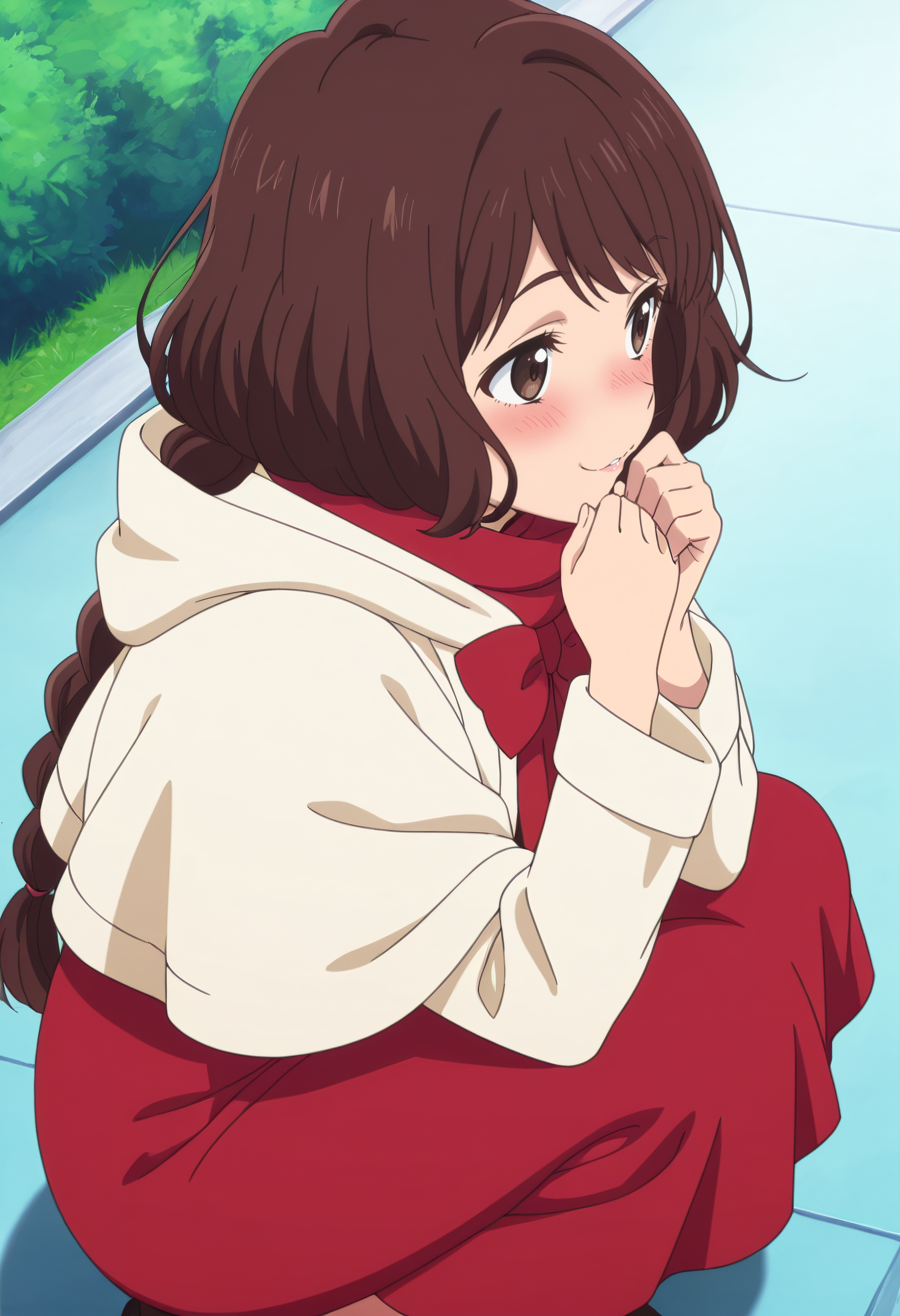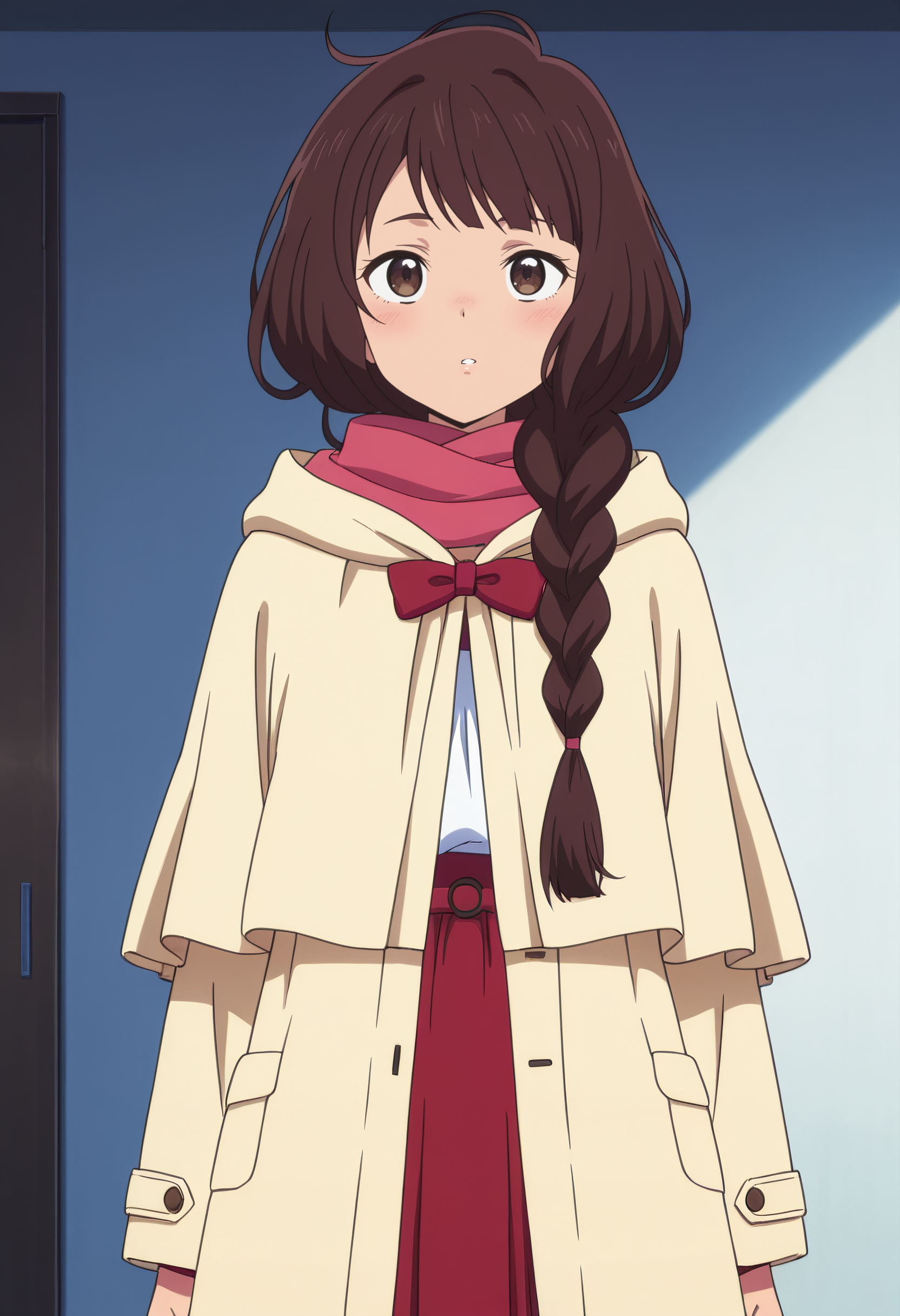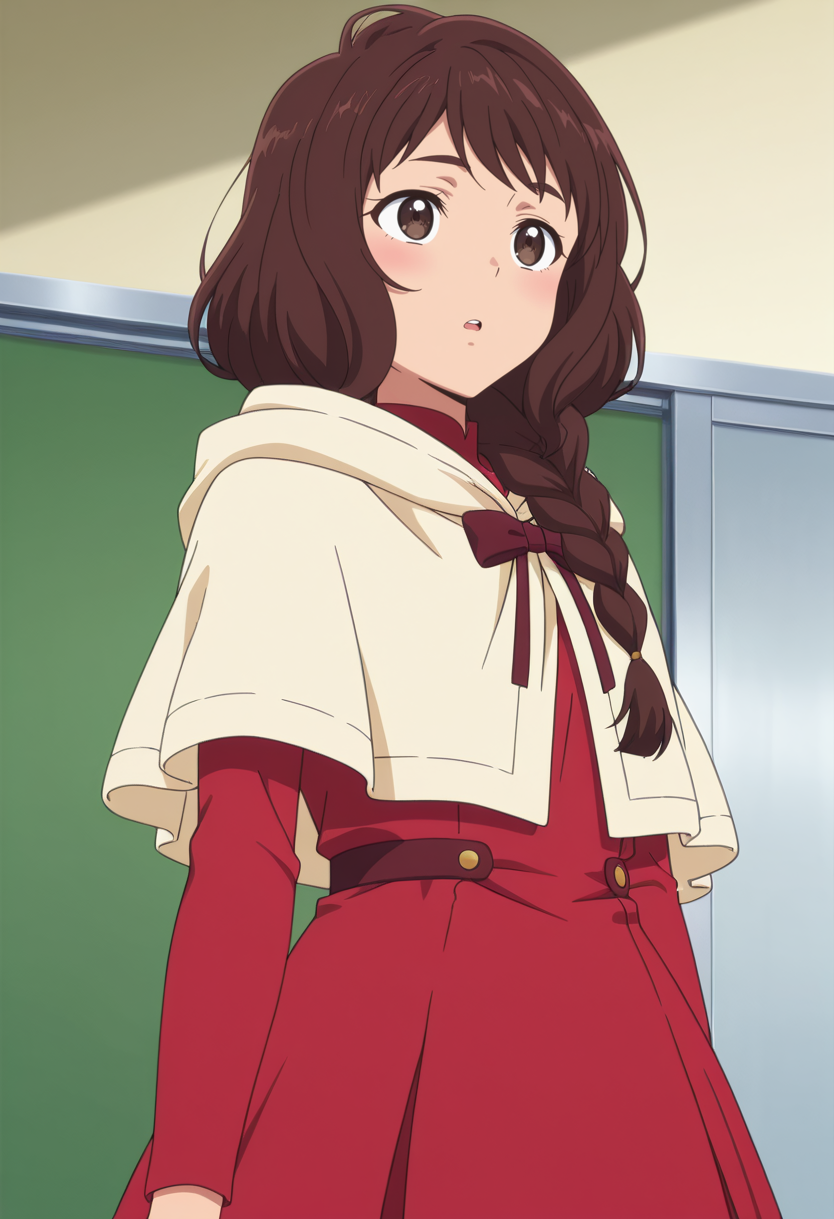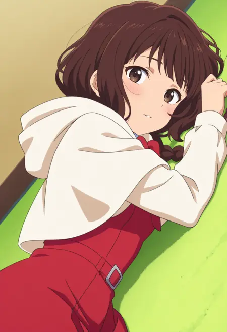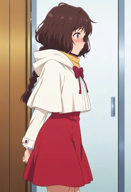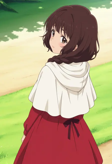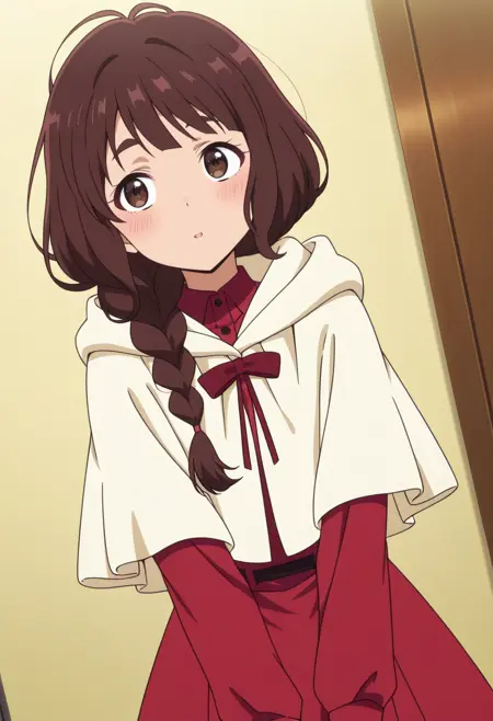 裙子,连衣裙,长袖,蝴蝶结,帽子,帽子下垂,连帽夹克,连帽衫,小斗篷,浅棕色小斗篷,红裙,红袖,纽扣,