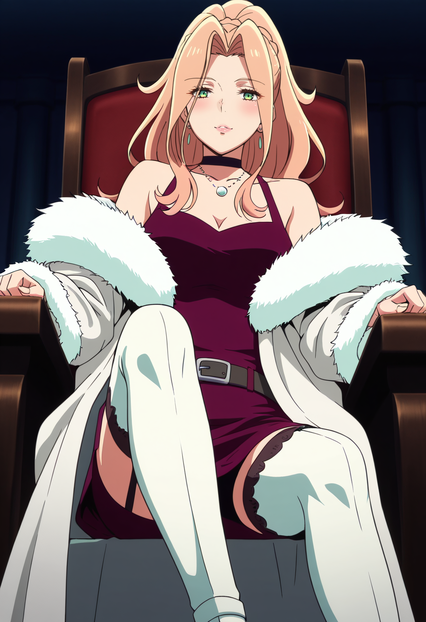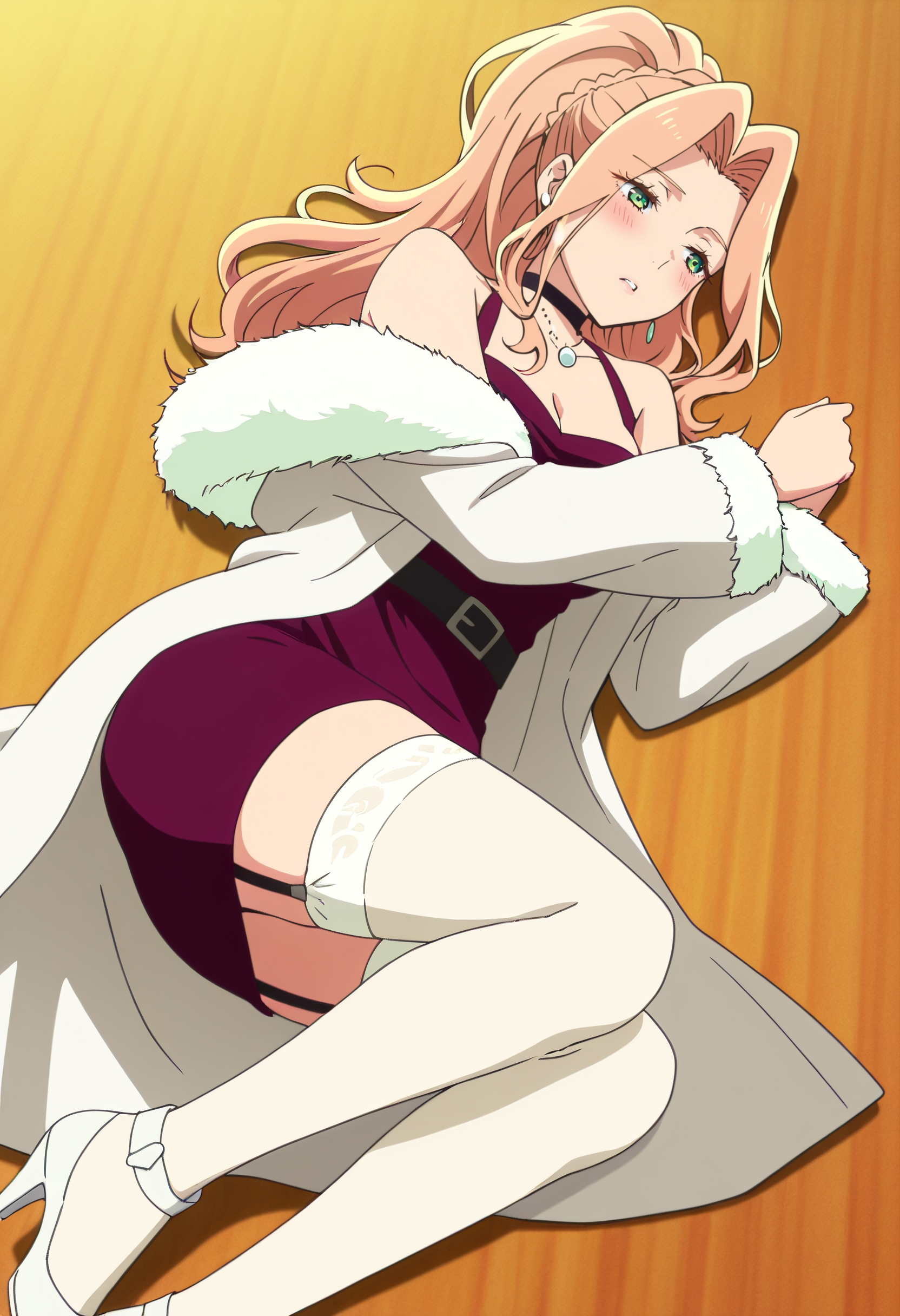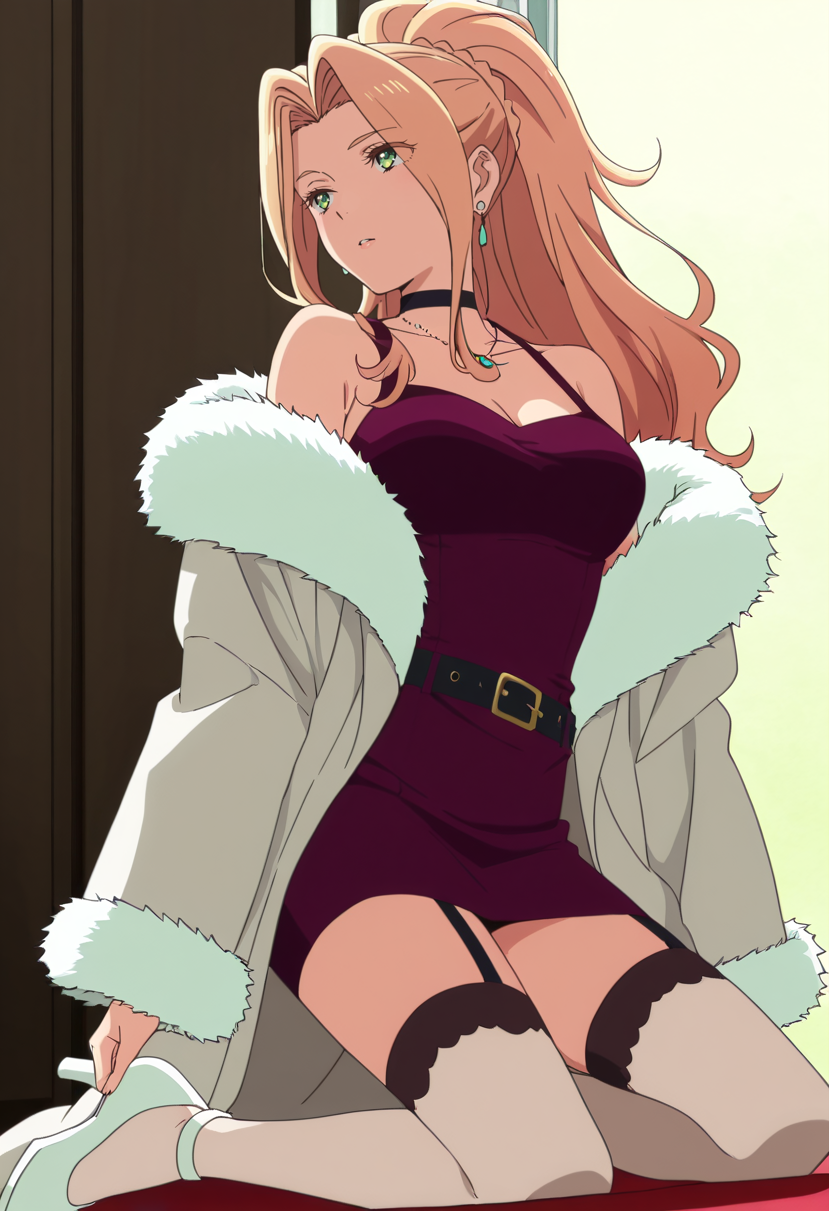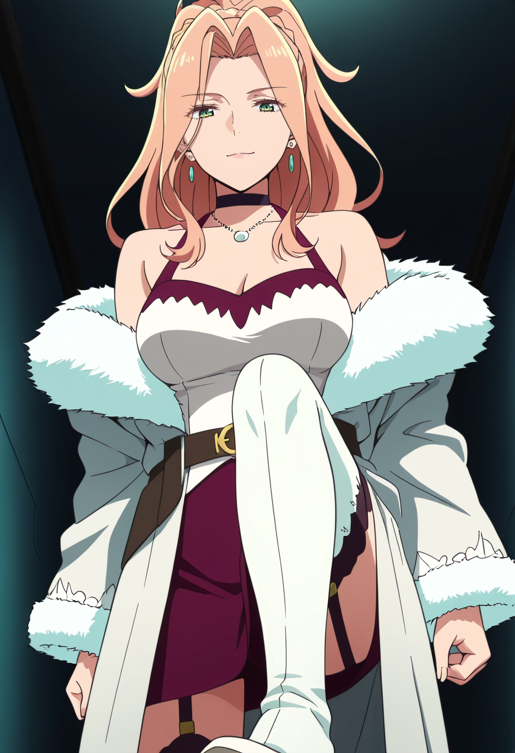 보석, 모피 트림, 초커, 어깨 노출, 드레스, 귀걸이, 목걸이, 잠금뼈, 코트, 모피 트림 코트, 재킷, 모피 코트, 어깨 드리프트, 가슴 노출, 모피 트림 코트, 모피 트림 소매, 모피, 검은 초커, 허벅지 길이 양말, 긴 소매, 치마, 모피 트림 드레스, 게터 스트랩, 흰색 하의, 벨트, 하이힐, 흰색 신발,