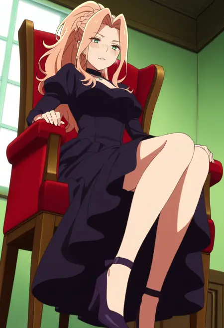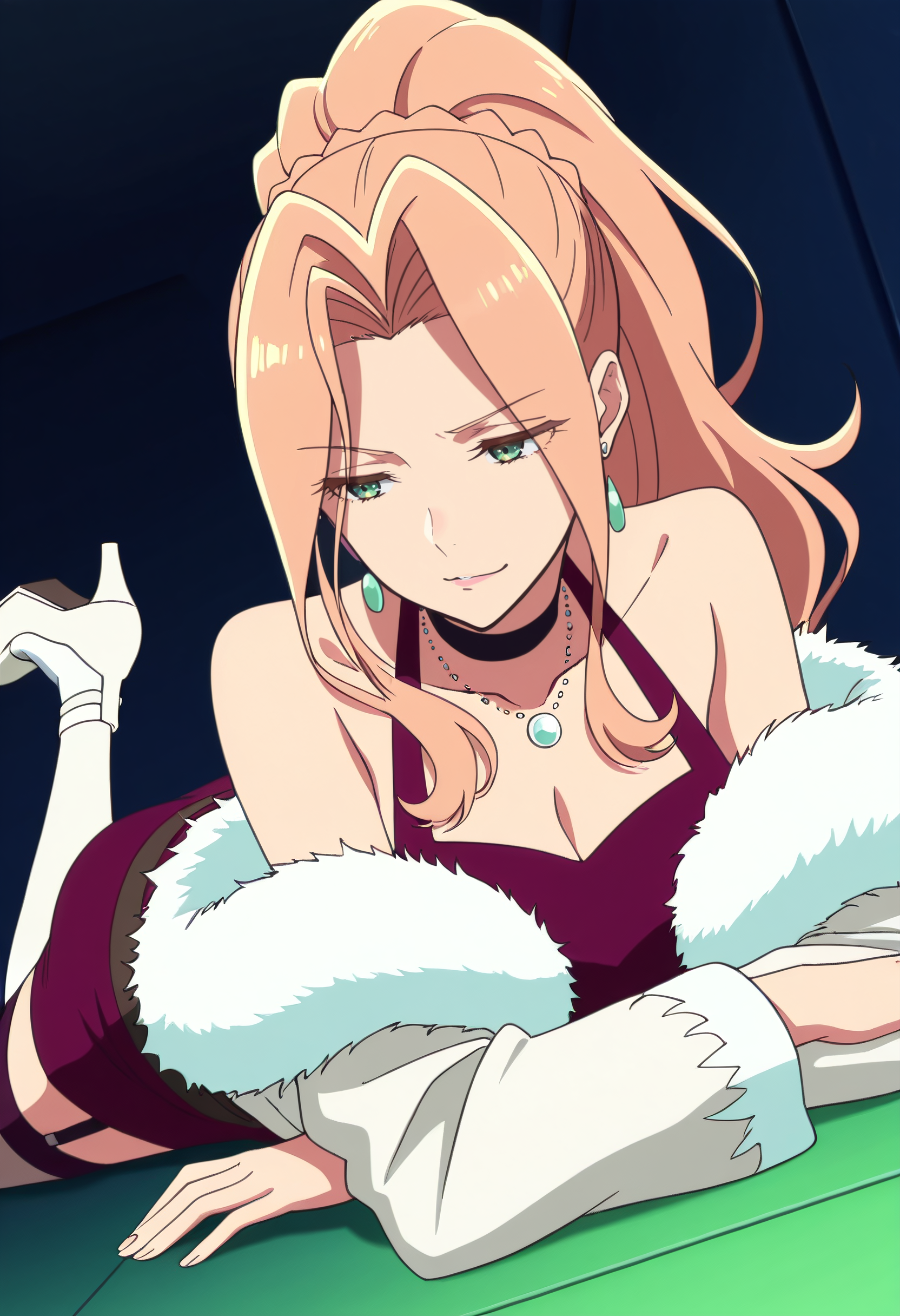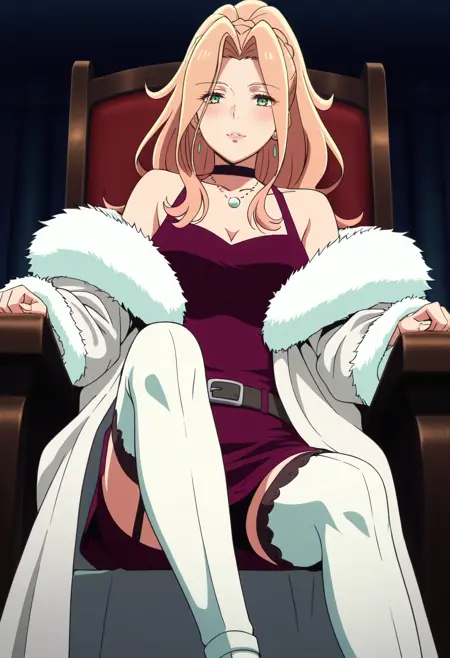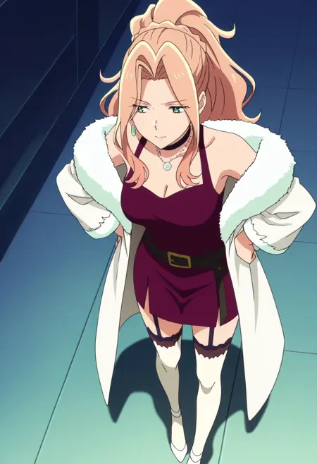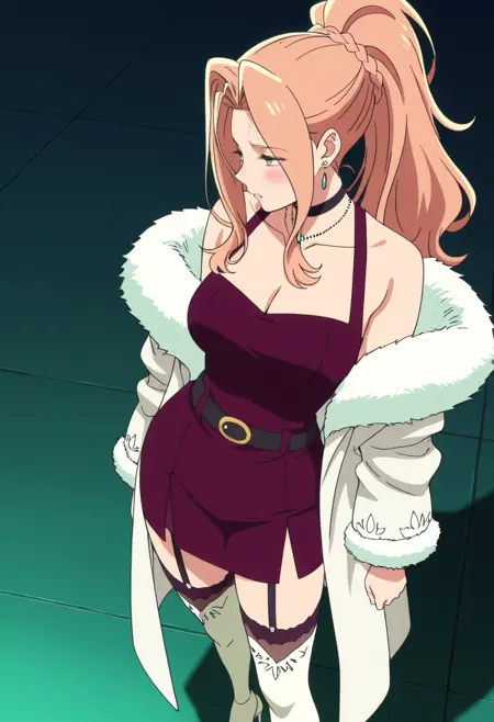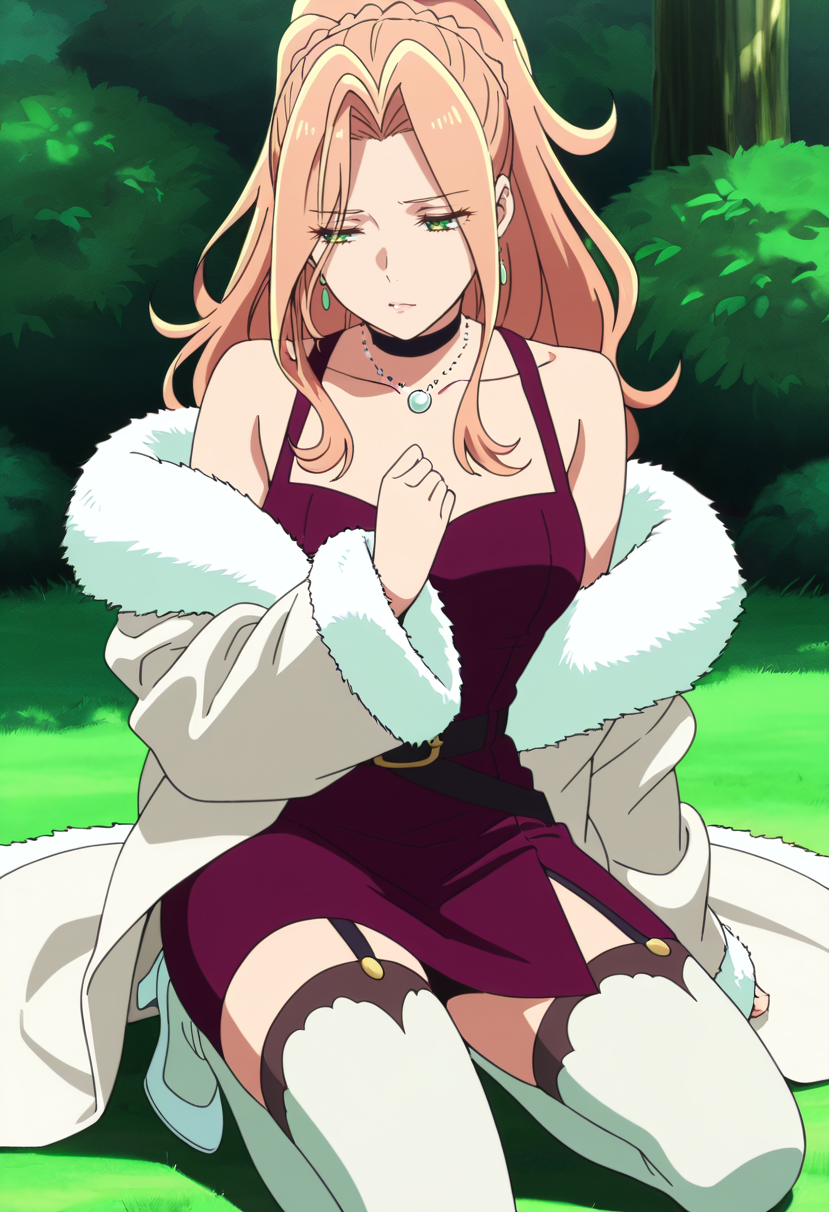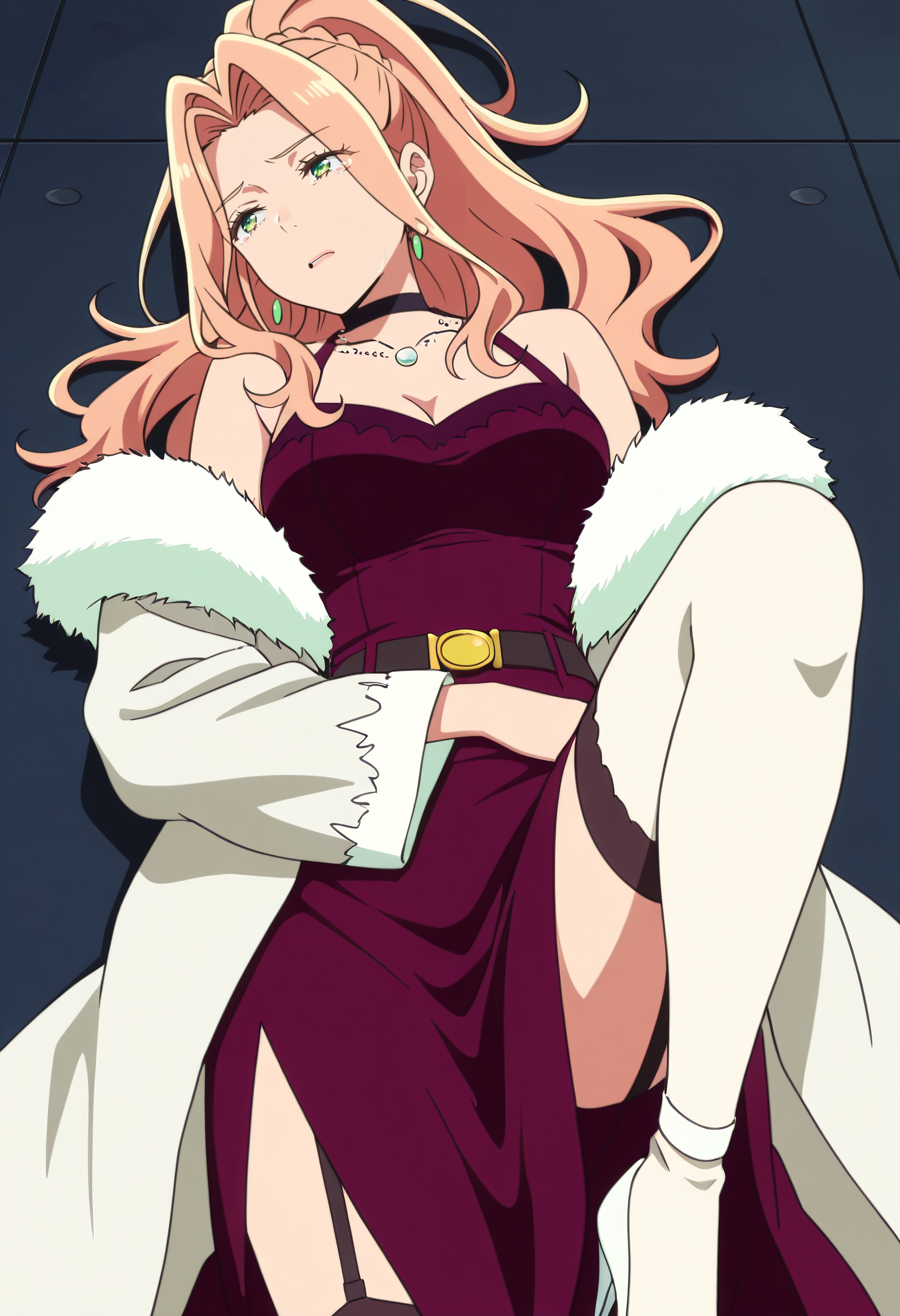 보석, 모피 트림, 초커, 어깨 노출, 드레스, 귀걸이, 목걸이, 잠금뼈, 코트, 모피 트림 코트, 재킷, 모피 코트, 어깨 드리프트, 가슴 노출, 모피 트림 코트, 모피 트림 소매, 모피, 검은 초커, 허벅지 길이 양말, 긴 소매, 치마, 모피 트림 드레스, 게터 스트랩, 흰색 하의, 벨트, 하이힐, 흰색 신발,