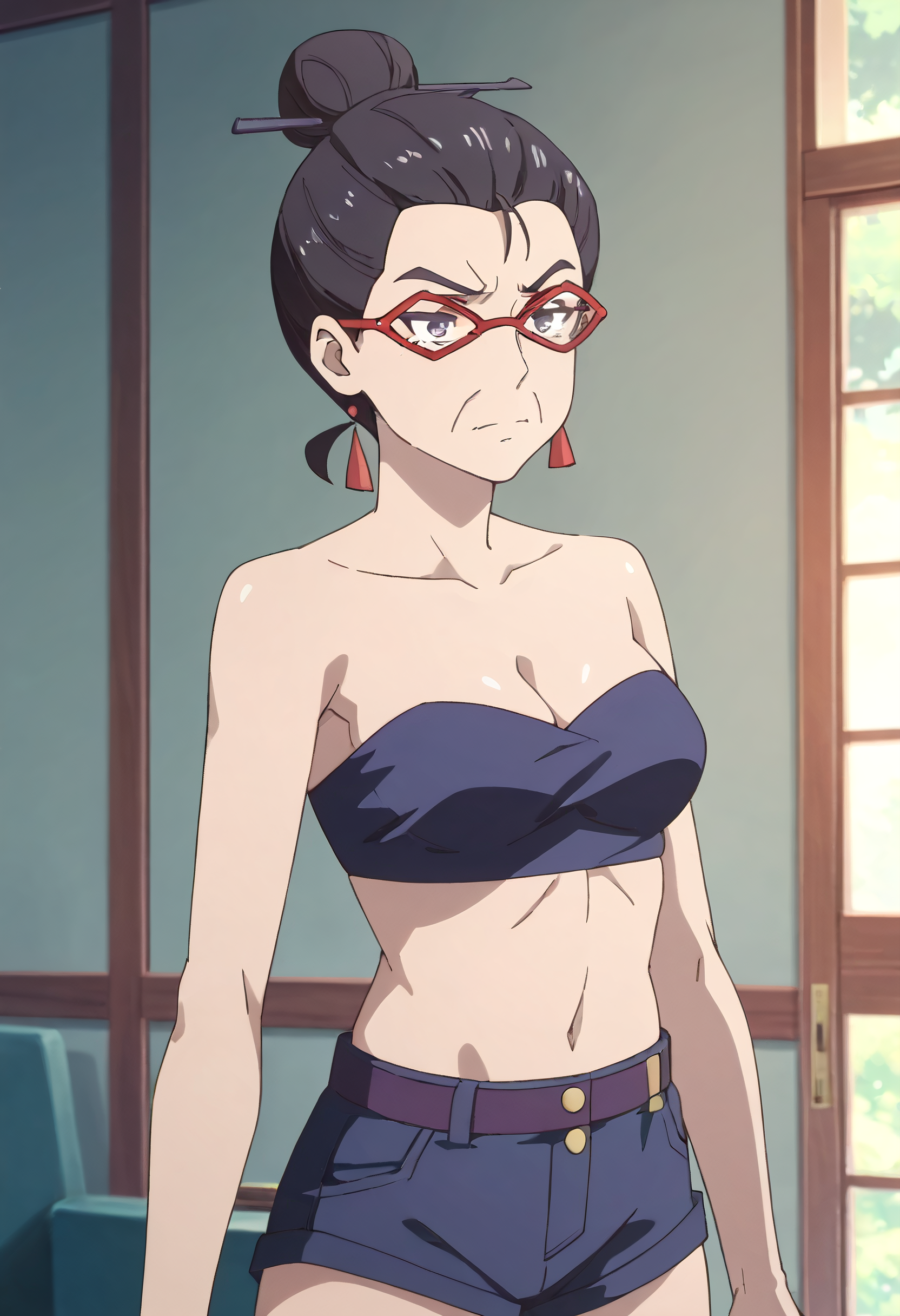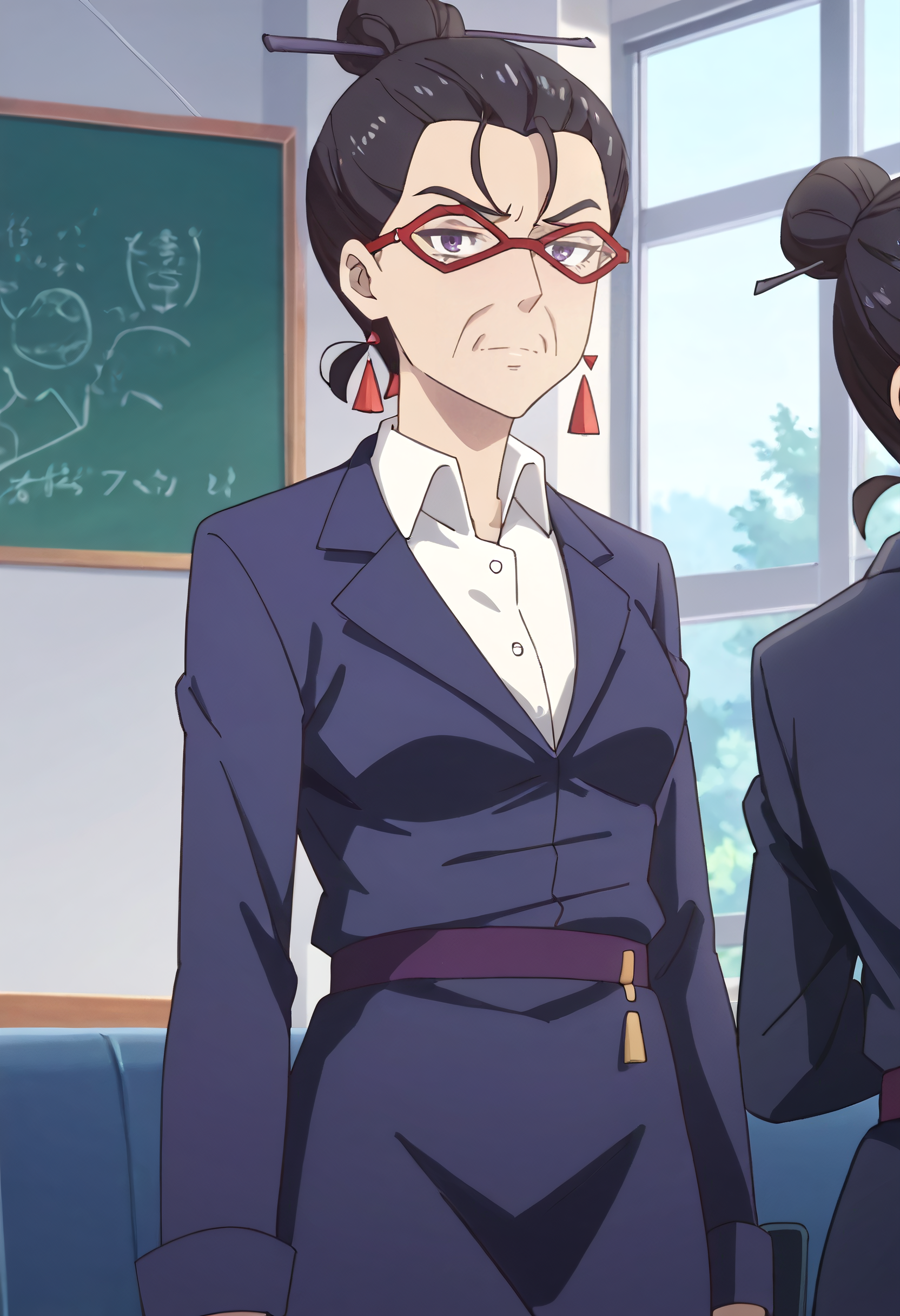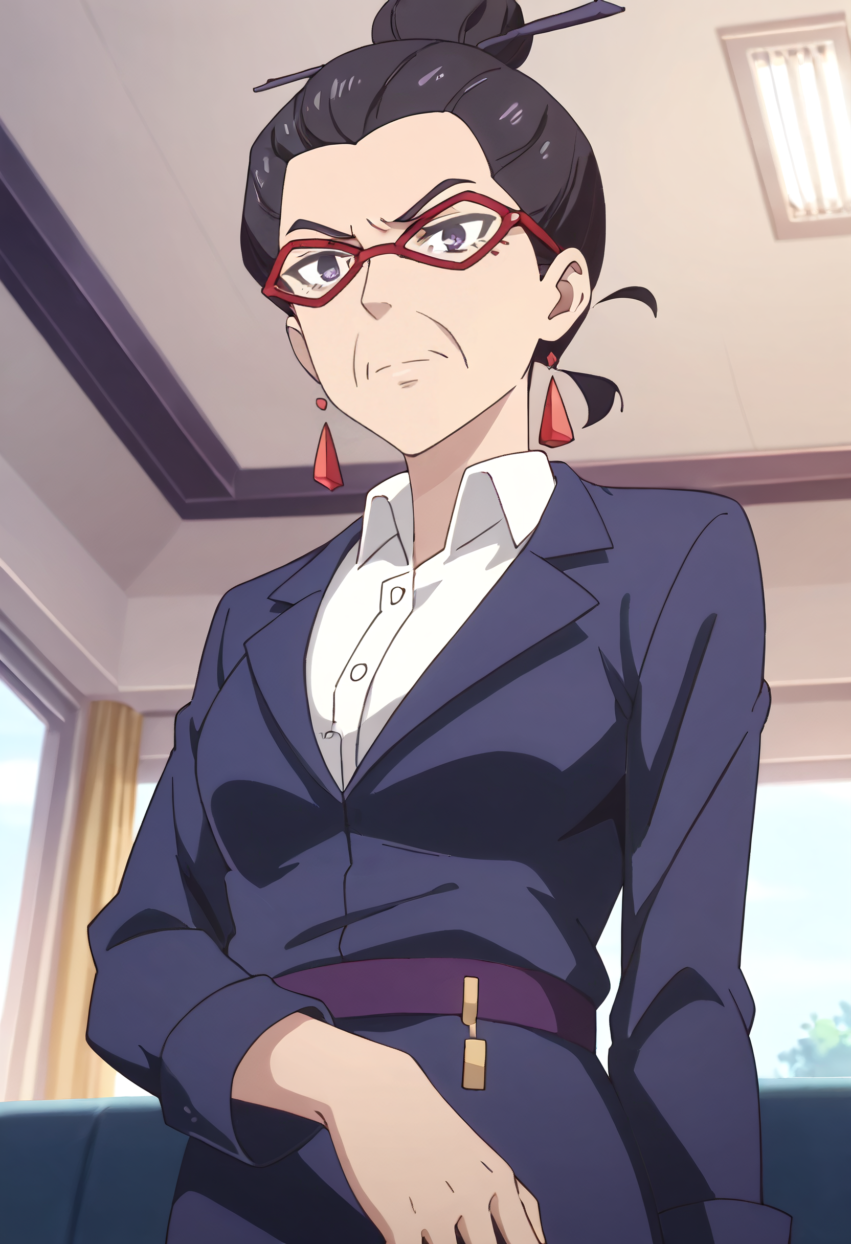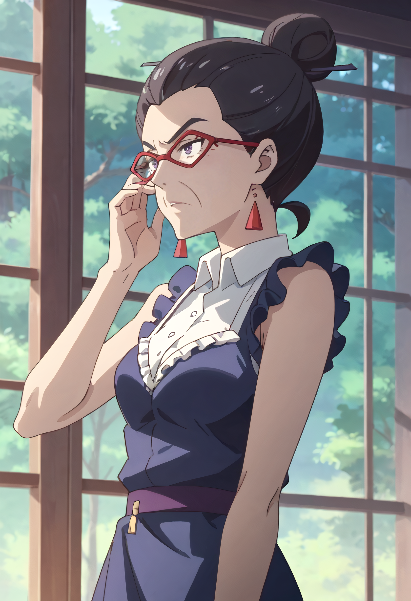 TDLPan, black hair, hair bun, short hair, long hair, purple eyes, glasses, red-framed eyewear, semi-rimless eyewear, under-rim eyewear,