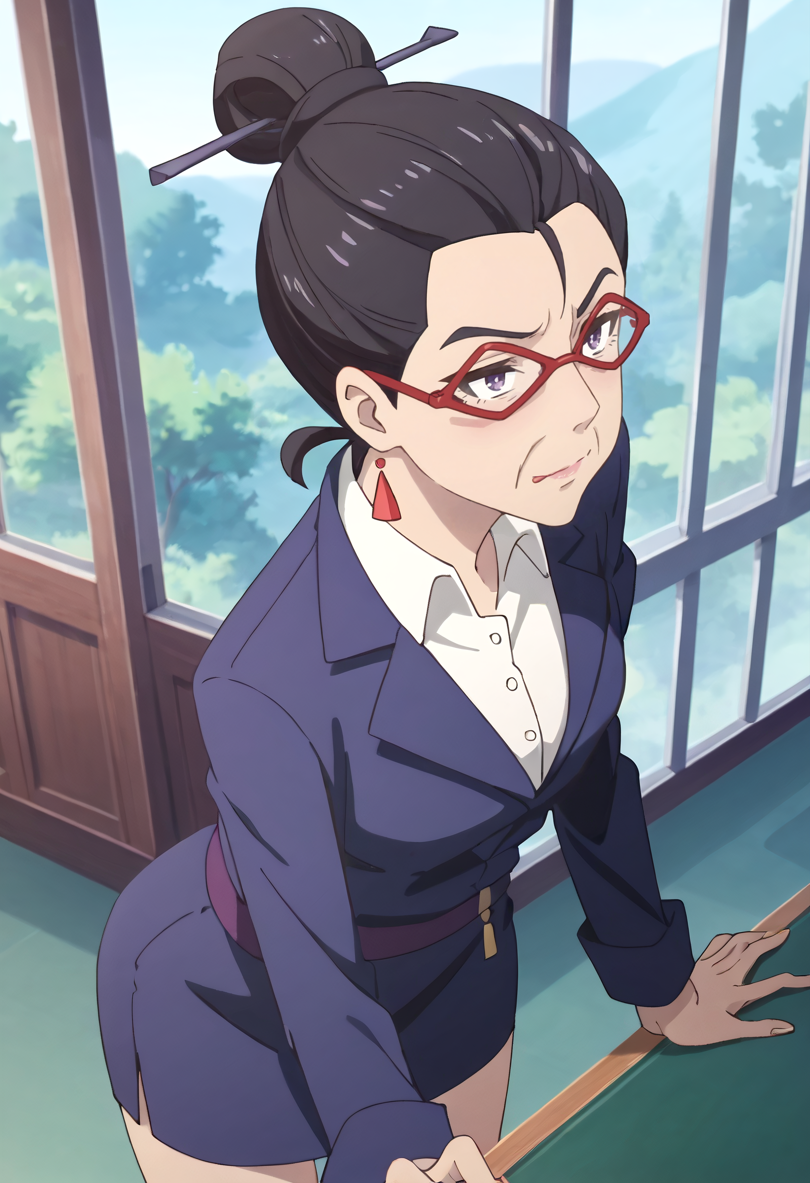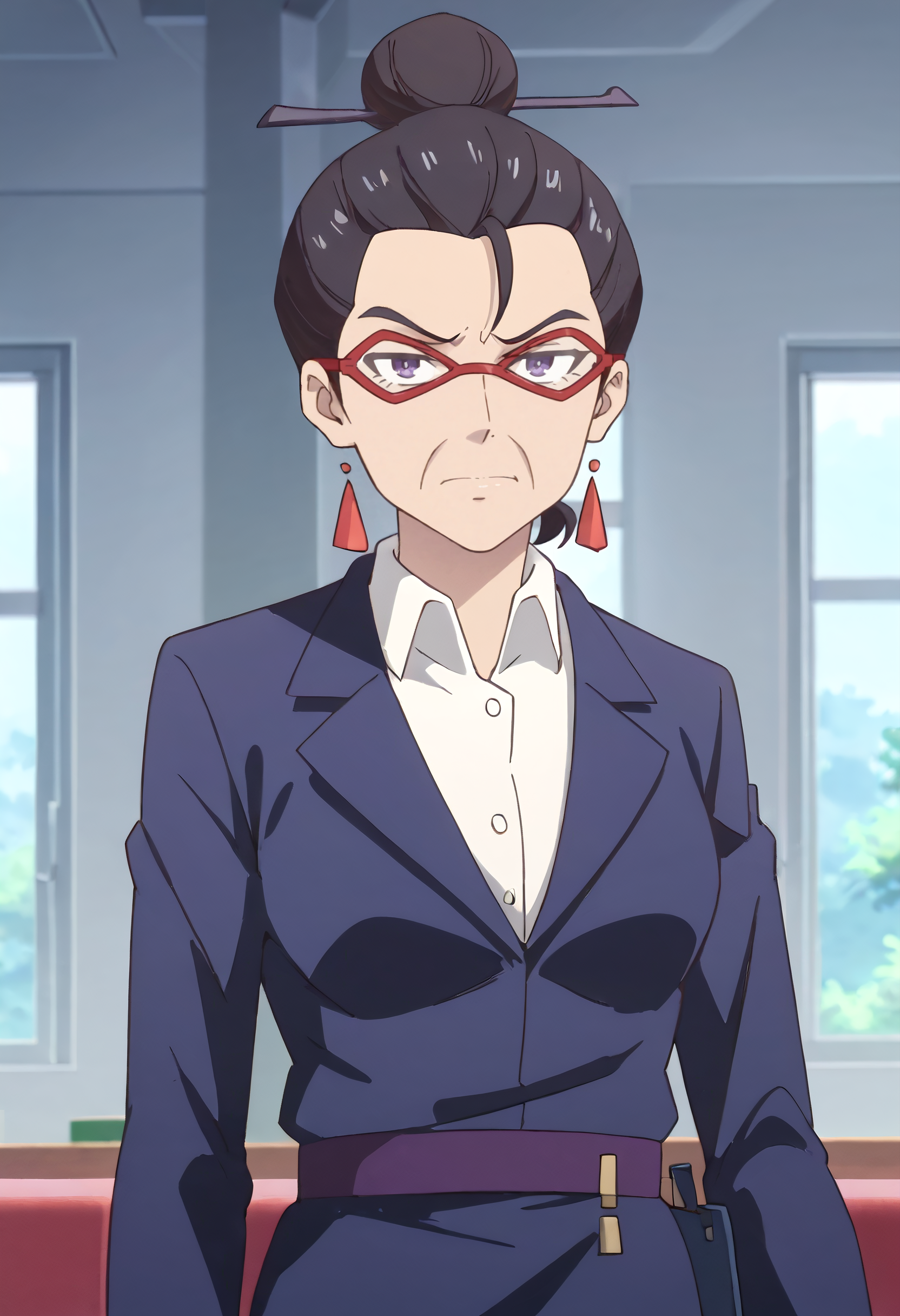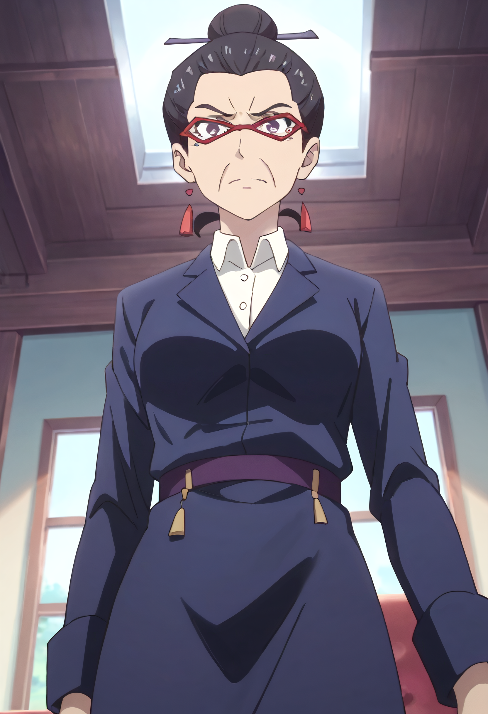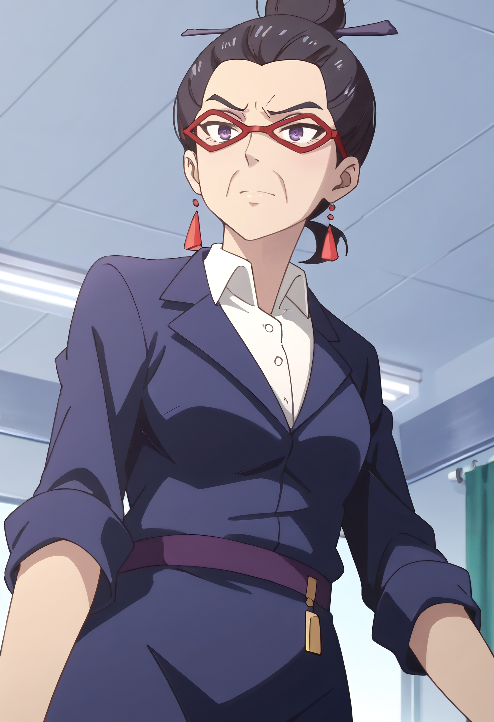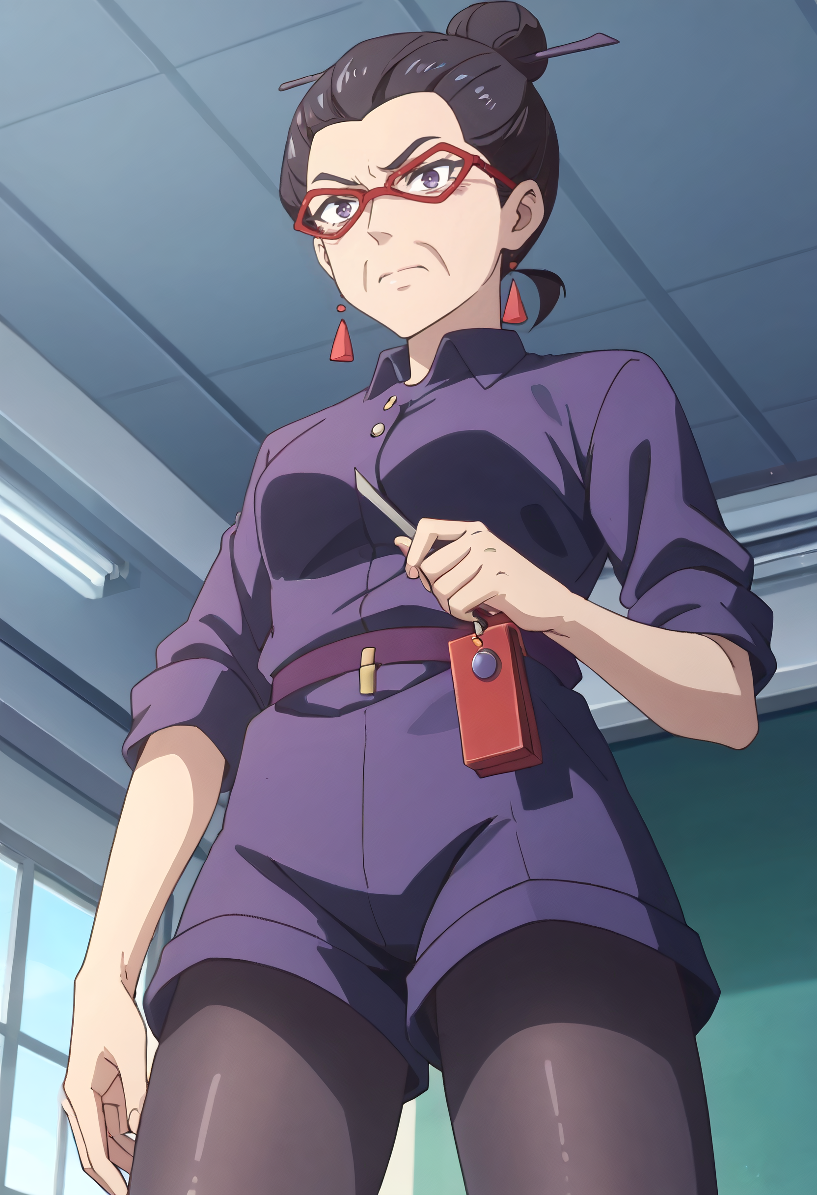 TDLPan, black hair, hair bun, short hair, long hair, purple eyes, glasses, red-framed eyewear, semi-rimless eyewear, under-rim eyewear,