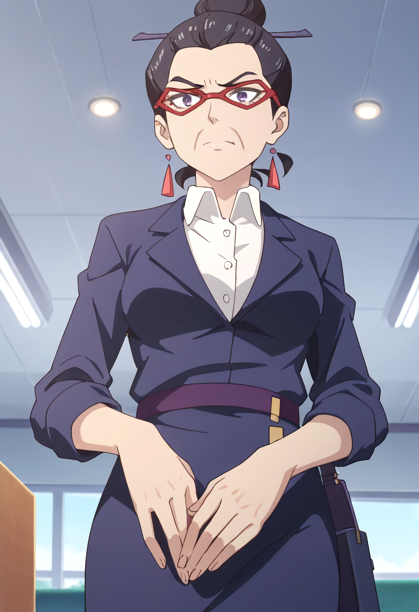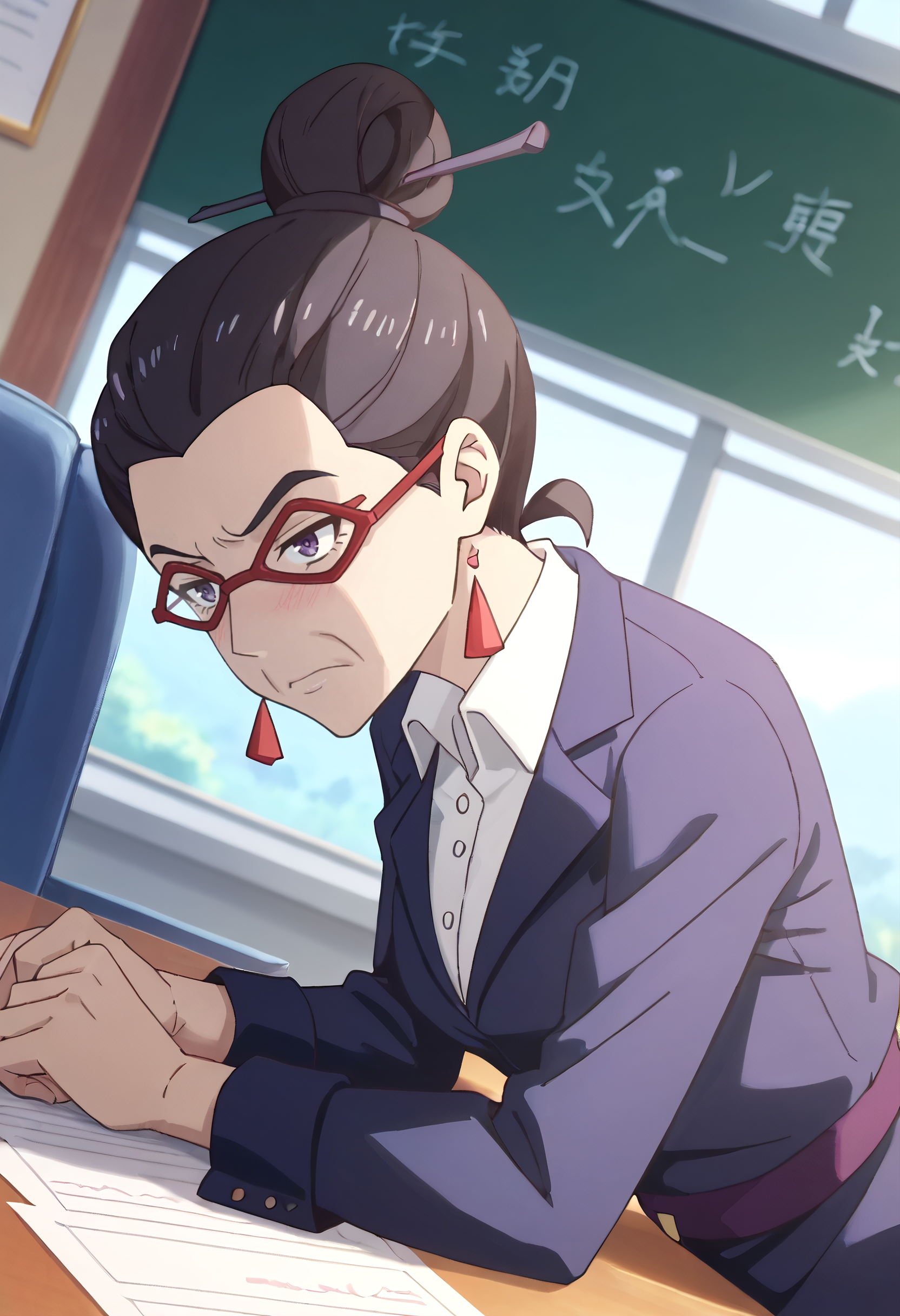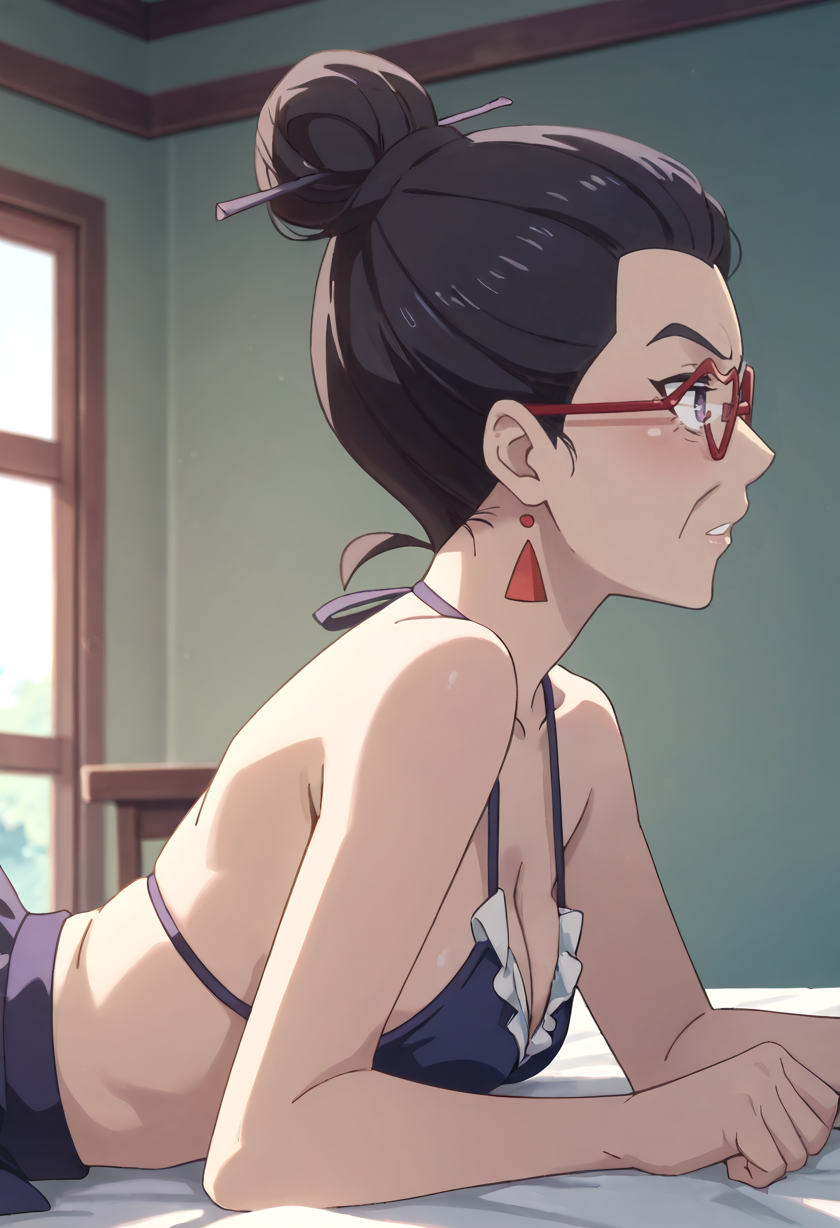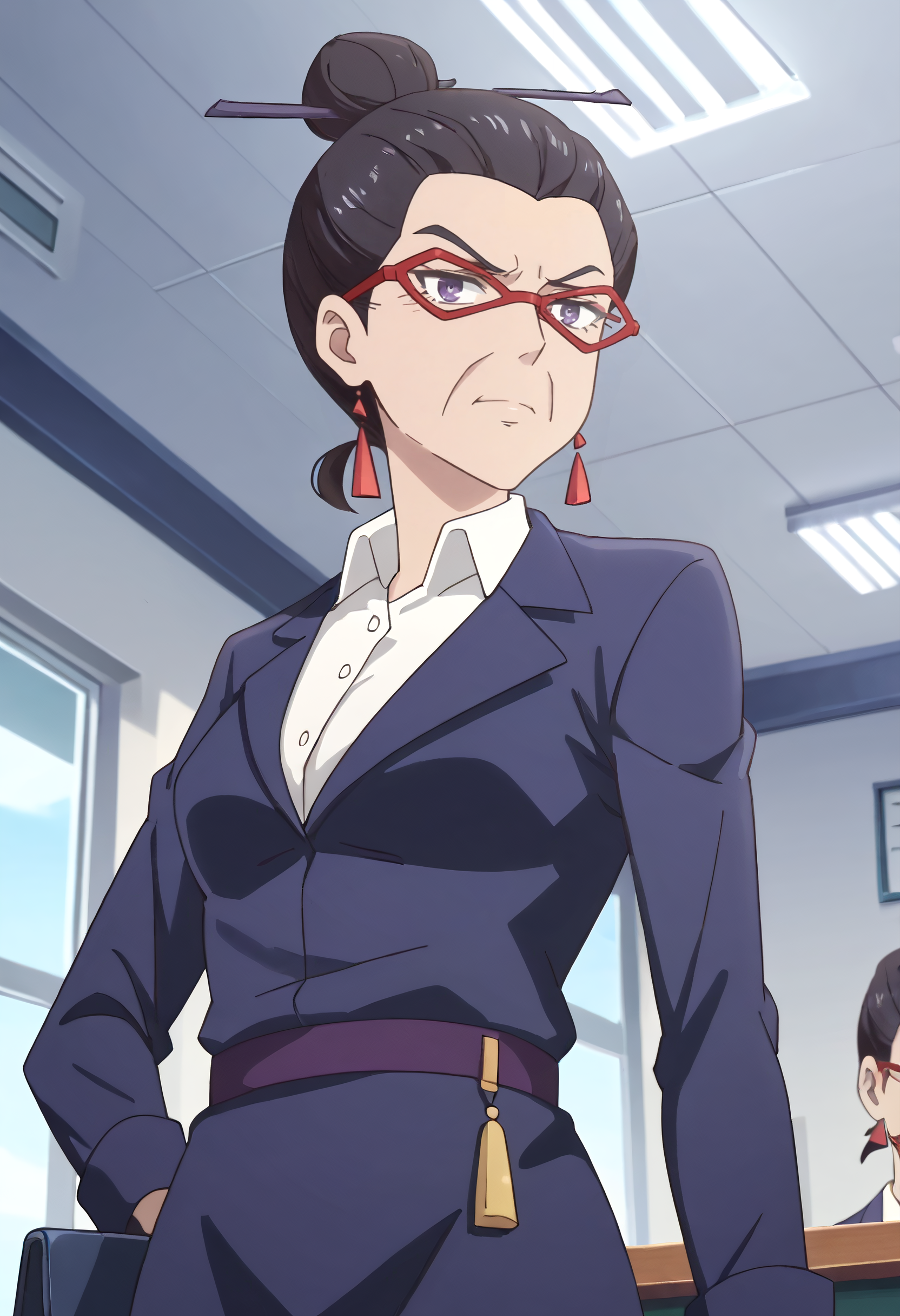 TDLPan, black hair, hair bun, short hair, long hair, purple eyes, glasses, red-framed eyewear, semi-rimless eyewear, under-rim eyewear,