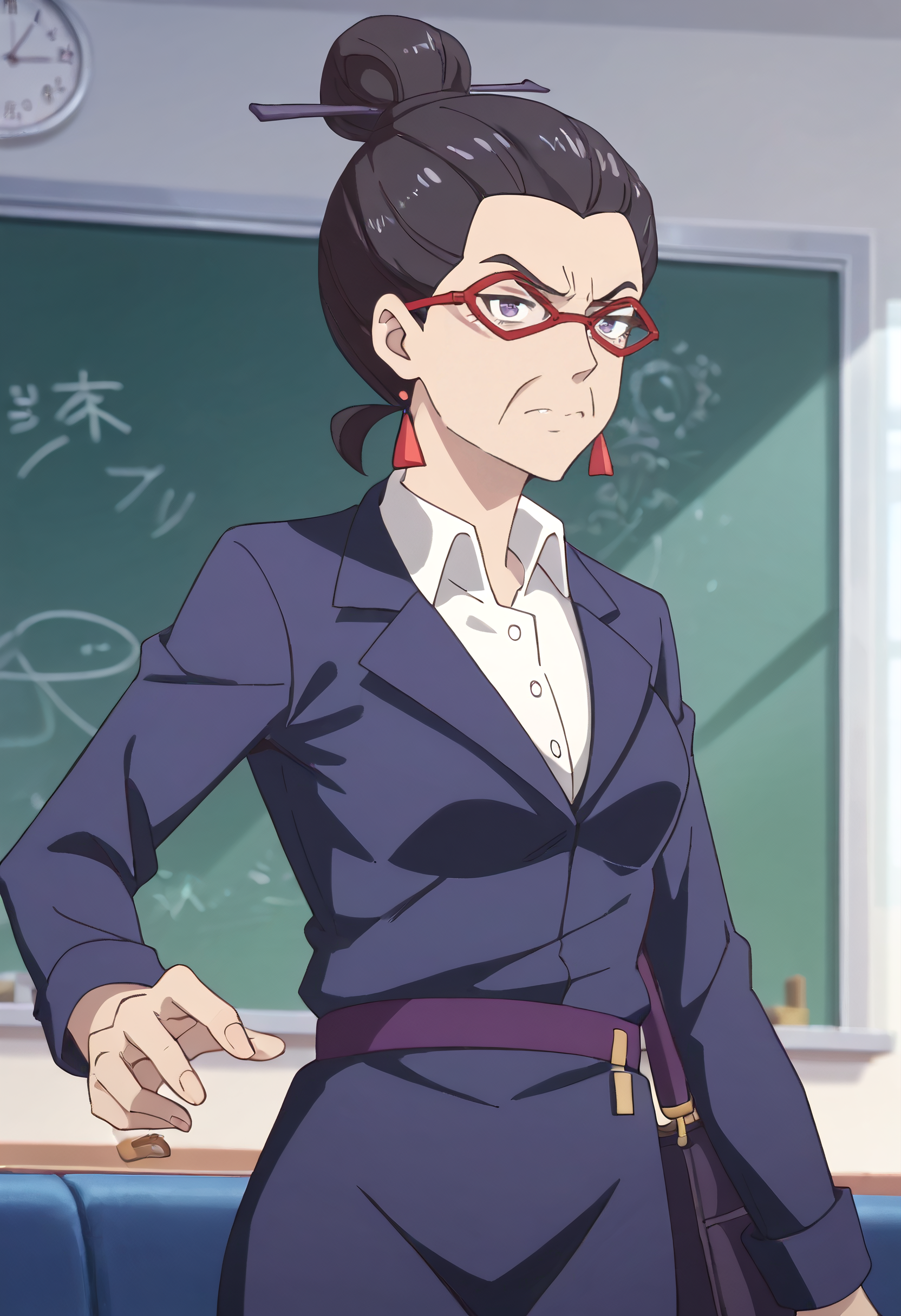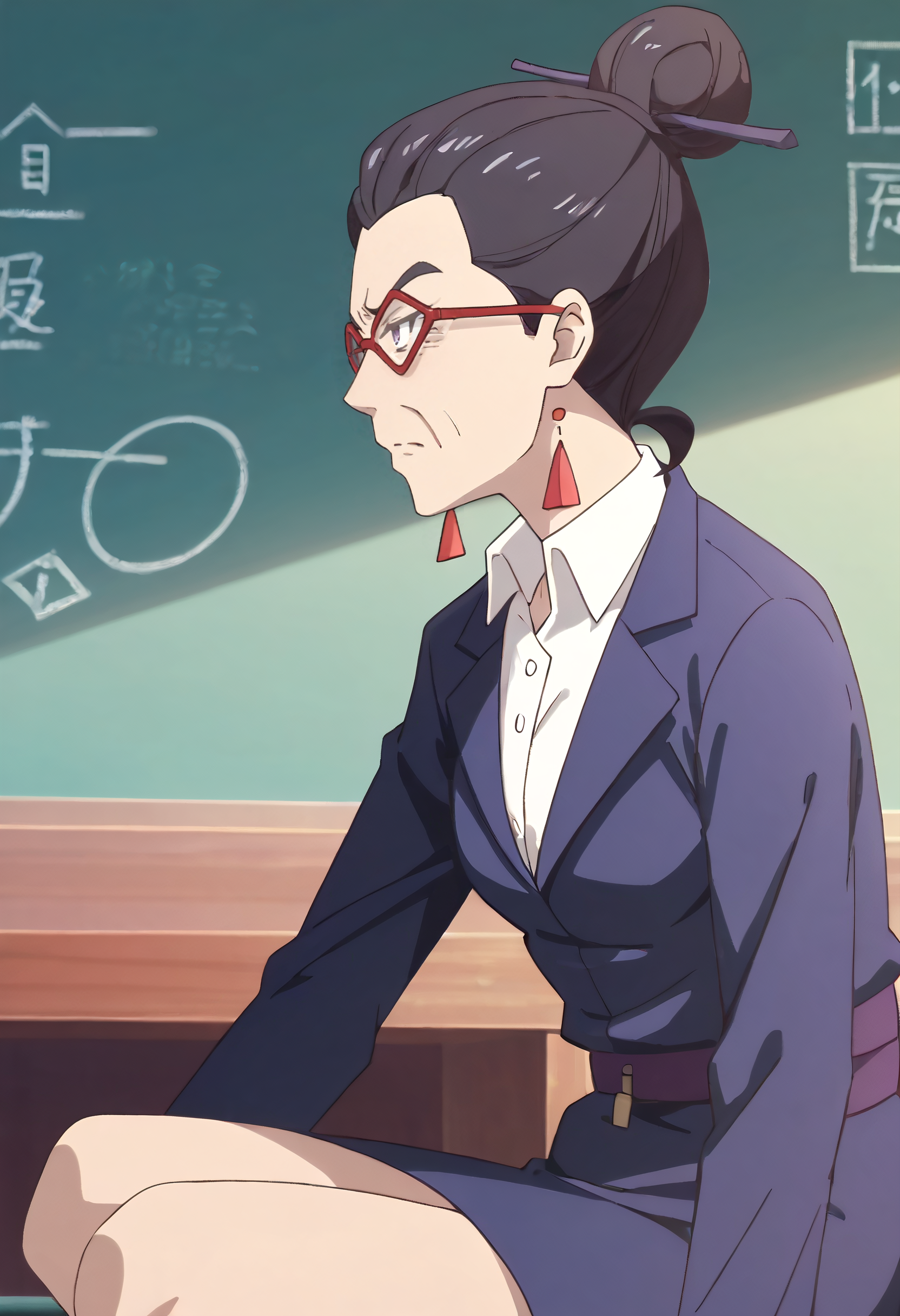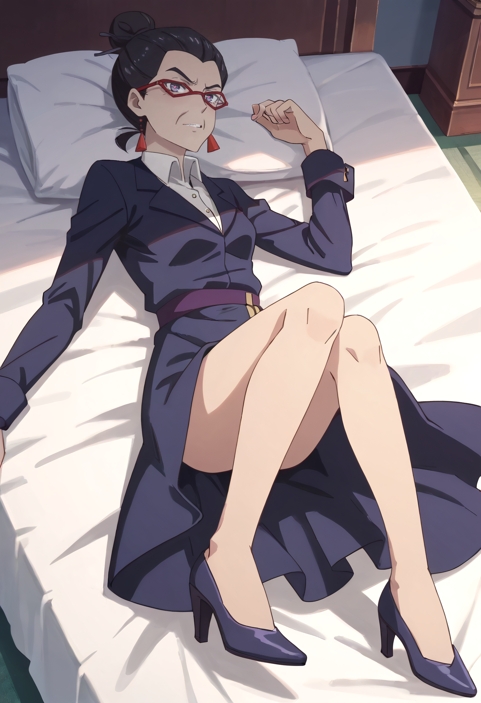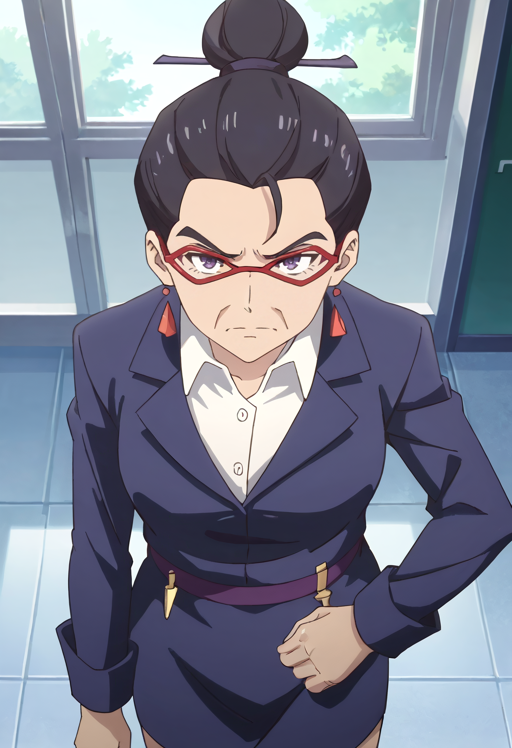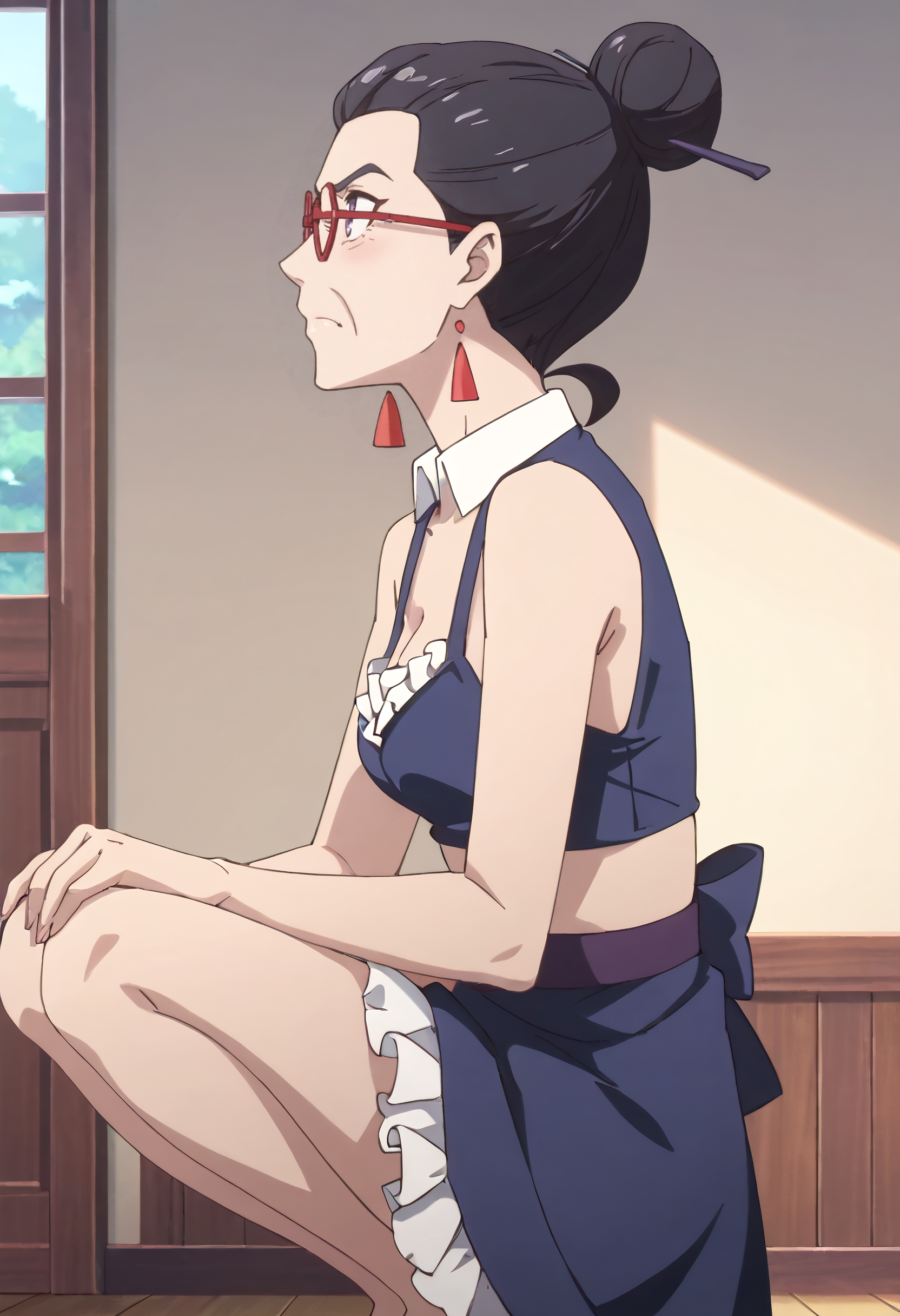 TDLPan, black hair, hair bun, short hair, long hair, purple eyes, glasses, red-framed eyewear, semi-rimless eyewear, under-rim eyewear,