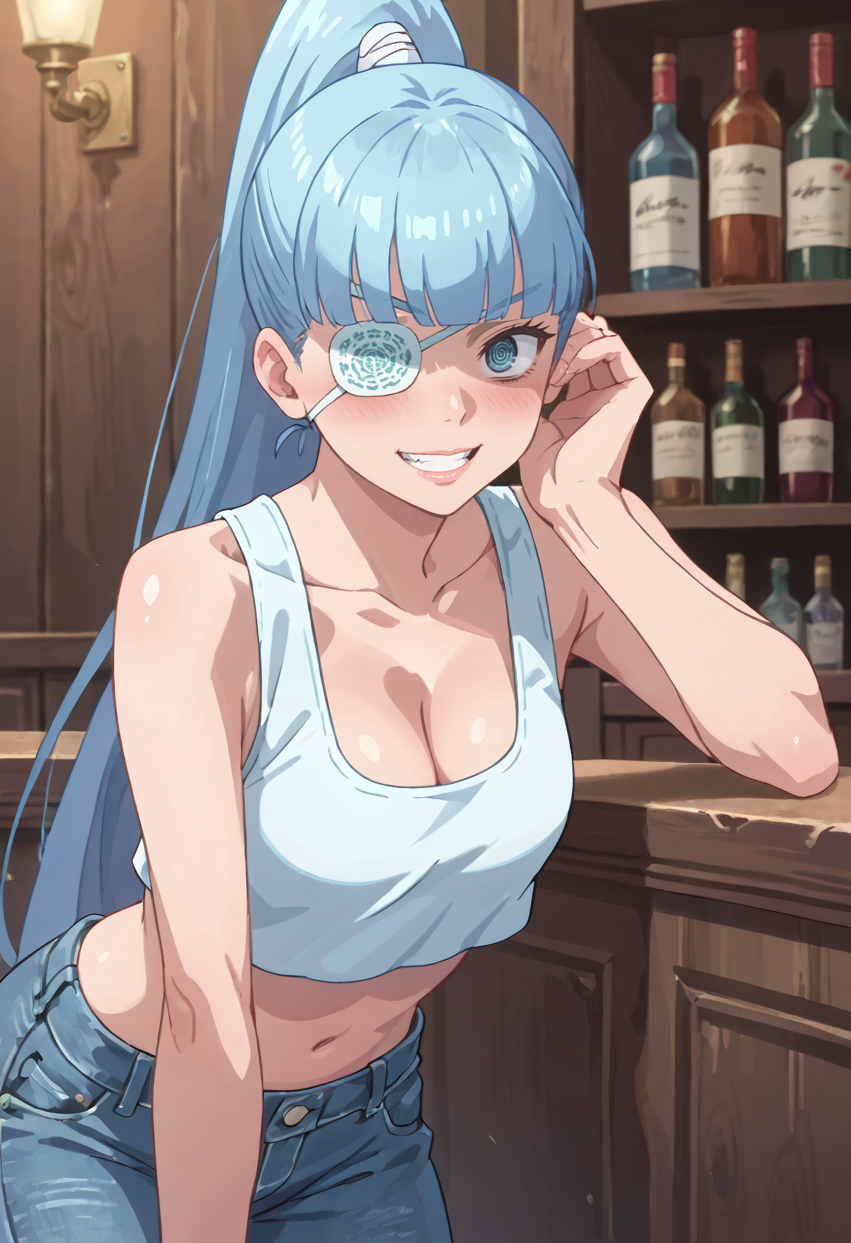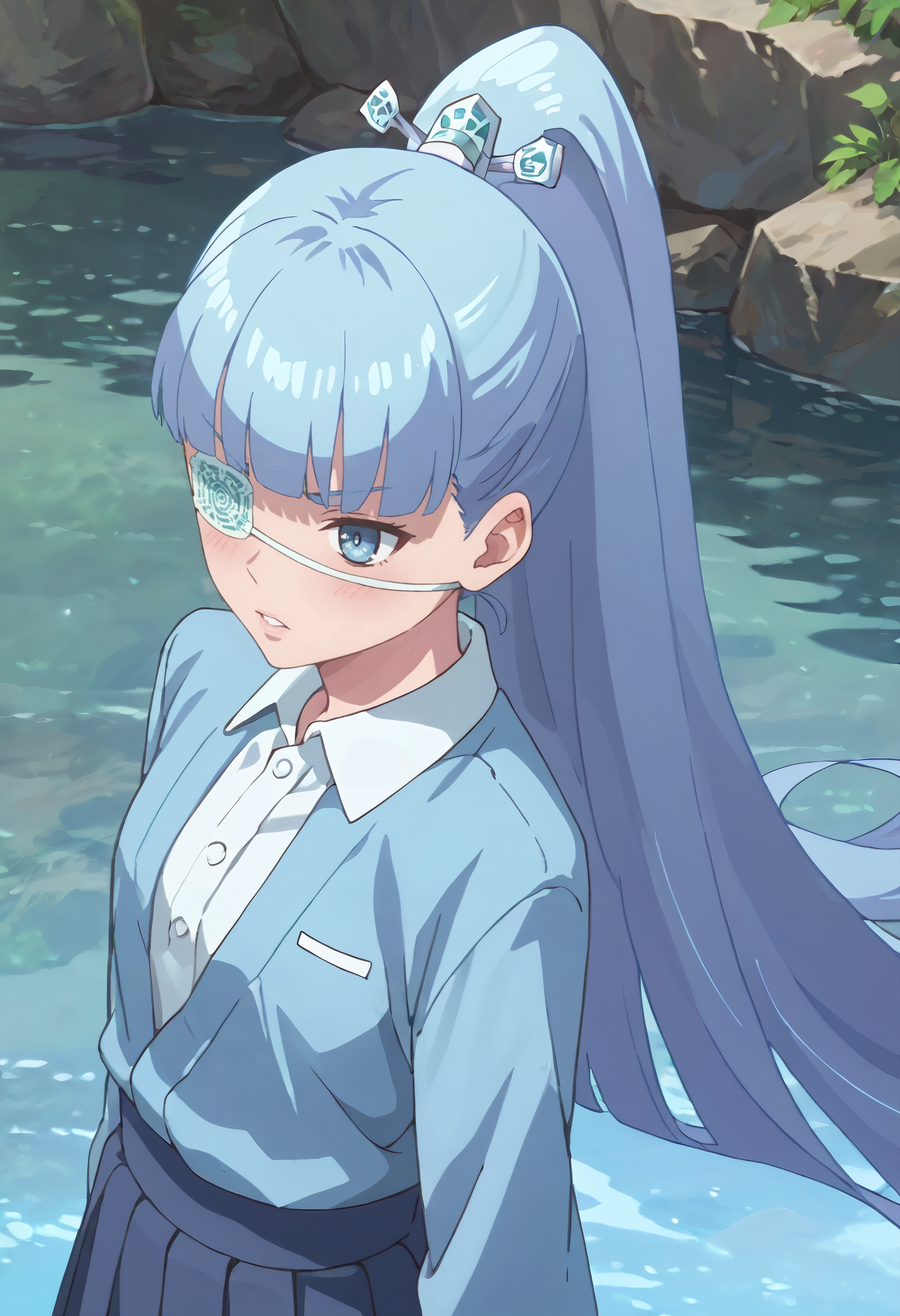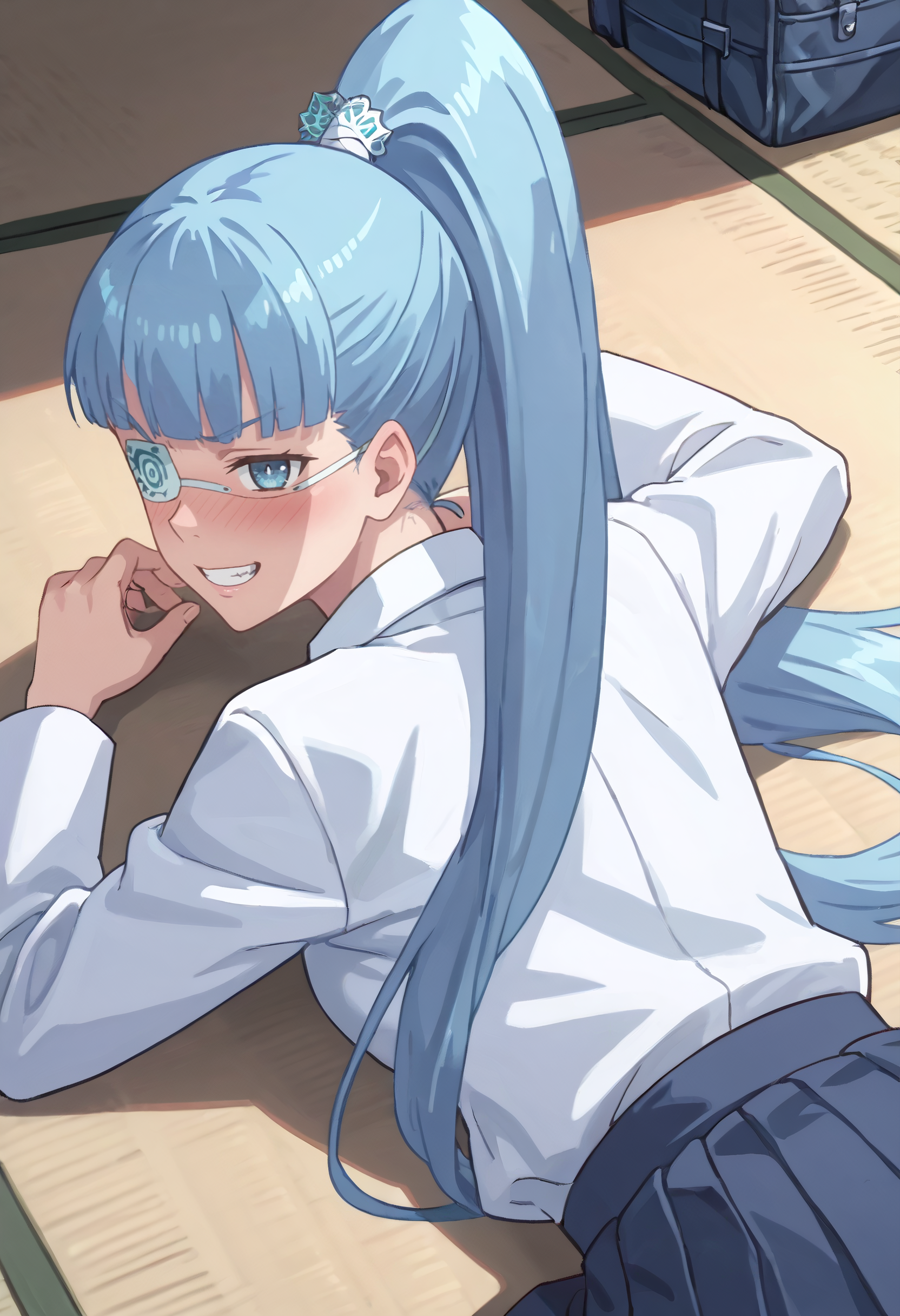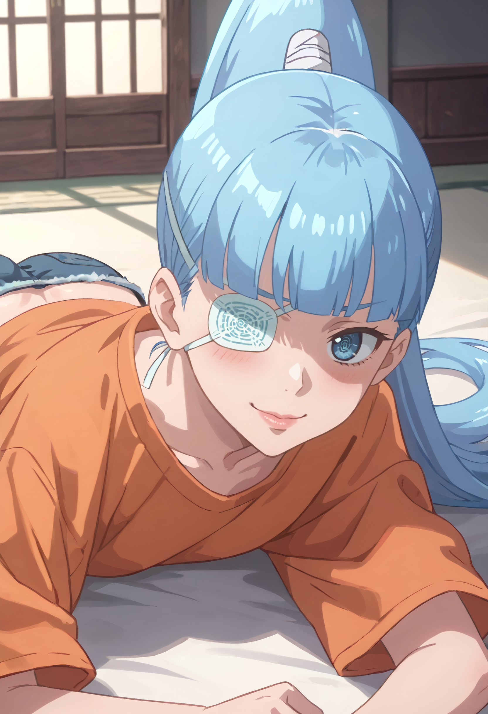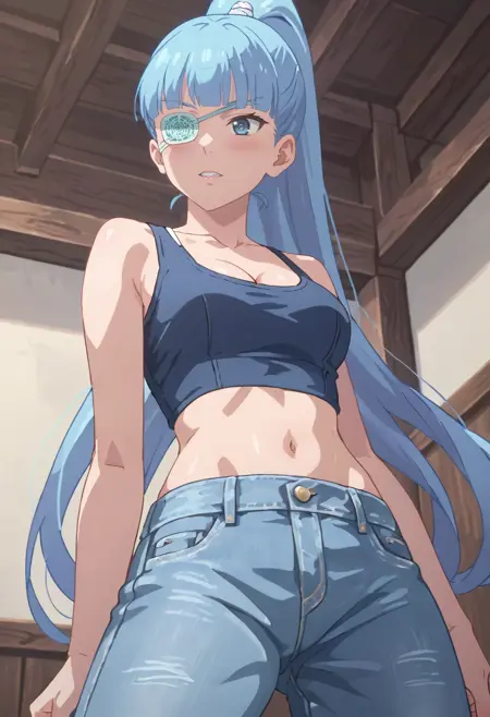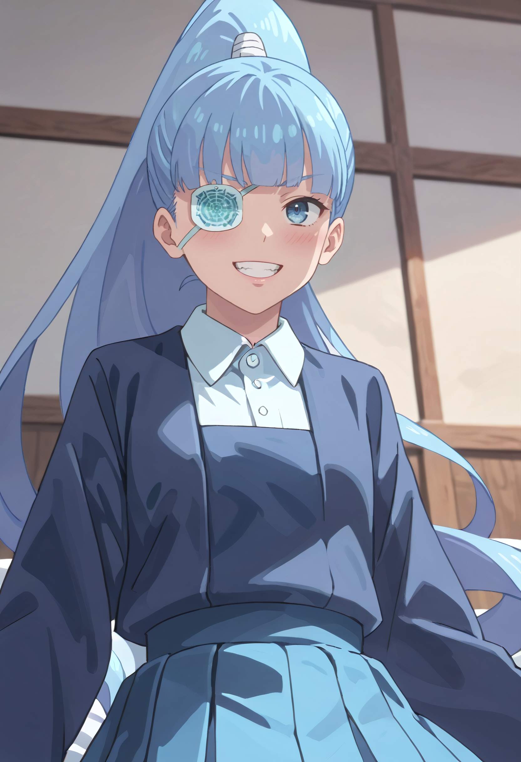 TDLSeaSword, long hair, bangs, blunt bangs, blue hair, ponytail, blue eyes, very long hair, eyepatch,