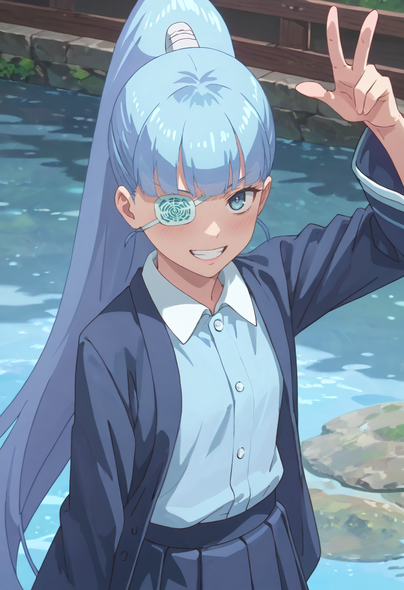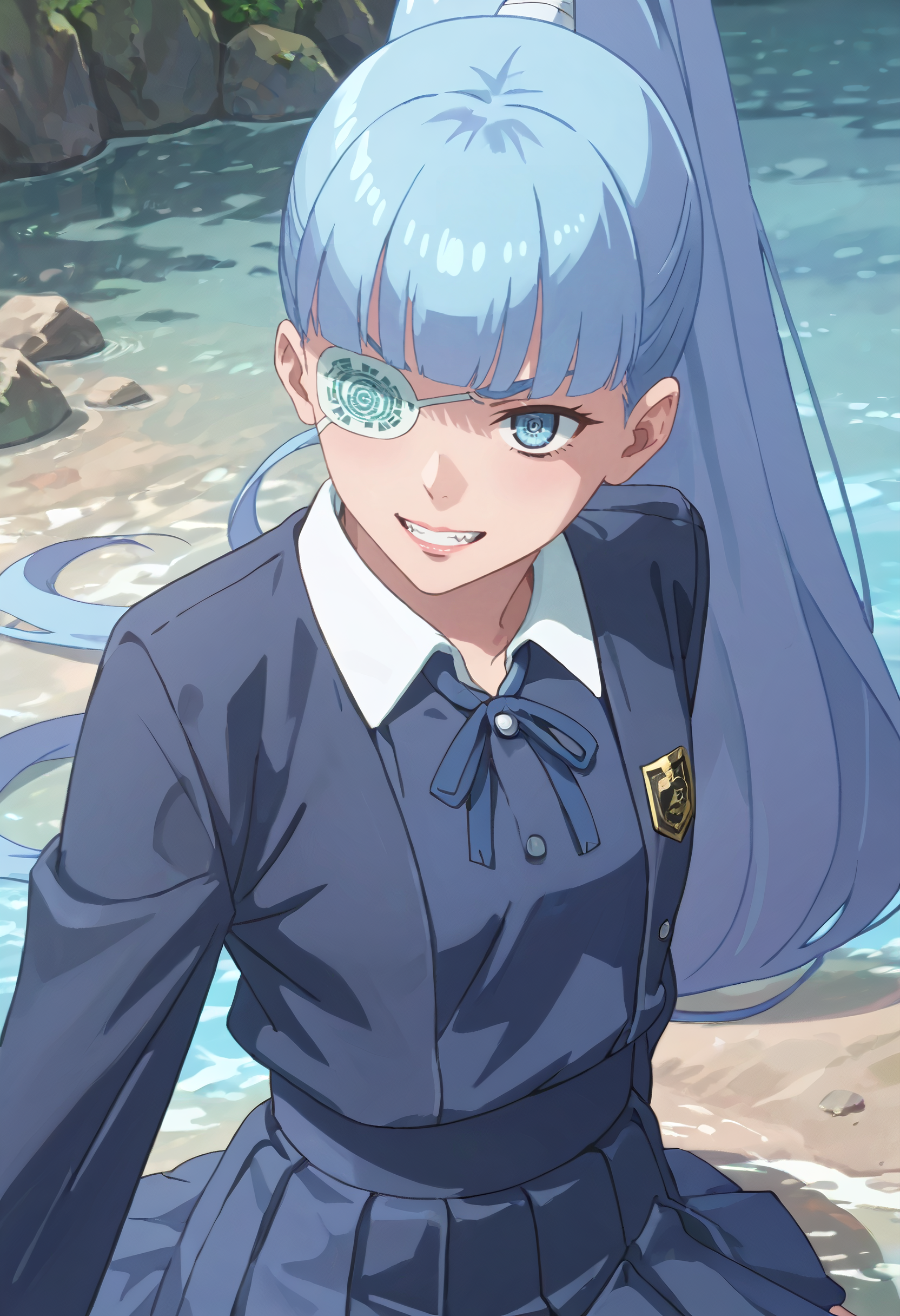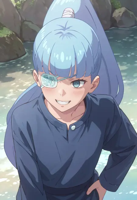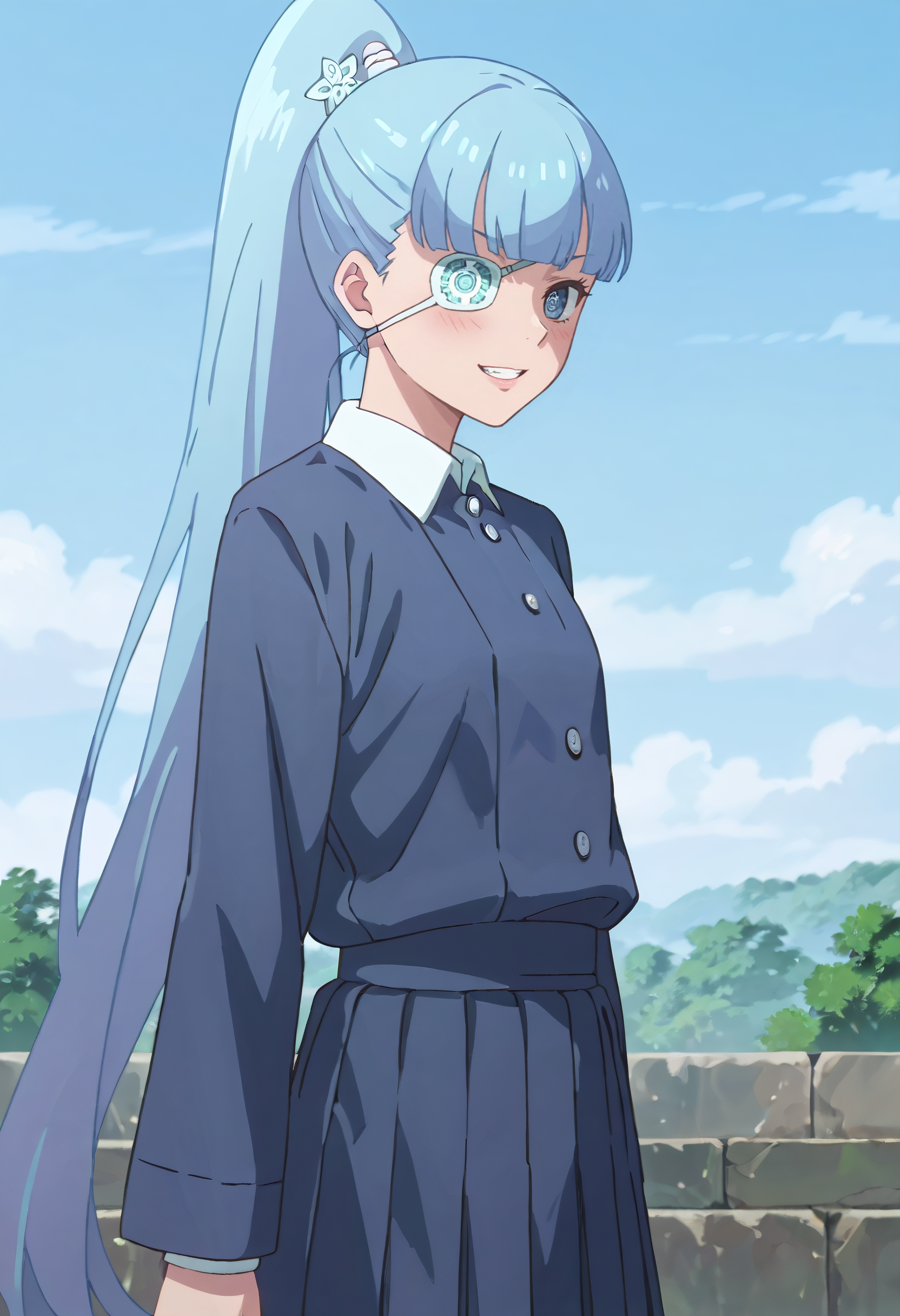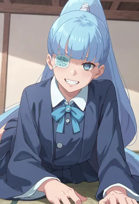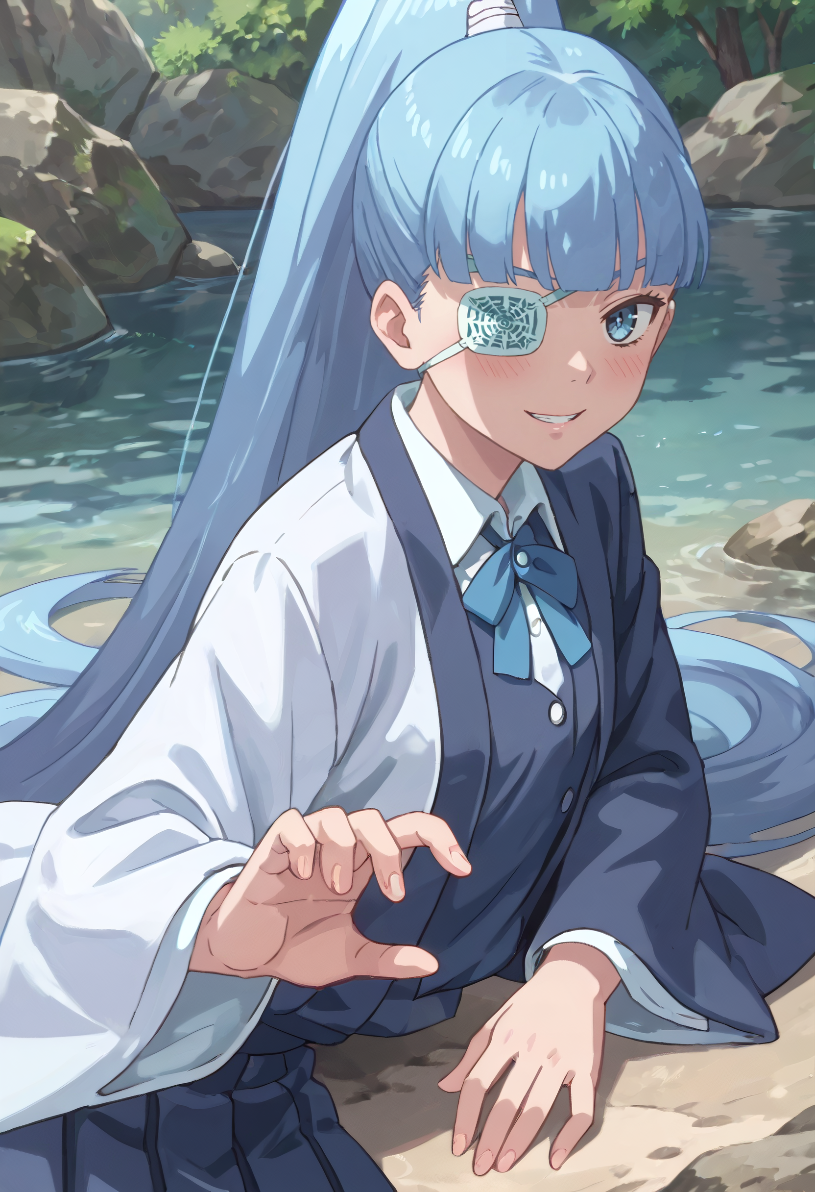 TDLSeaSword, long hair, bangs, blunt bangs, blue hair, ponytail, blue eyes, very long hair, eyepatch,