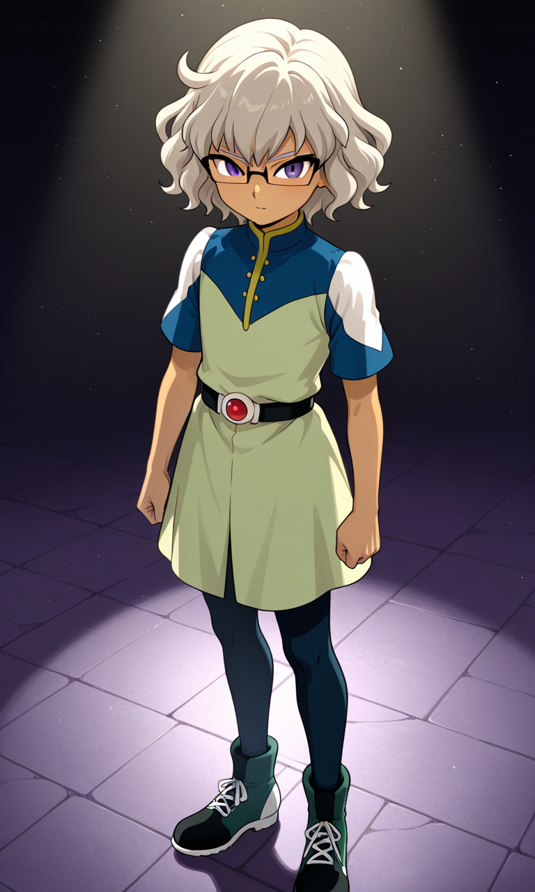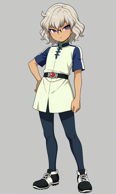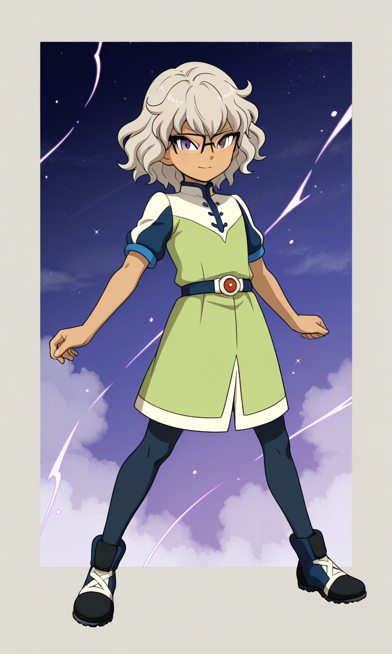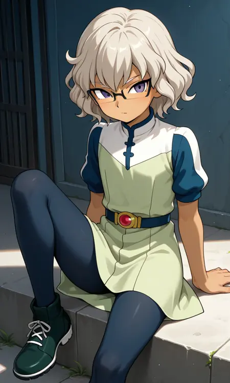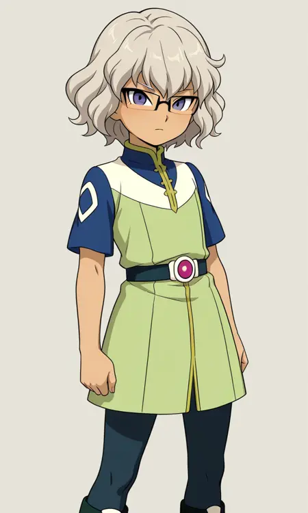 기리스(Inazuma Eleven), 곱슬머리, 중간 길이 머리, 밝은 베이지색 머리, 진한 보라색 눈, 검은 프레임 안경, 평평한 가슴, 흰색 상의와 흰색 칼라가 있는 민트 그린 투닉, 짧고 진한 파란색 소매, 흰색 버클이 달린 검은 벨트, 진한 파란색 타이츠, 위쪽이 흰색인 검은 클리트, 흰색 상의