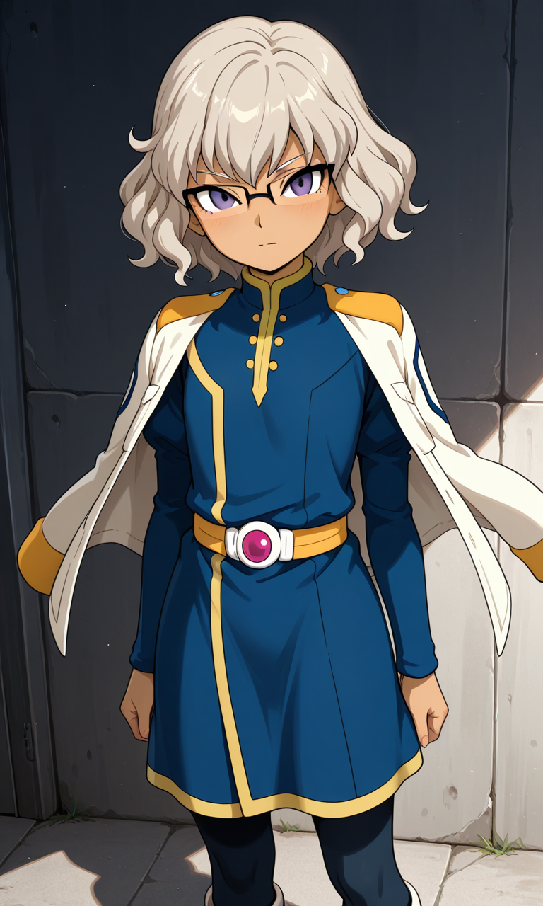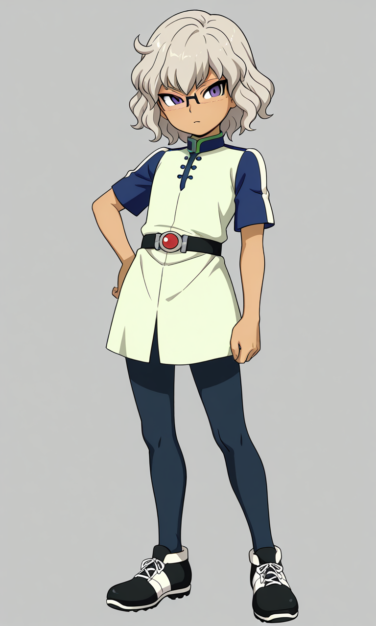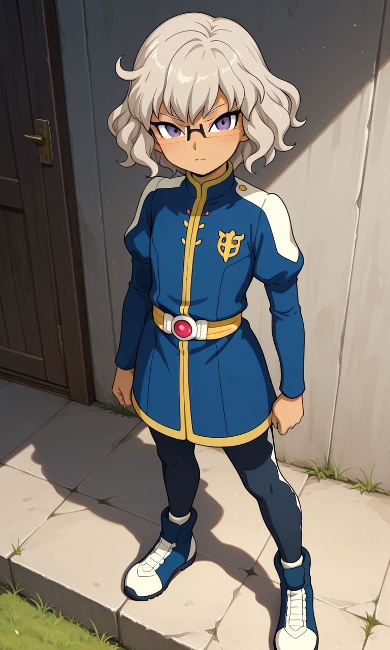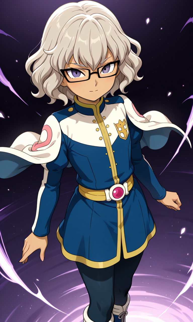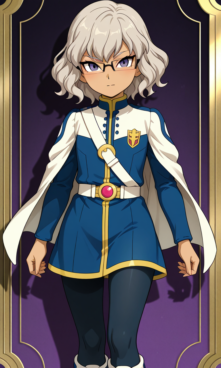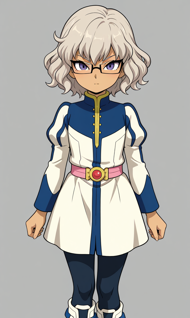 기리스(Inazuma Eleven), 곱슬머리, 중간 길이 머리, 밝은 베이지색 머리, 진한 보라색 눈, 검은 프레임 안경, 평평한 가슴, 어깨와 앞면에 흰색 패치가 있는 파란색 투닉, 중앙에 금색 줄무늬가 있고 상단에 볼륨감 있는 파란색 긴 소매, 분홍색과 금색 테두리가 있는 벨트가 투닉 중앙을 지나감, 진한 파란색, 거의 회색인 타이츠, 진한 파란색과 흰색 클리트