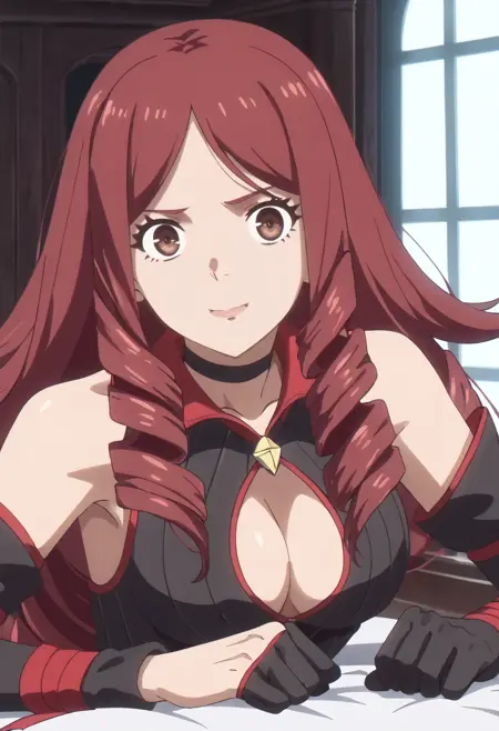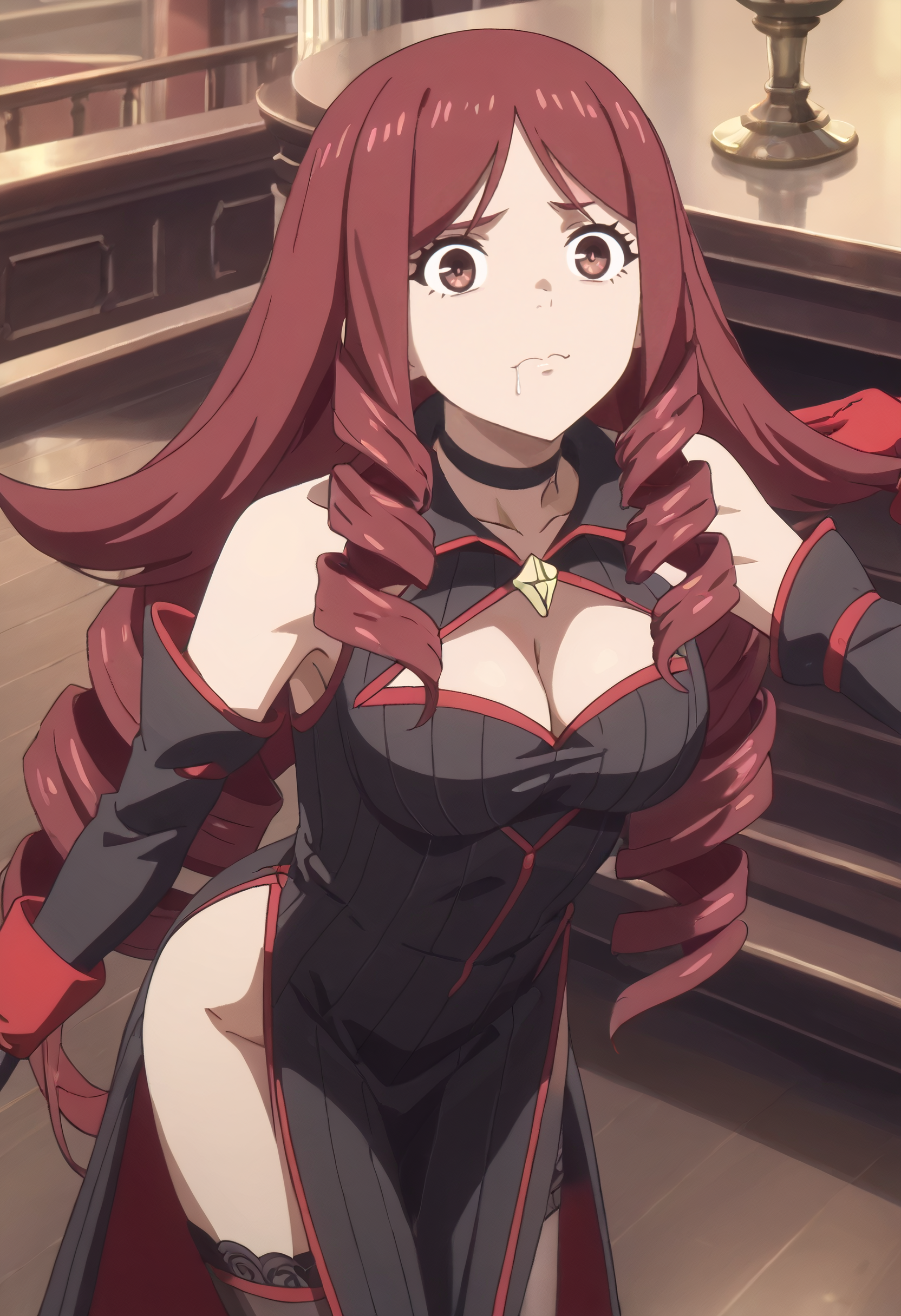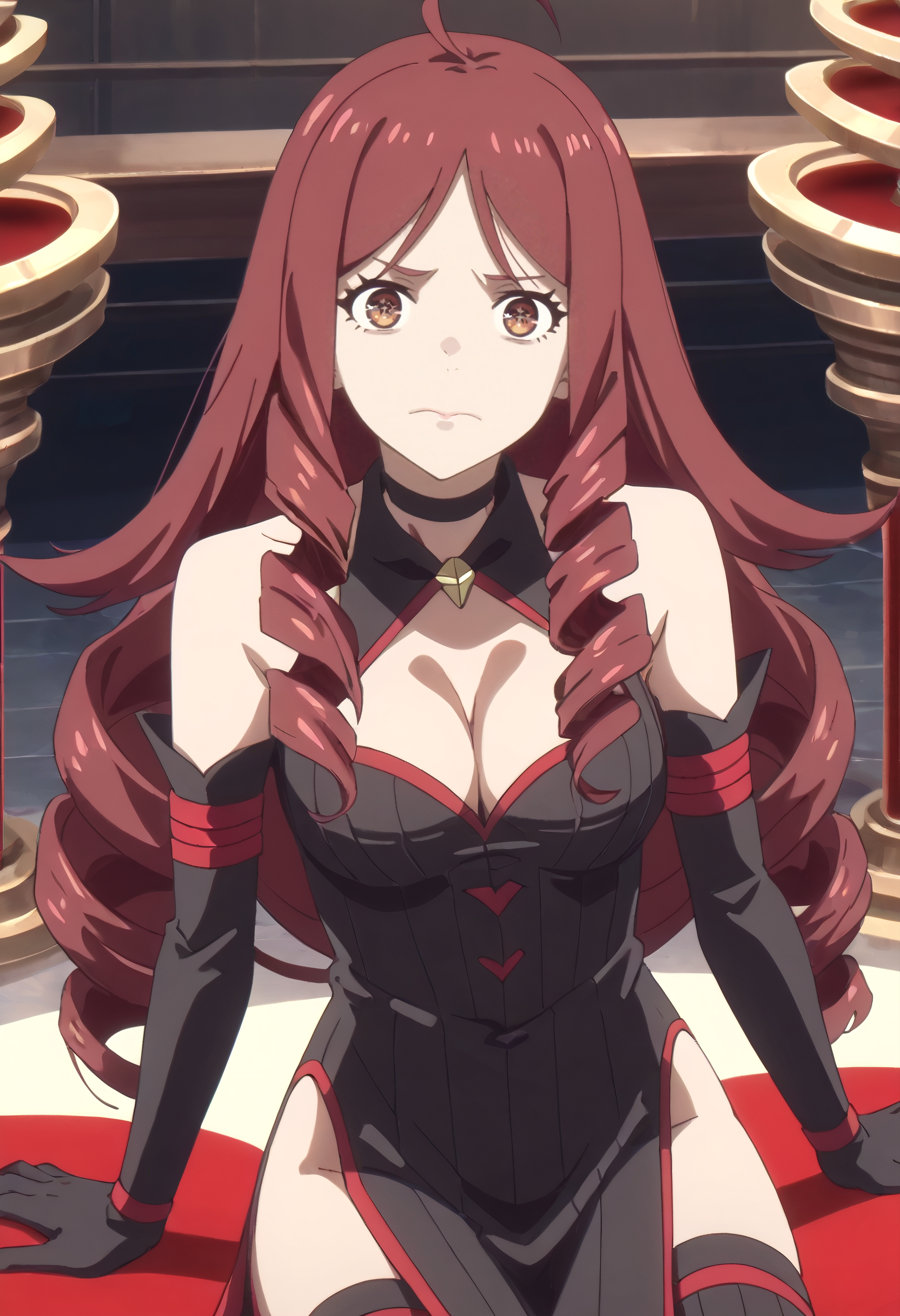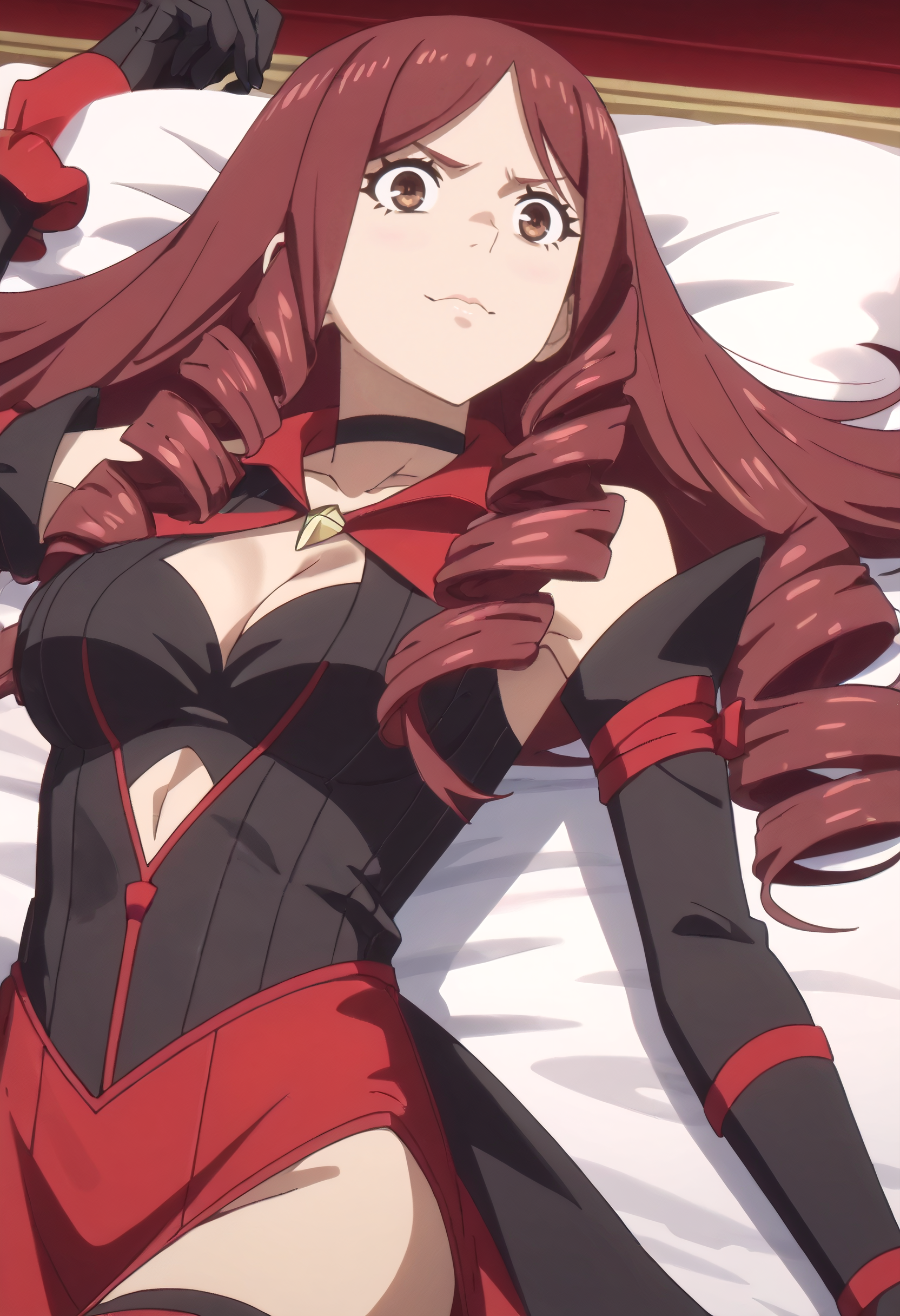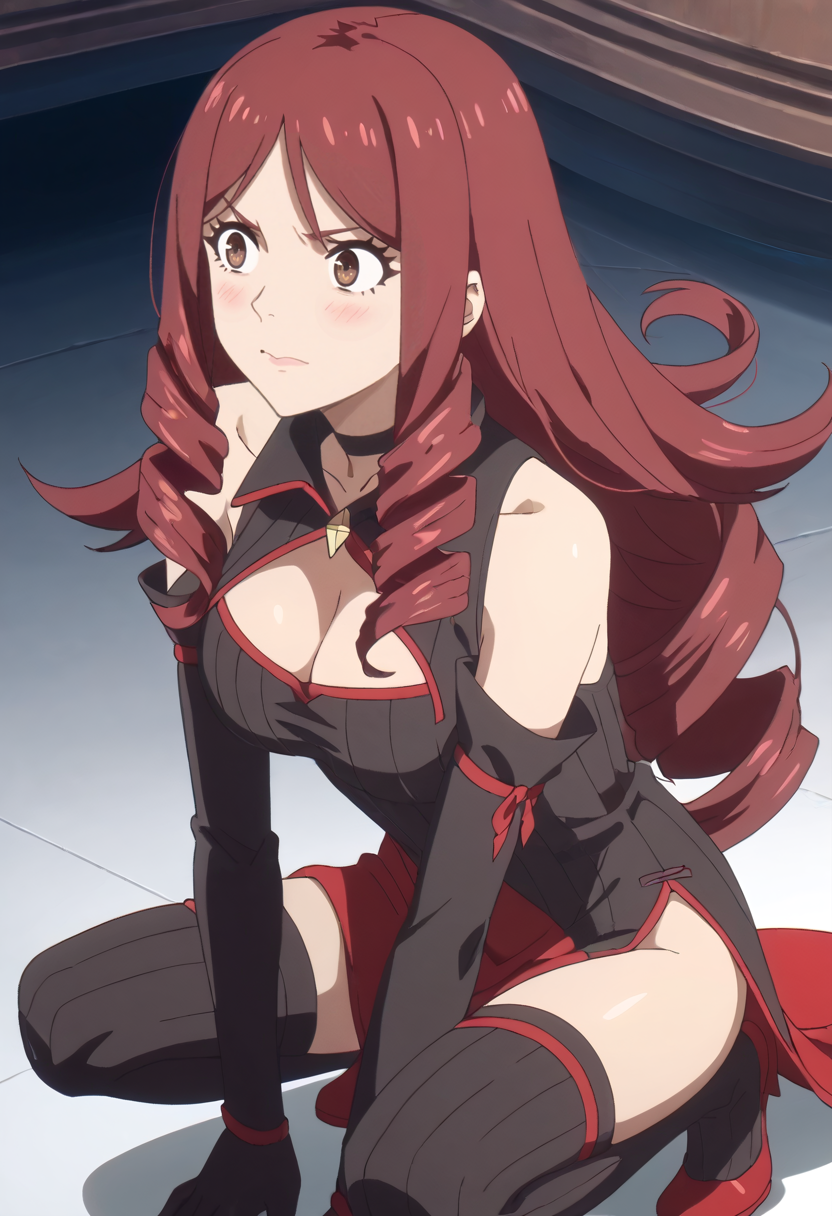 JiangCleavage, gloves, elbow gloves, choker, cleavage, bare shoulders, ringlets, detached sleeves, collarbone, dress, black choker, clothing cutout, red choker, black gloves, cleavage cutout, black sleeves, thighhighs,