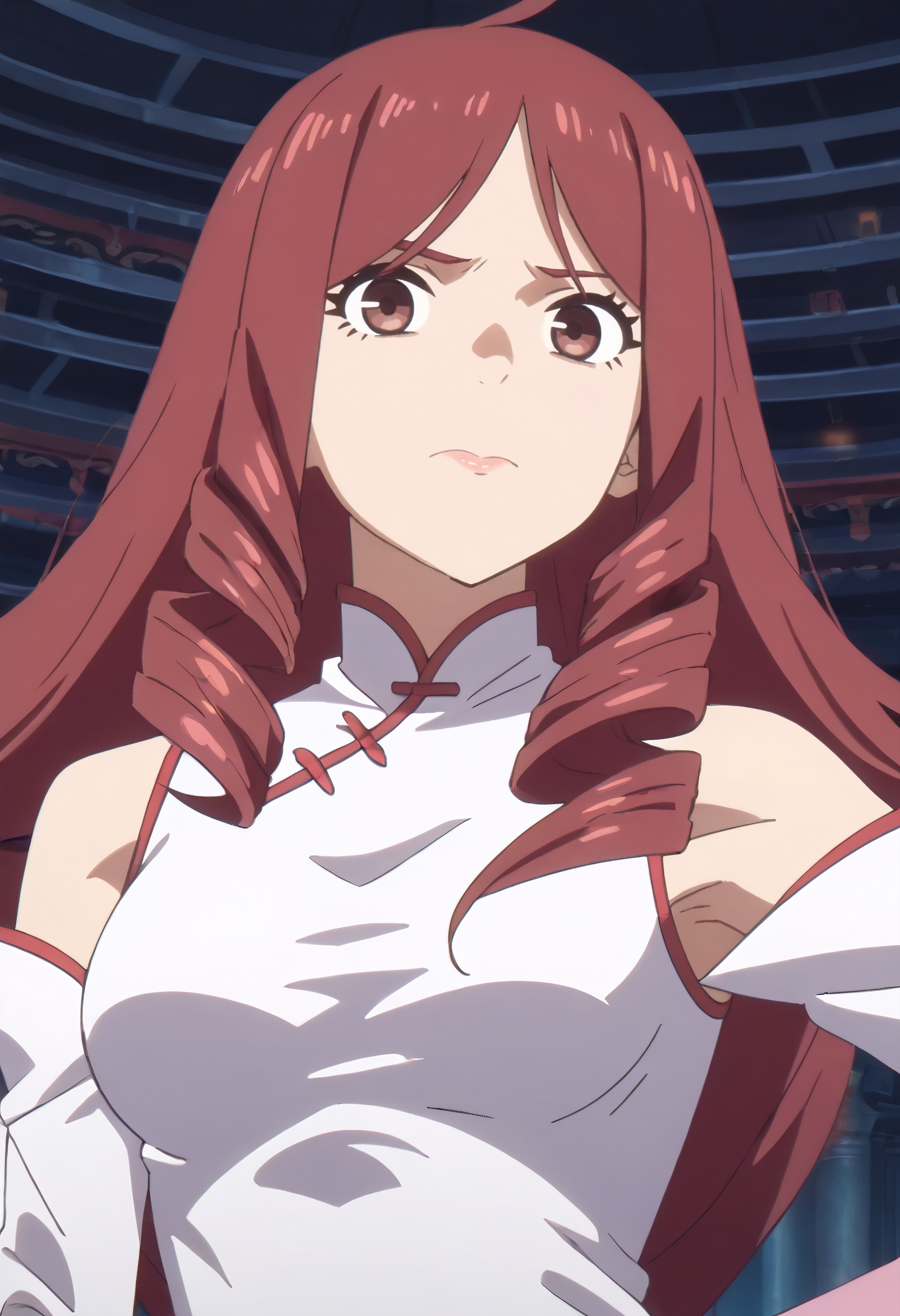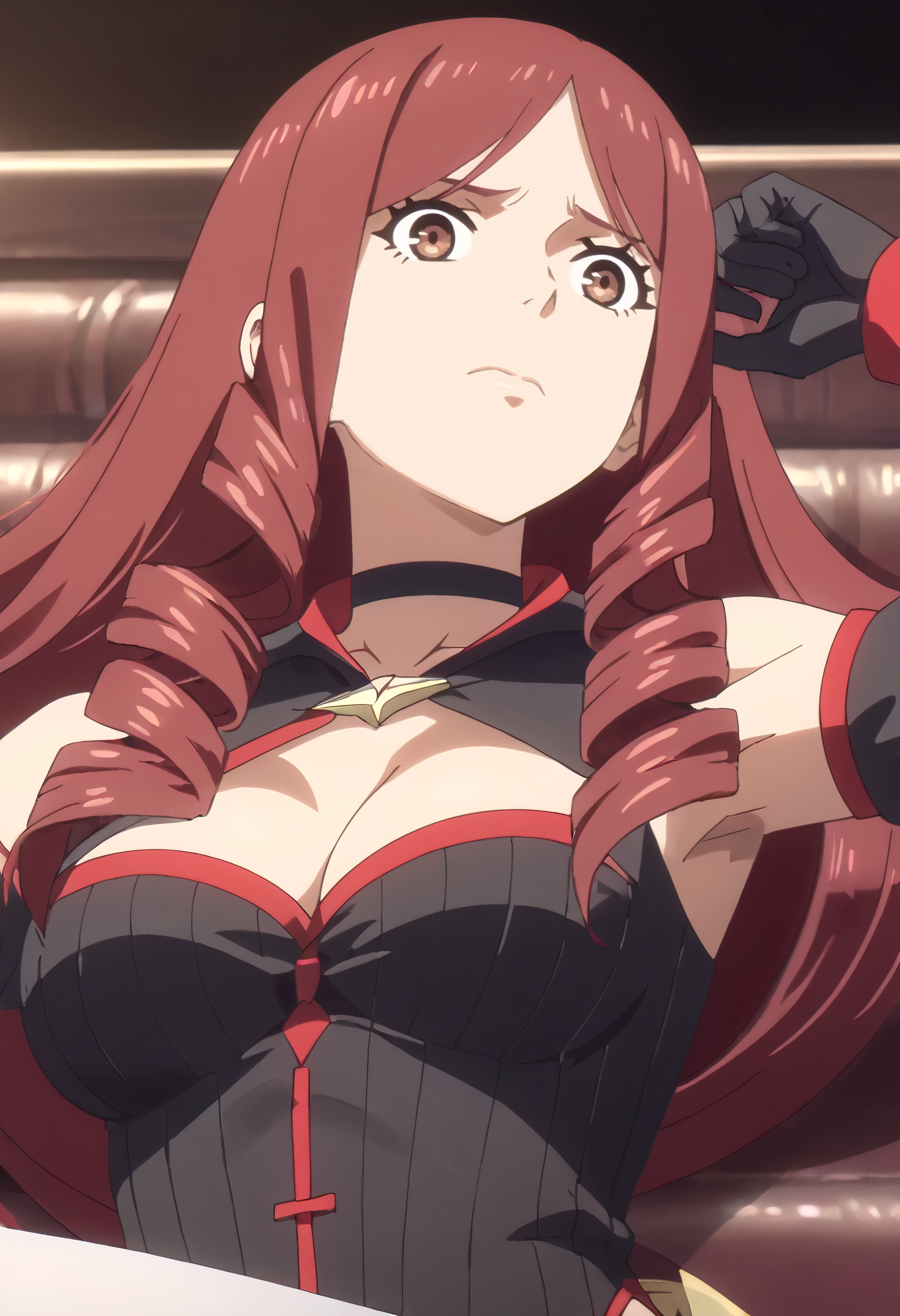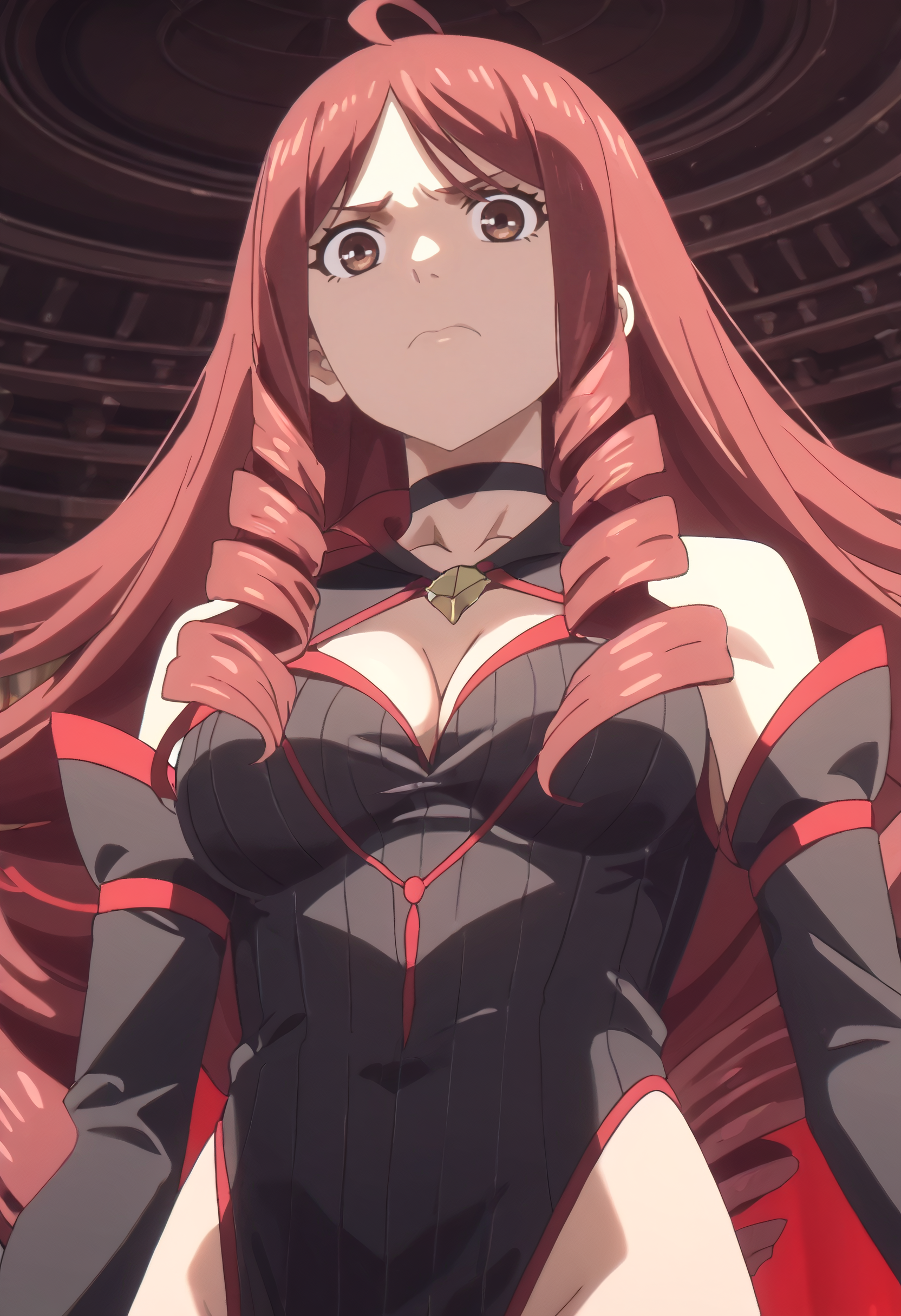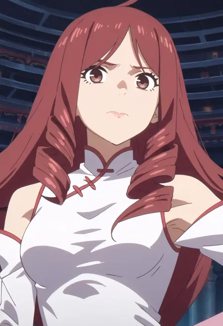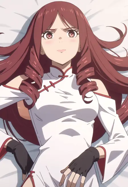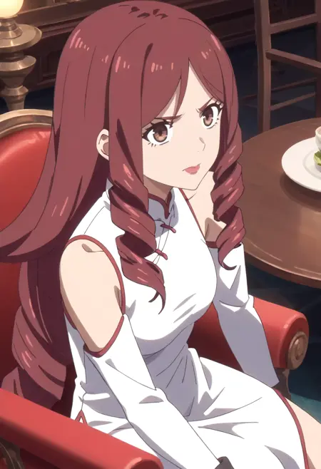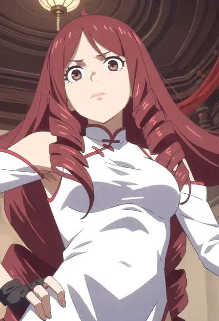 TDLJiangLiuyue, long hair, red hair, brown eyes, bangs, drill hair, hair over shoulder, twin drills,