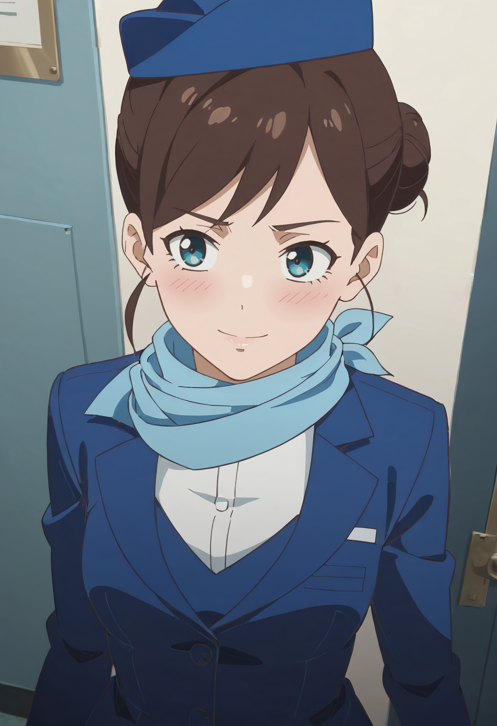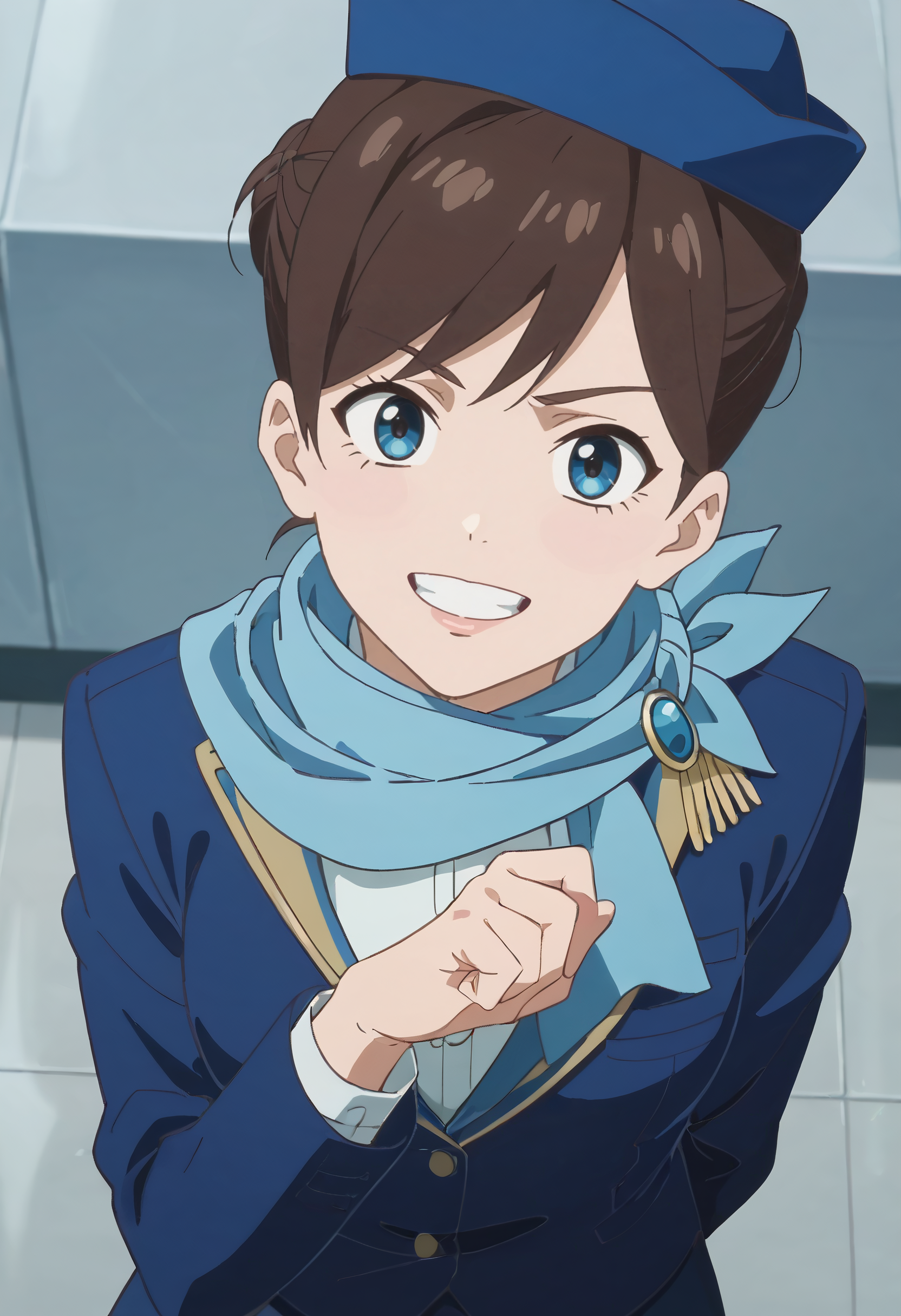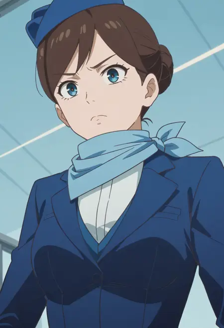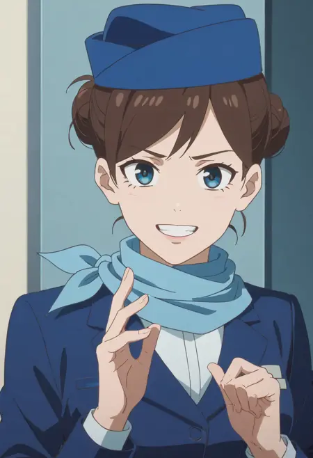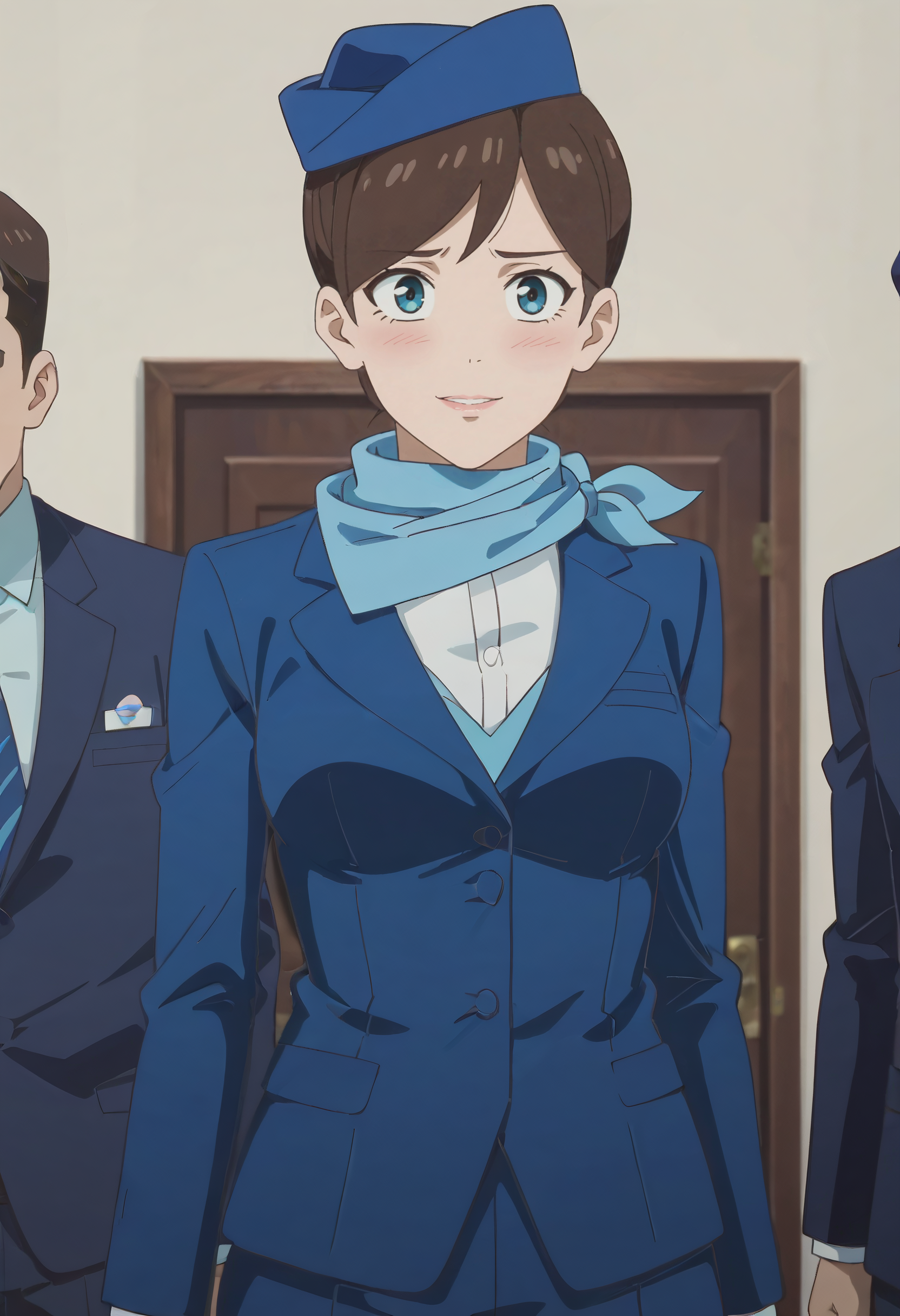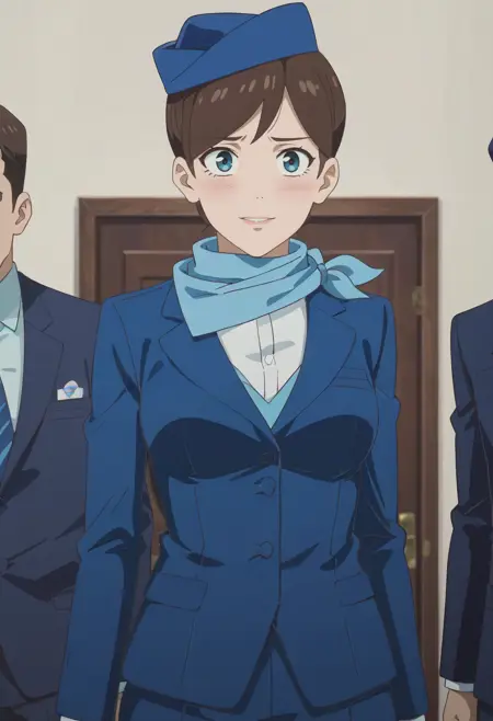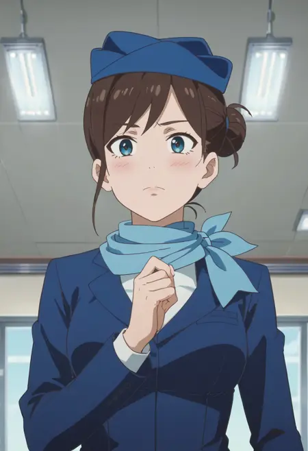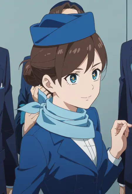 TDLFlightAttendant,短发,蓝色围巾,刘海,蓝眼睛,棕色头发,