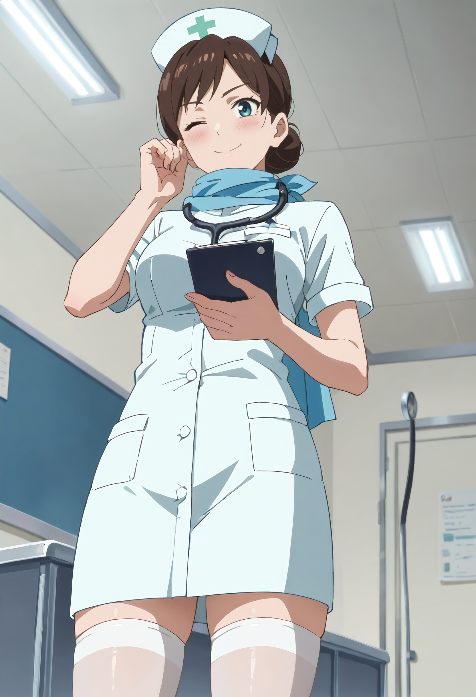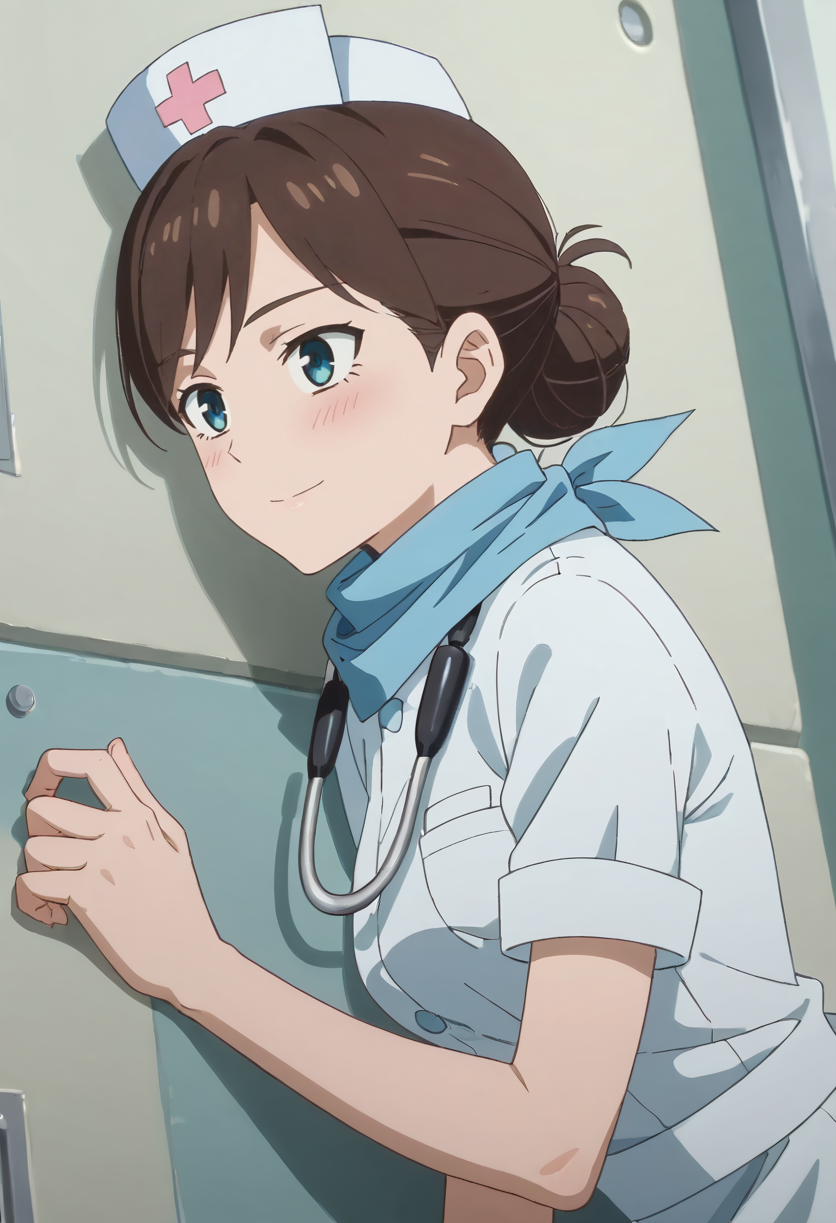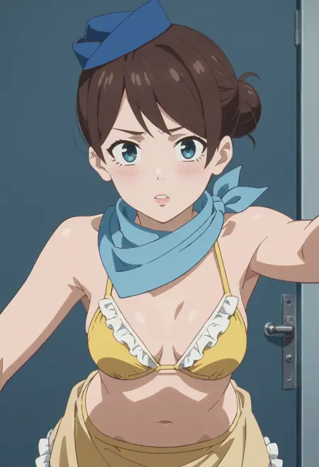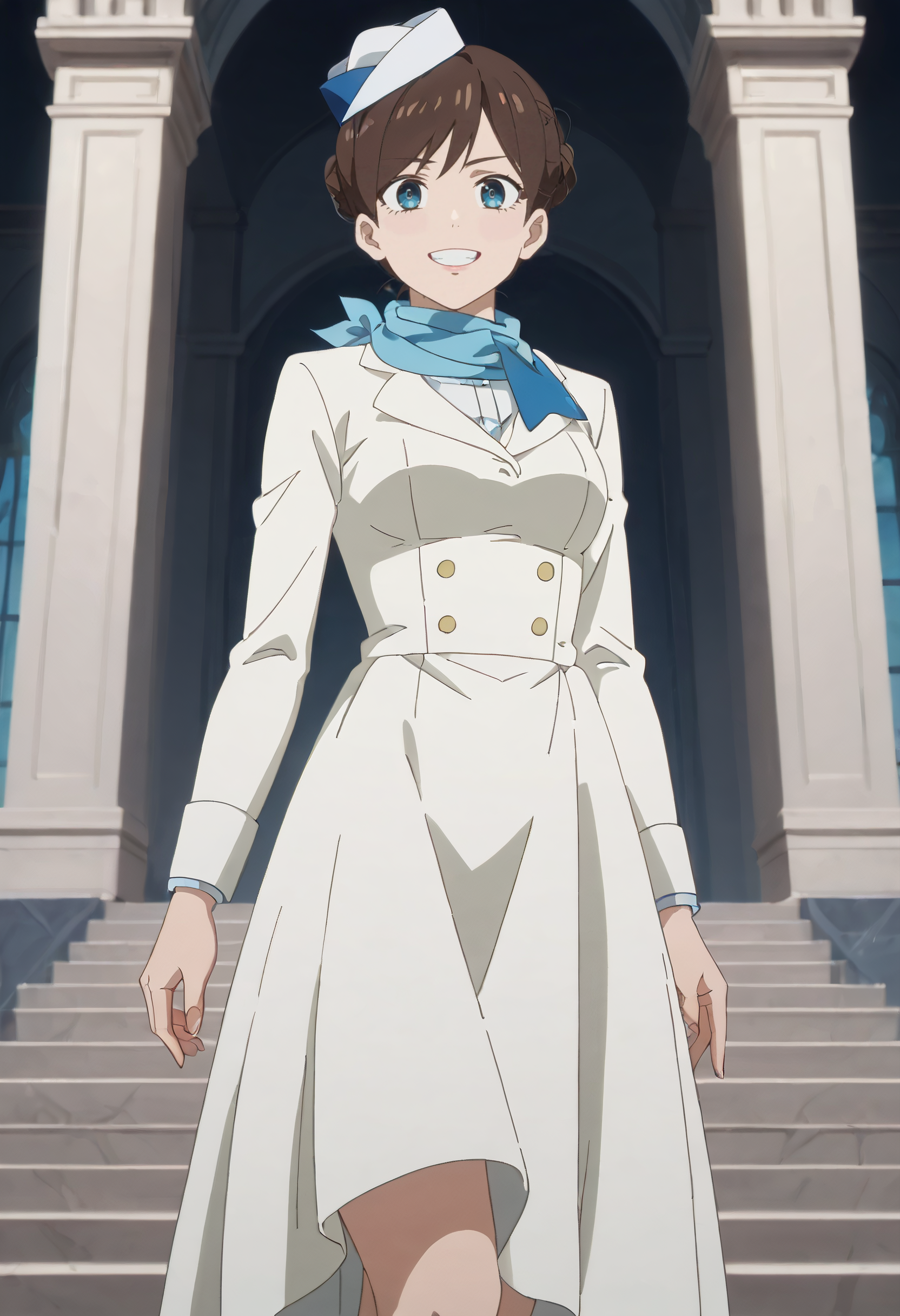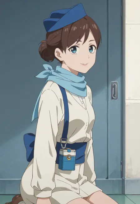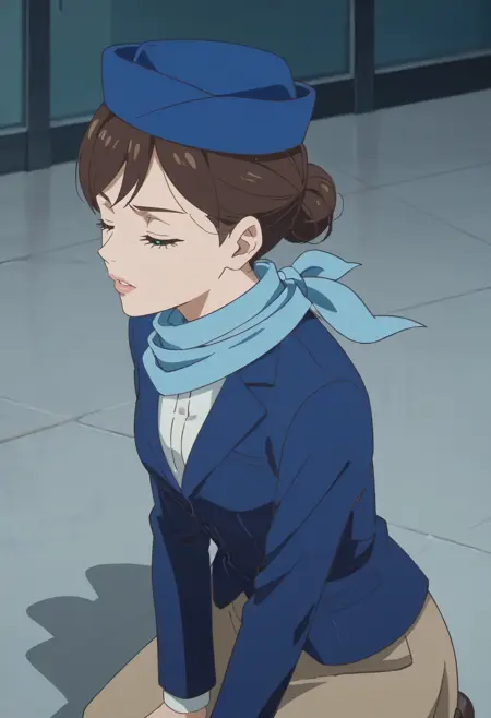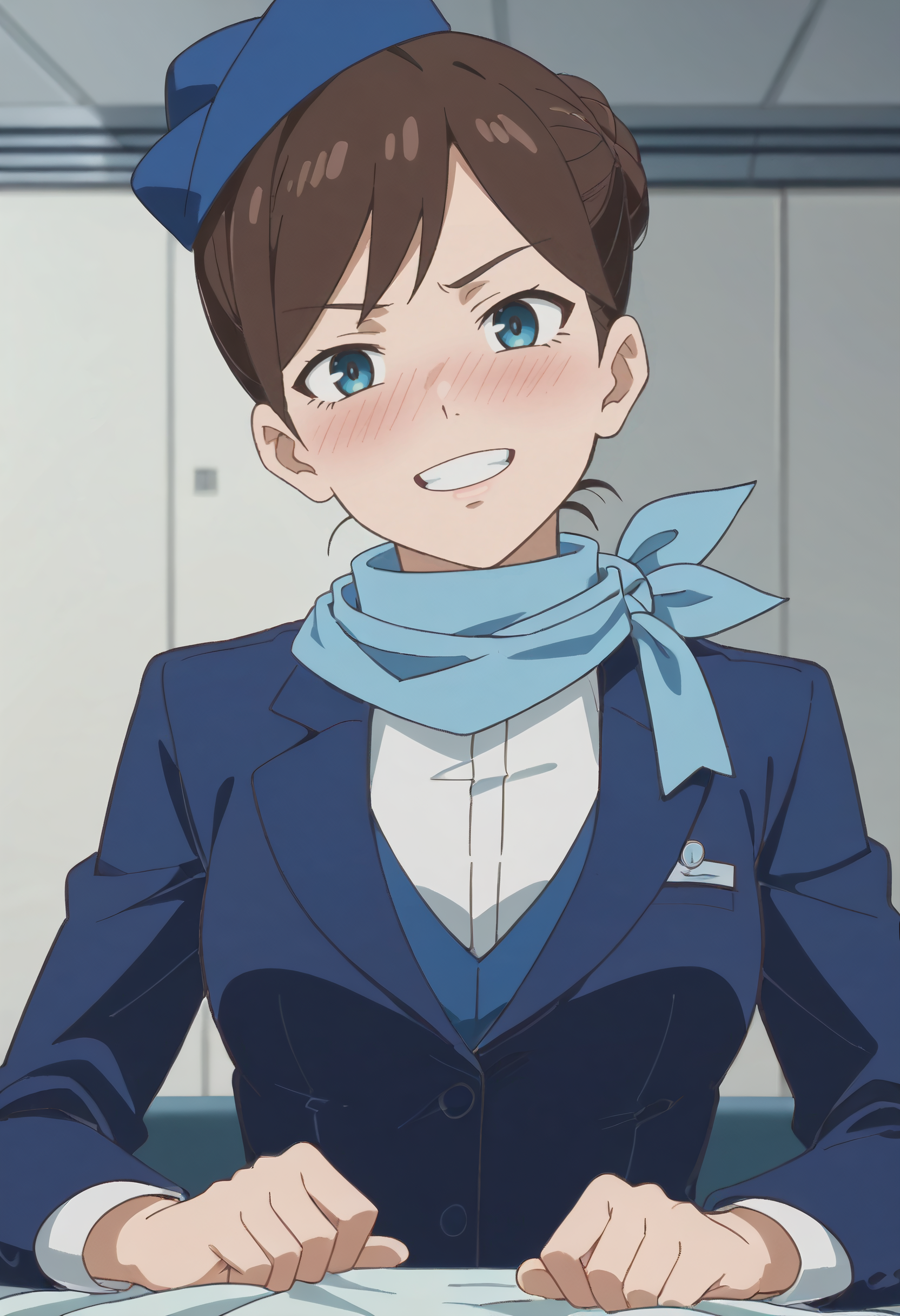 TDLFlightAttendant,短发,蓝色围巾,刘海,蓝眼睛,棕色头发,