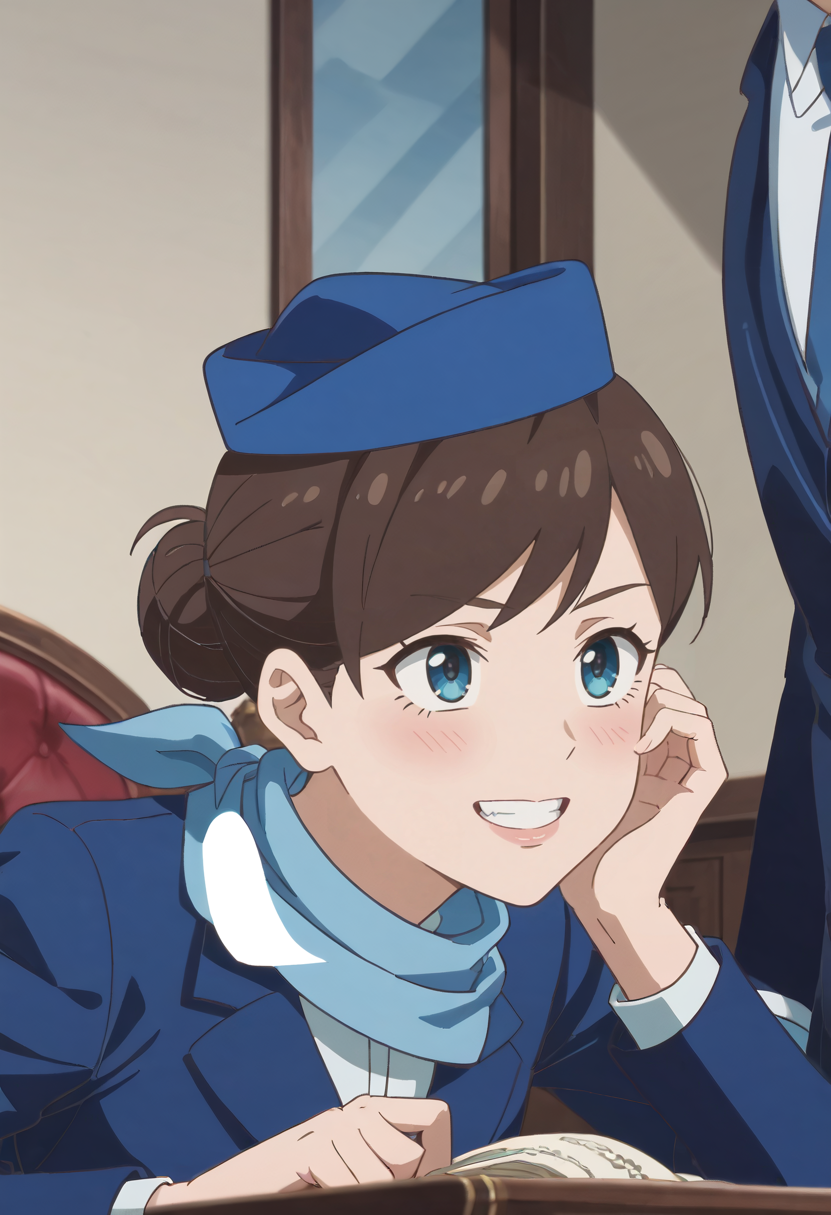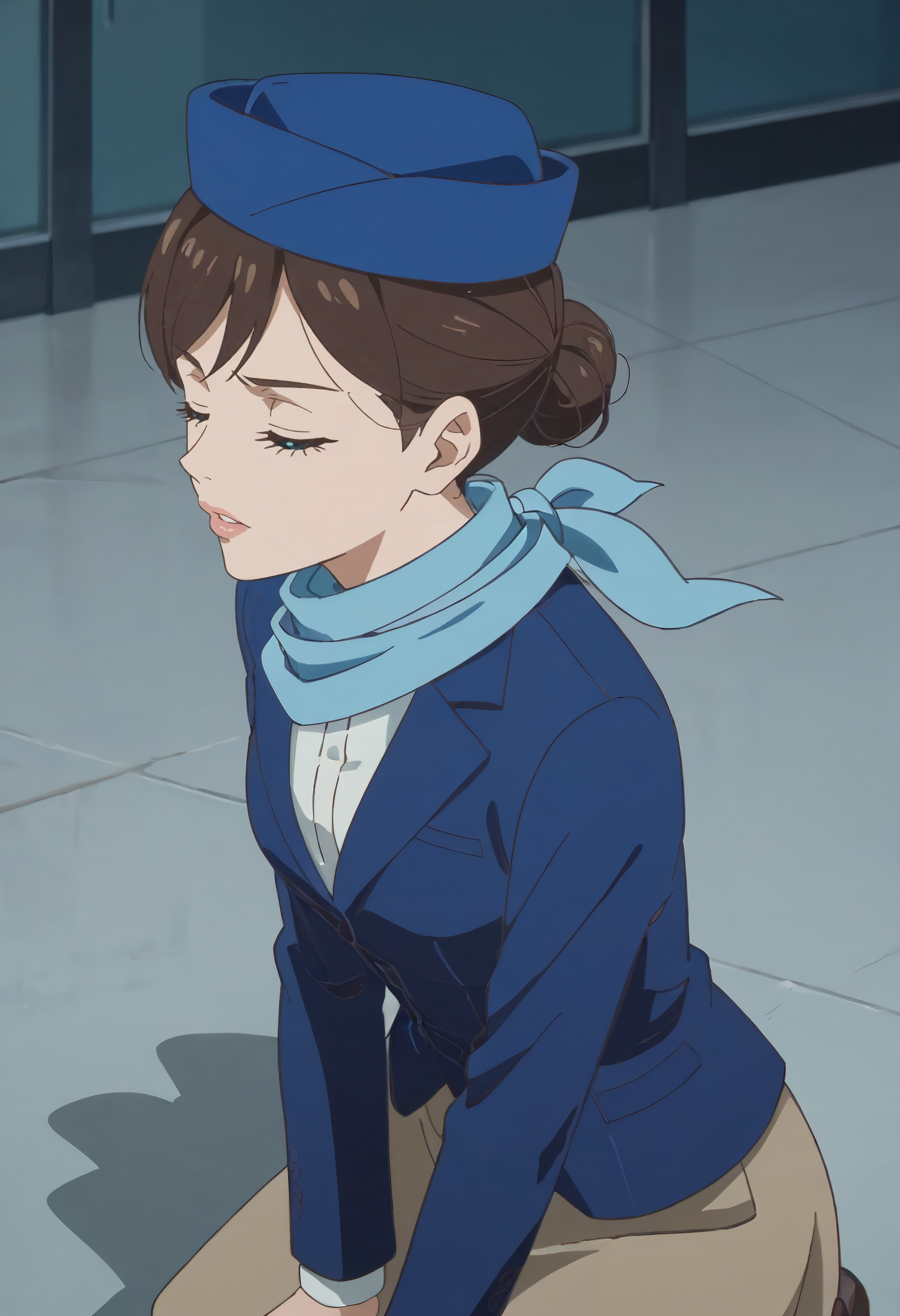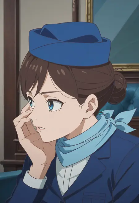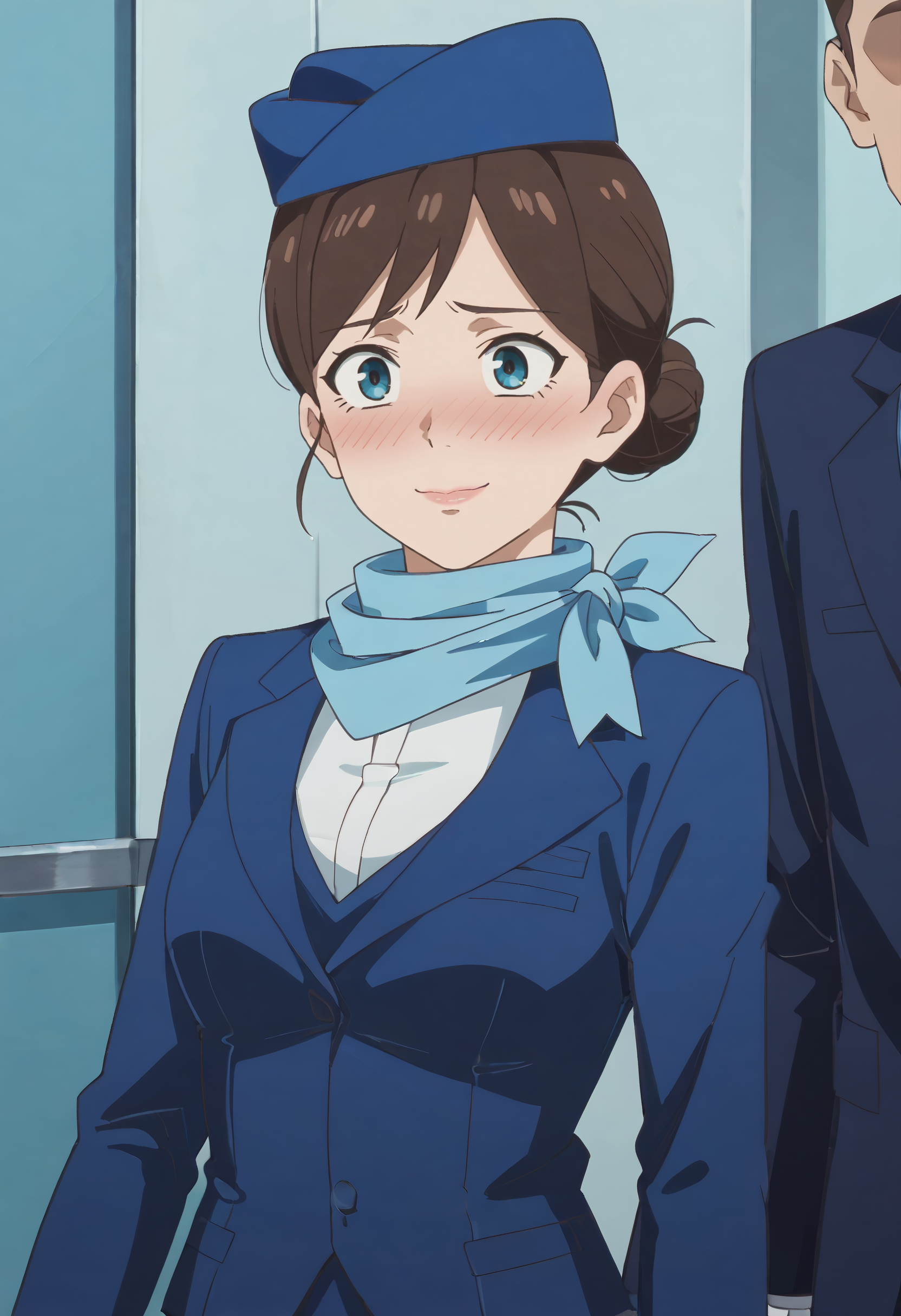 帽子,蓝色头饰,围巾,长袖,夹克,西装,贝雷帽,正式,空乘人员,
