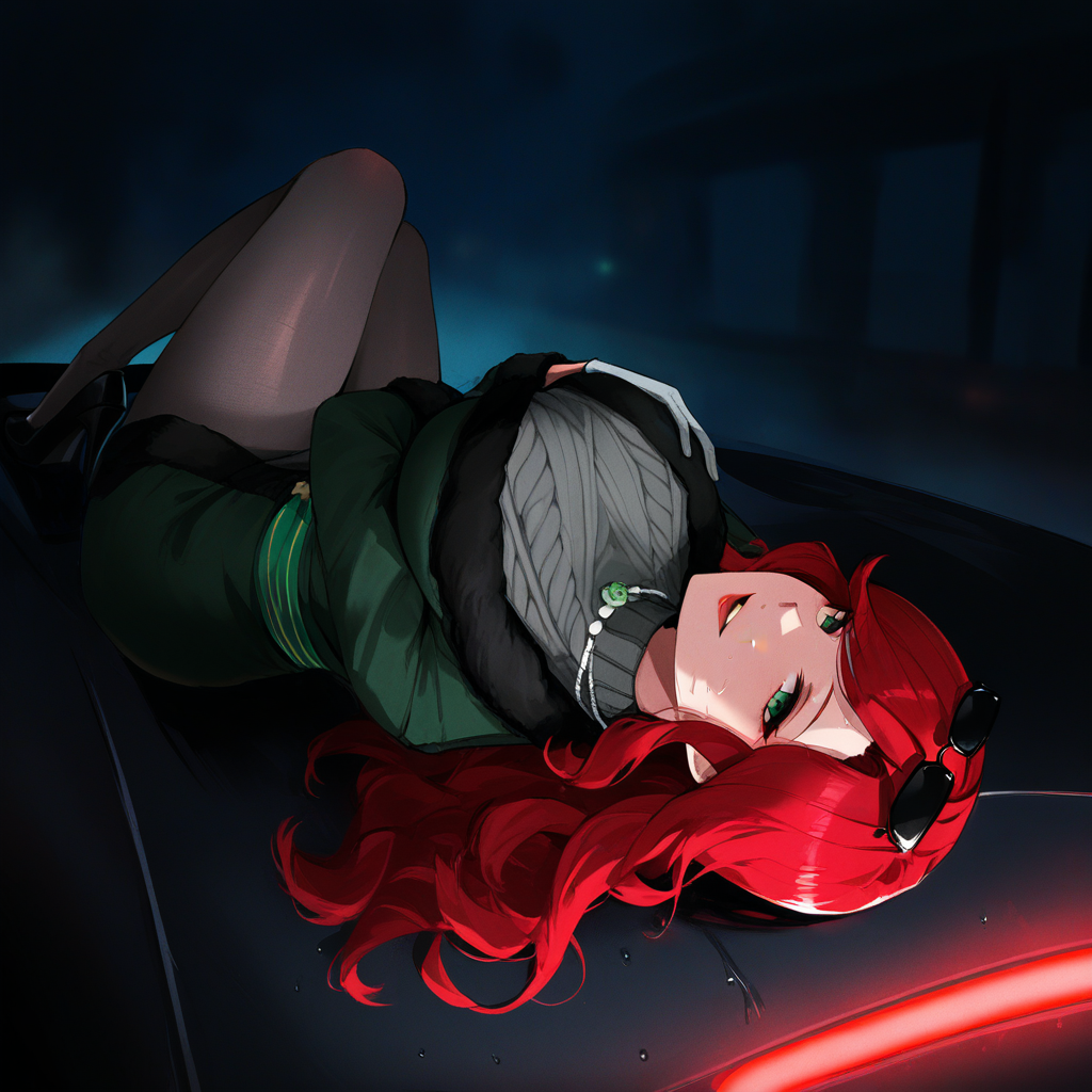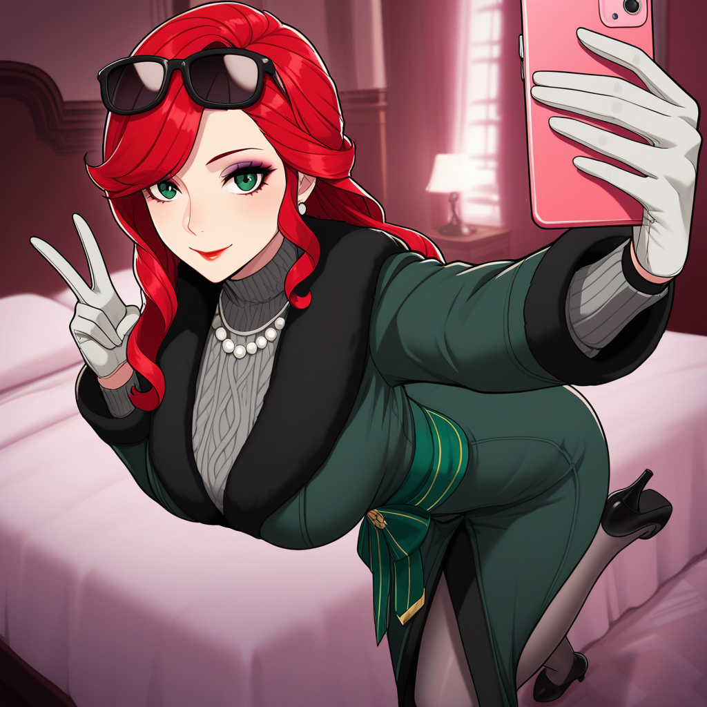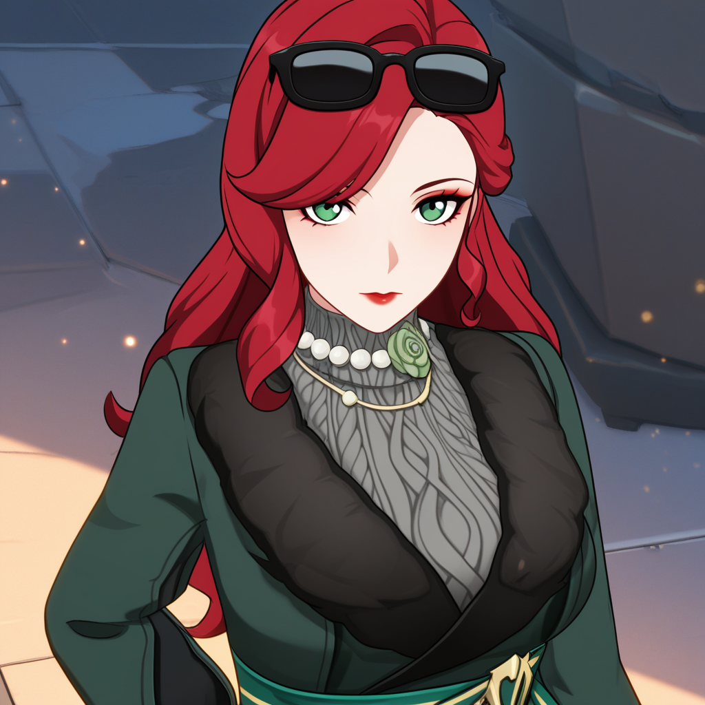 外見:1girl, ブラックサングラス, 頭に眼鏡, 赤髪, 波状の髪, なびいた前髪, 長髪, メイク, 赤い唇, リップスティック, 緑の目, 大きな胸