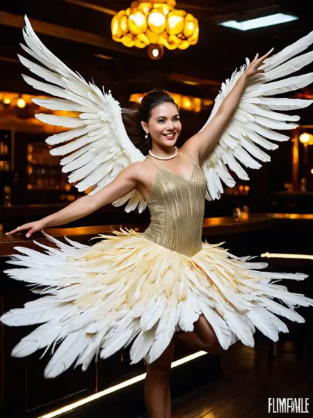 1920sflapperfatale, a woman dancing wildly in a dimly lit bar, feathers flying, golden light catching her beads, high energy, detailed face