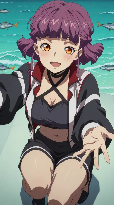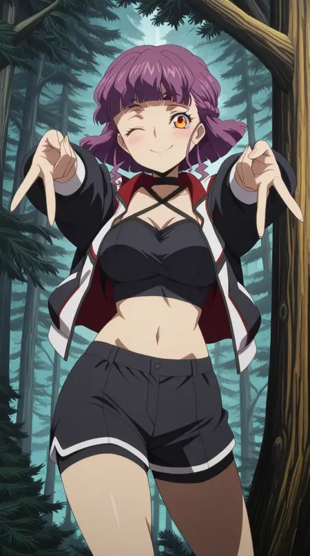 haruka rutaka, short hair, purple hair, braid, bangs, blunt bangs, shorts, orange eyes, black shorts, mature female, medium breasts, anime screencap