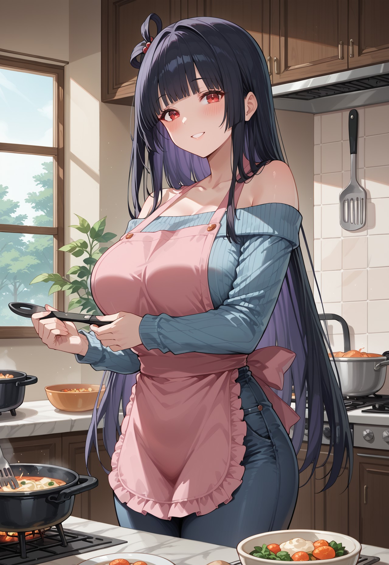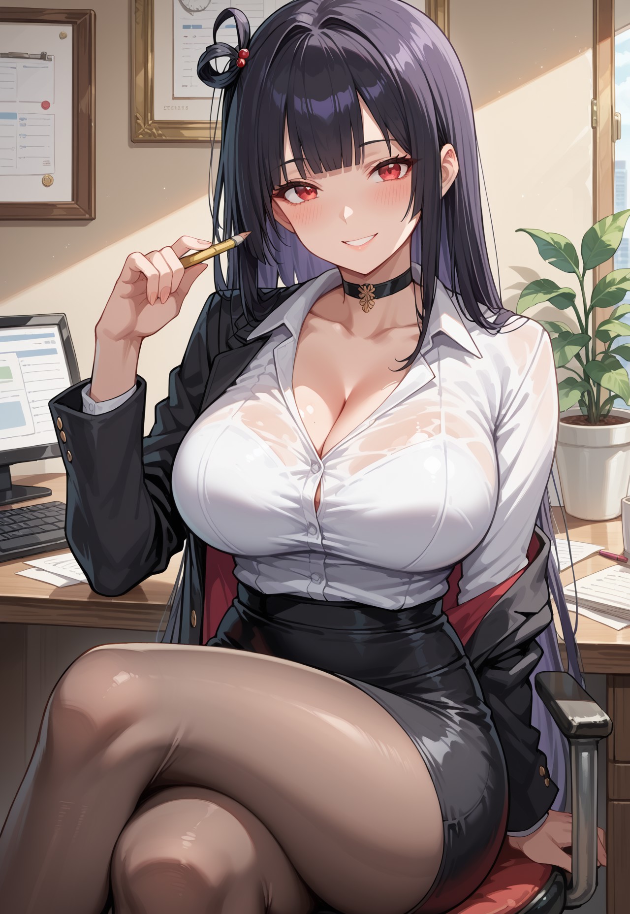 Rin_CZN, 黑发, 红眼, 长发, 齐刘海, 姬发式, 发簪, 紫色内发, 大胸