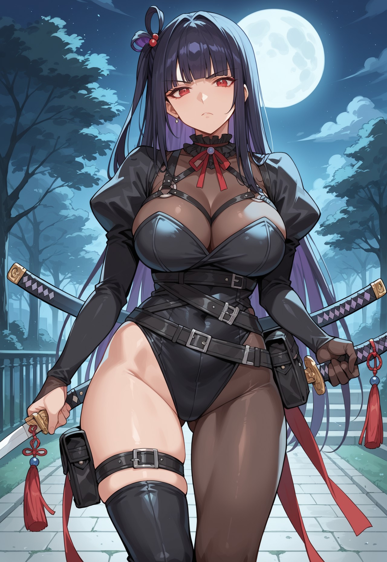 她的服装生成请使用(武器在身后时请用:swords, katana, scabbards):