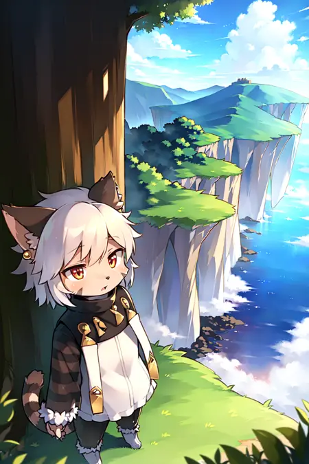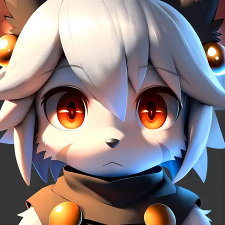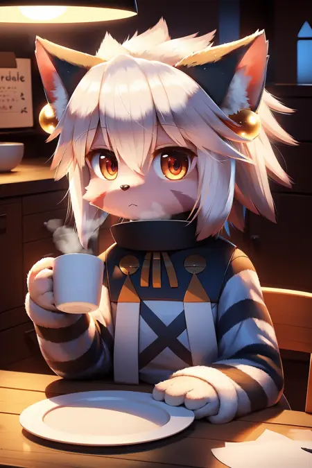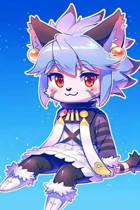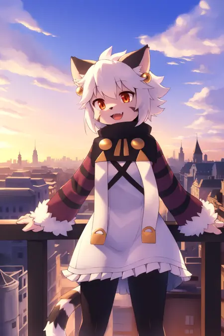 有用なタグ: 1girl, ファンシーな女性, 猫の耳, 赤い目, オレンジ色の目, 短い髪, 白い髪, 顔の模様, 動物の鼻, 縞模様の尾,