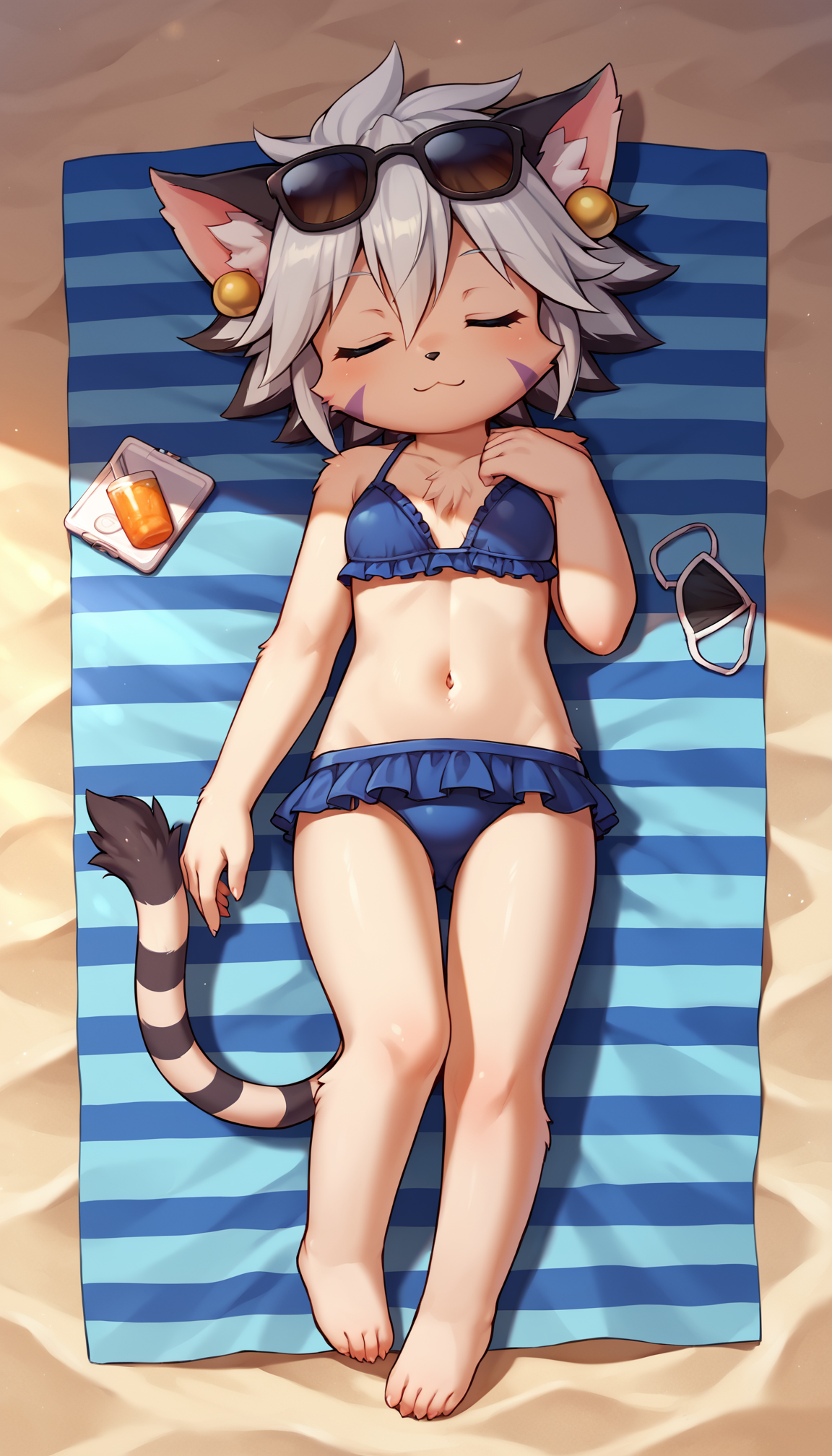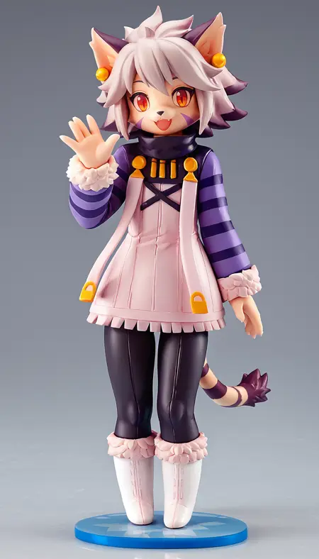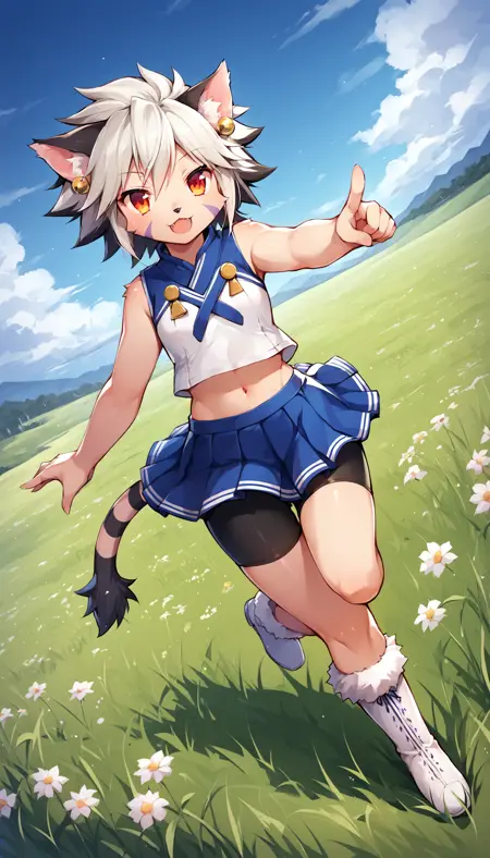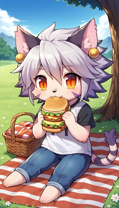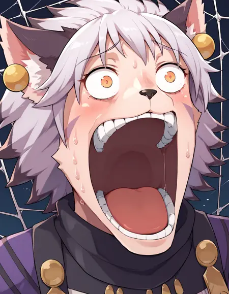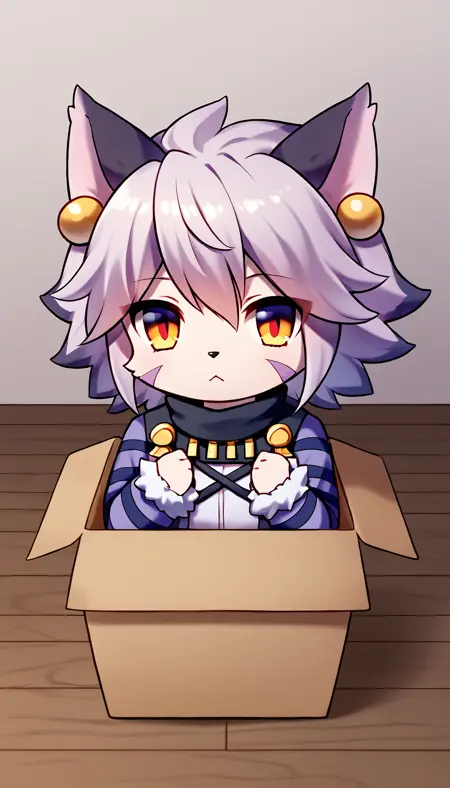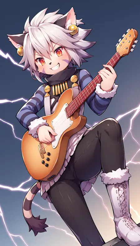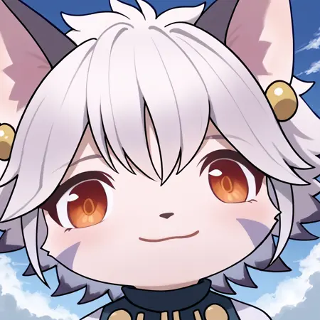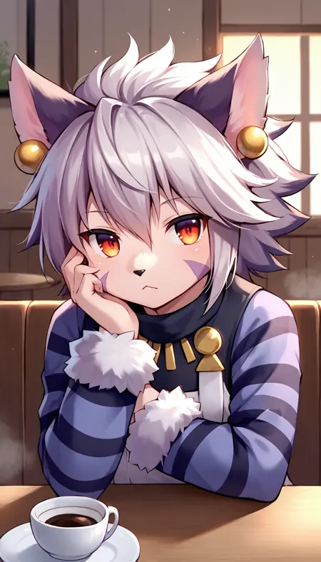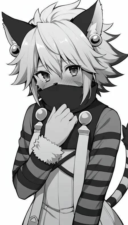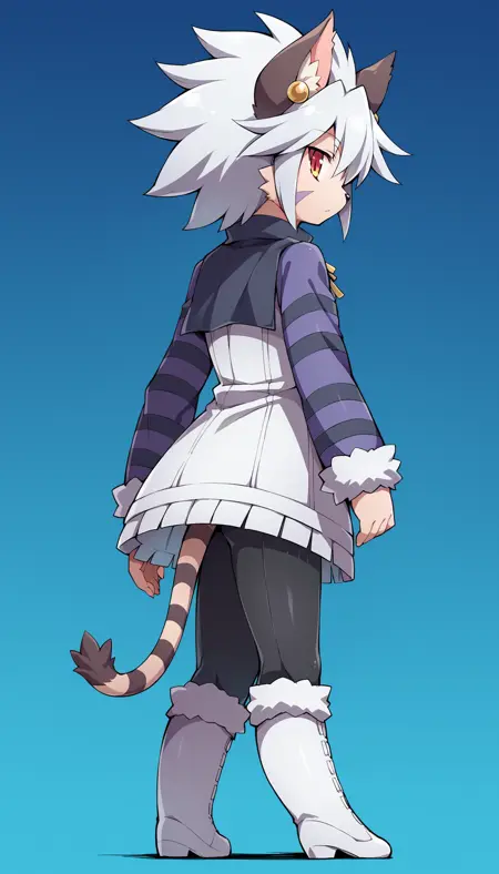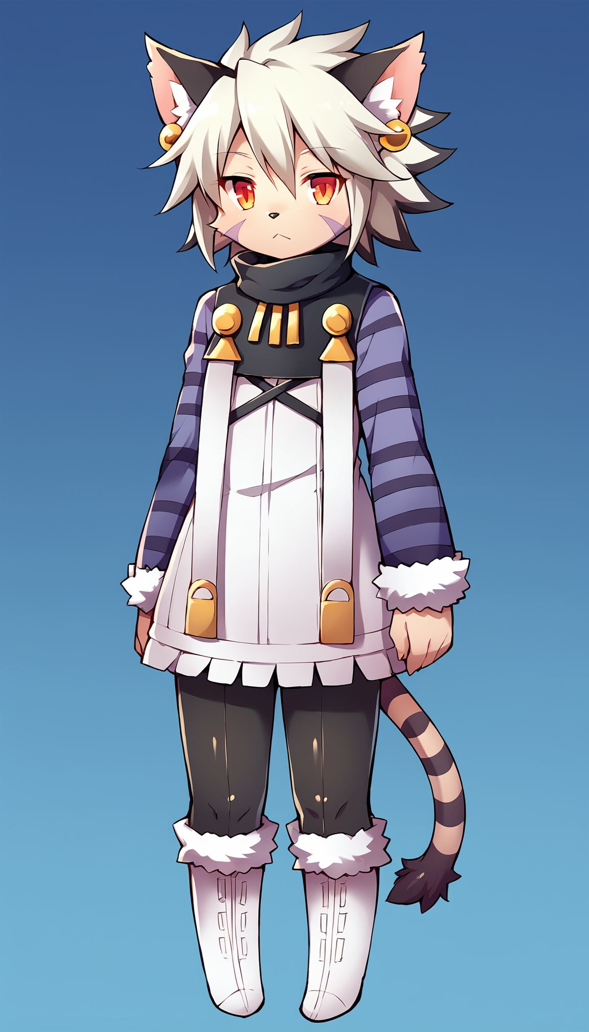 Useful Tags: 1girl, furry female, cat ears, red eyes, orange eyes, short hair, white hair, facial mark, animal nose, striped tail,