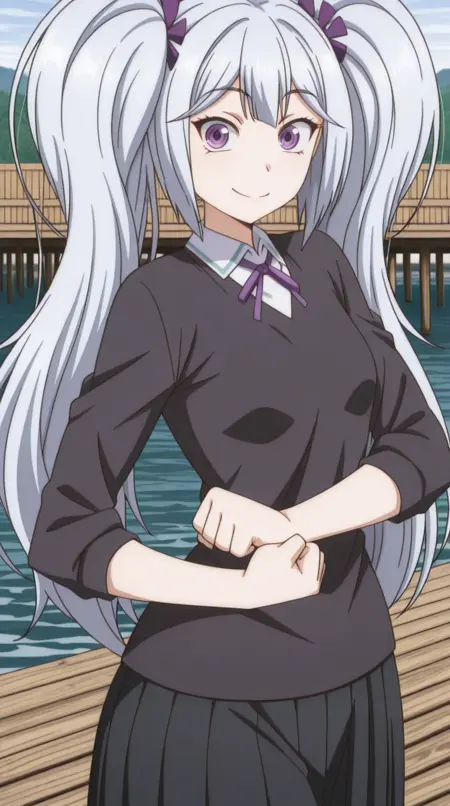 スカート, リボン, プリーツスカート, 紫色のリボン, セーター, 黒いセーター, 黒いスカート, ポロシャツ, 白いシャツ,