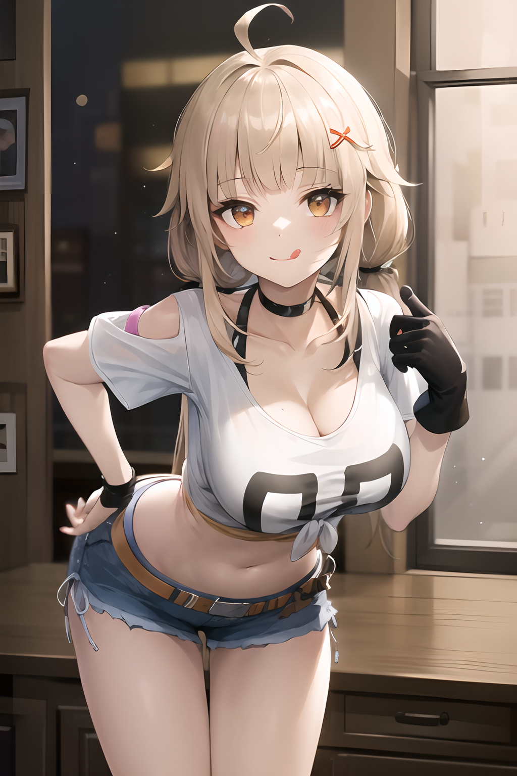 하의: denim shorts, belt, hip pouch(학습이 잘 안 되었으면 생략 가능), boots, white socks, bandaid on leg, bandaid on knee