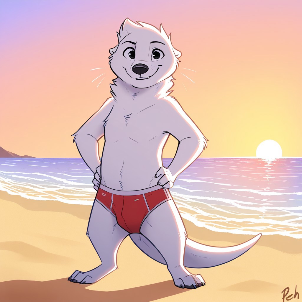 otter, otter boy, white fur, black eyes, black nose, otter ears, otter tail,