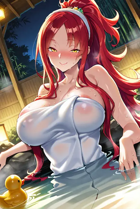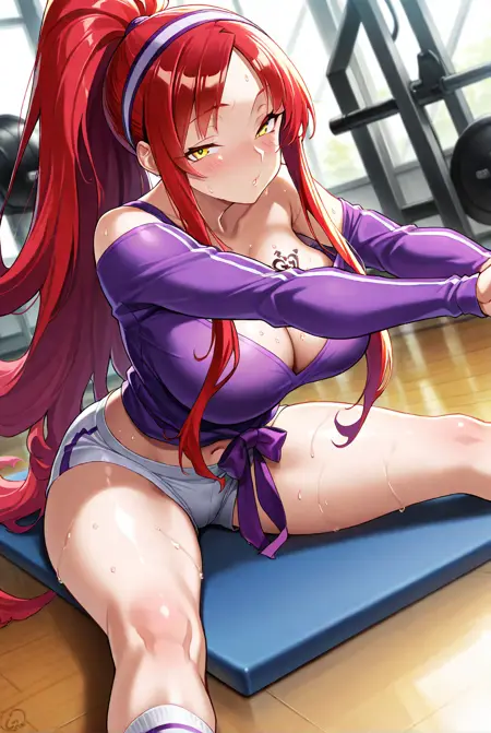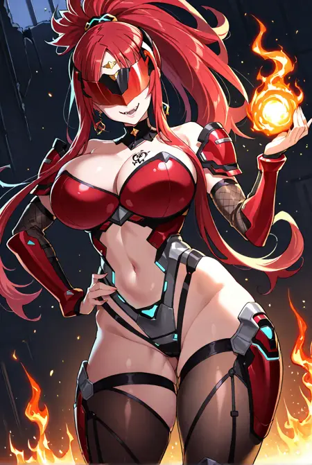 - 赤い鎧、ビーサー、外側の襟、ストラップレス、レオタード、腹部カットアウト、股間カットアウト、ハイソックス; ポニーテール;