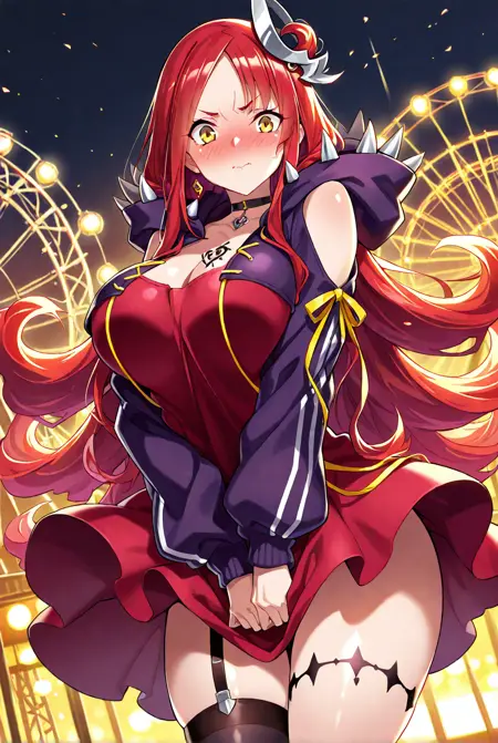 - ファー縁取り、赤いチャイナドレス、レース縁取り、衣装のカットアウト、透け感、おへそカバー、(黒)レース手袋、黒いハイソックス; 結んだ髪、髪飾り、髪リボン、ヘアスクラッチ;