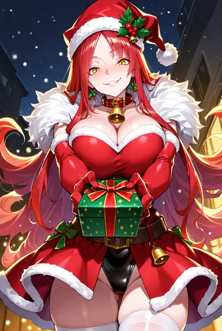- クリスマス帽、ファー縁取り、髪飾り、チョーカー、ベル、サンタドレス、ストラップレス、肘まで手袋、ベルト、黒いレオタード、股間カットアウト、白いハイソックス;