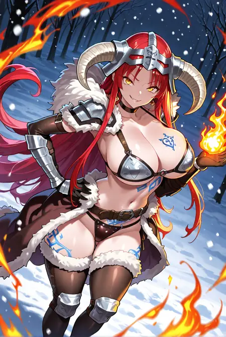 - 角付きヘルメット、鎧、ファー縁取り、胸のベルト、タトゥー、ビキニアーマー、肘まで手袋、ガントレット、腰のカーペット、ベルト、ハイソックス、装甲ブーツ;