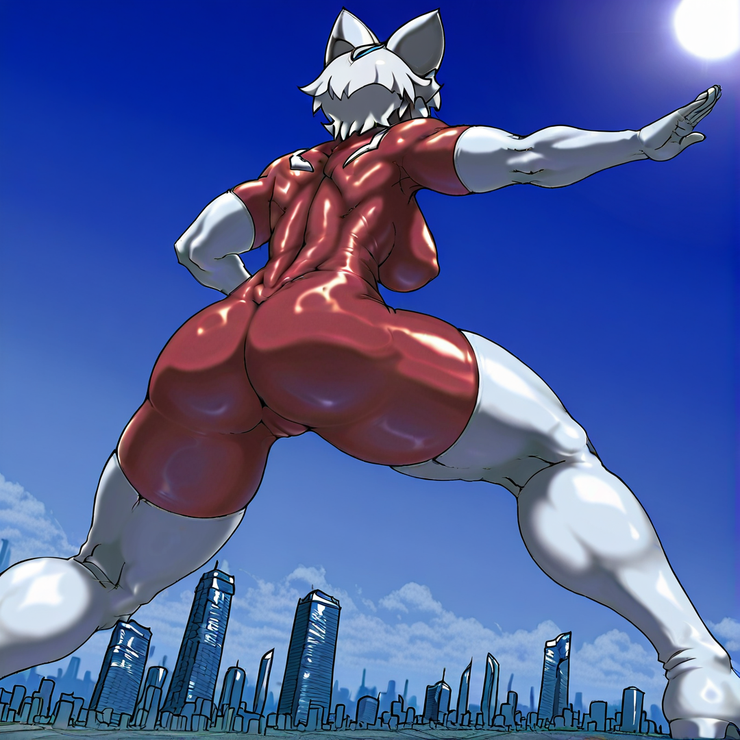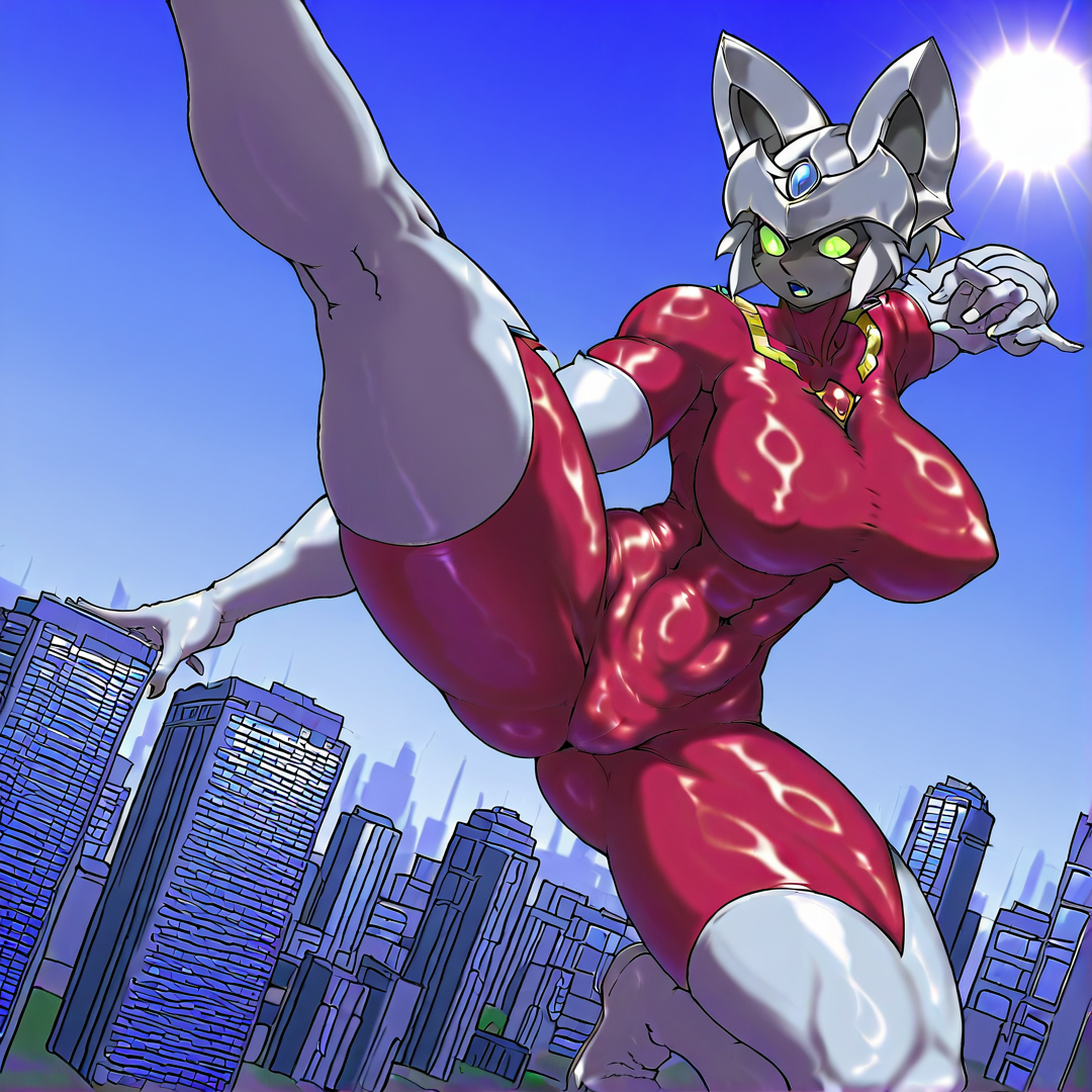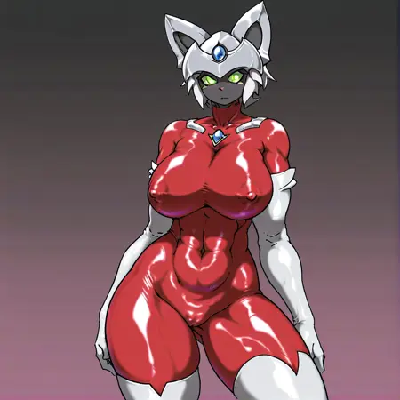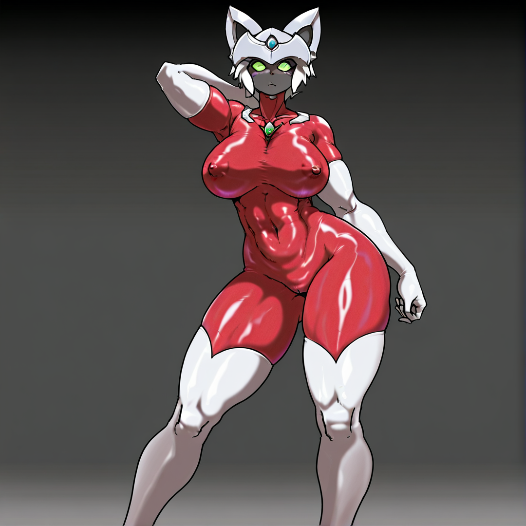 basic prompt:CatUltra, solo,1girl, green eyes, blue forehead jewel, blue chest jewel, white helmet, skintight, red bodysuit, bodysuit, white elbow gloves, white thigh boots, short hair, white hair, black skin