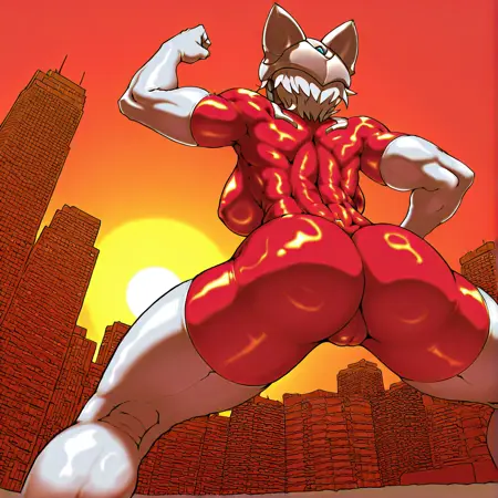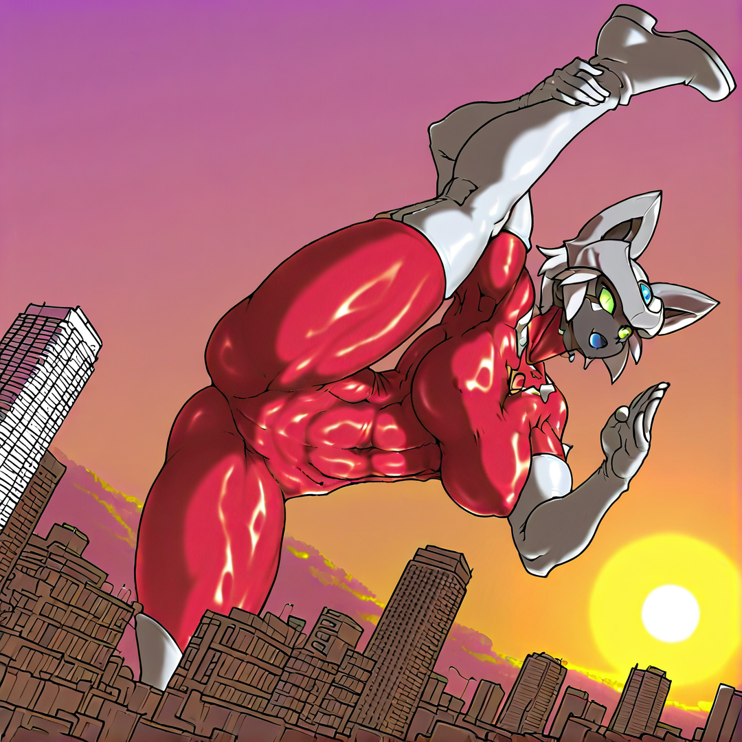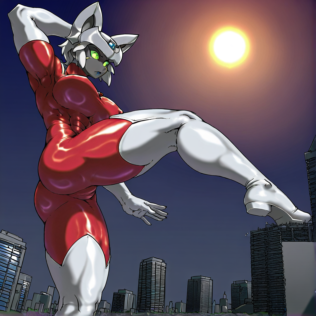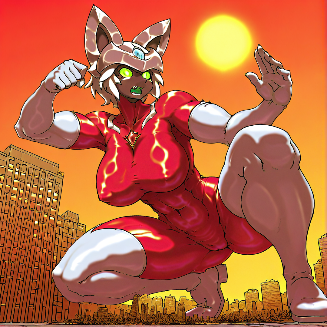 basic prompt:CatUltra, solo,1girl, green eyes, blue forehead jewel, blue chest jewel, white helmet, skintight, red bodysuit, bodysuit, white elbow gloves, white thigh boots, short hair, white hair, black skin
