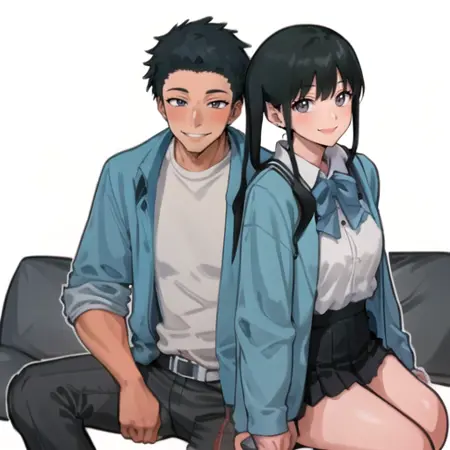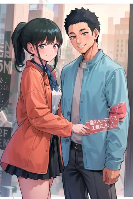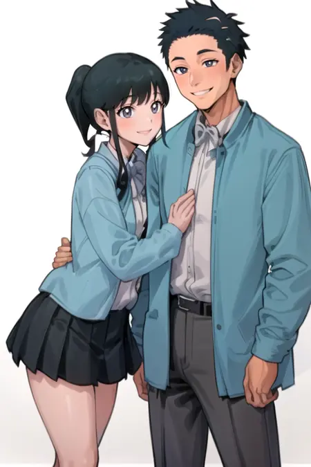 HusbandYoruGirlfriendYoru, a man and a woman, hetero, standing, smile, cowboy shot