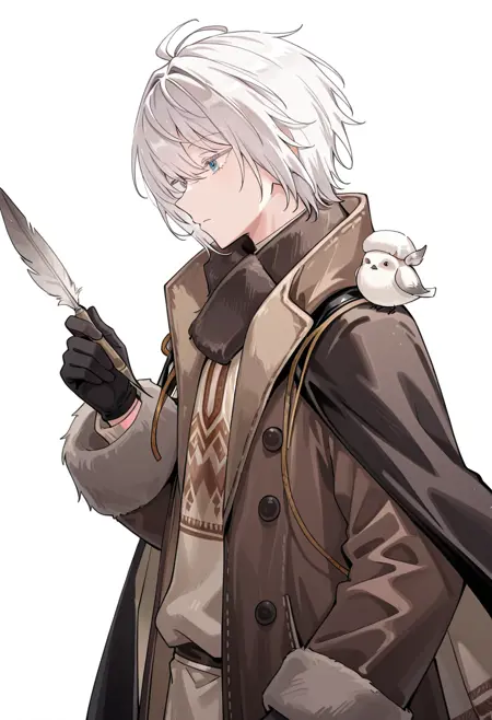 winter \(reverse:1999\),1boy,gloves,black gloves,cape,scarf,simple background,blue eyes,coat,white hair,fur trim,grey hair,bird,lora:reverse\_1999\_winter:0.9