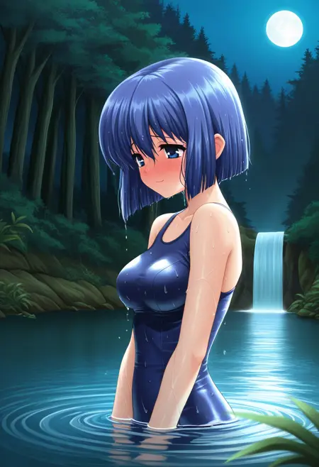 - momijiww, 小柄, 青い目, たれ目, 青髪, 中長髪,ボブカット, 切りっぱなし, 髪が目を隠す, 平らな胸,