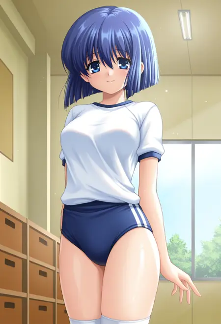 体育着, 体育シャツ, ショートスリーブ, 青いブルマ, 白い膝丈ソックス,