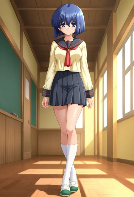 学校制服, セーラー服, 黒いセーラー襟, 赤いネクタイ, 淡い黄色のシャツ, スリーブカフス, 黒いプリーツスカート, ミニスカート, 白い膝丈ソックス, 緑の上履き,