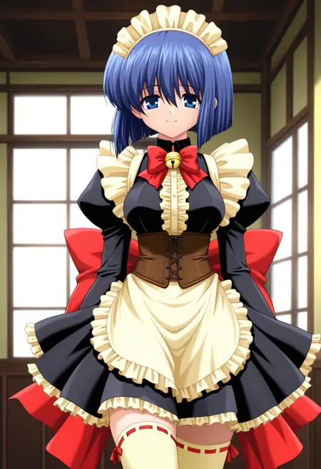 メイド, メイドヘアアクセサリー, 赤いボウタイ, ジャンクルベル, 黒いドレス, フリル付きドレス, 中央フリル, パフスリーブ, ジュリエットスリーブ, 茶色のコルセット, 赤い背中リボン, 大きなリボン, ウエストエプロン, メイドエプロン, 淡い黄色のエプロン, 淡い黄色の太ももハイ, リボン飾り付き太ももハイ,