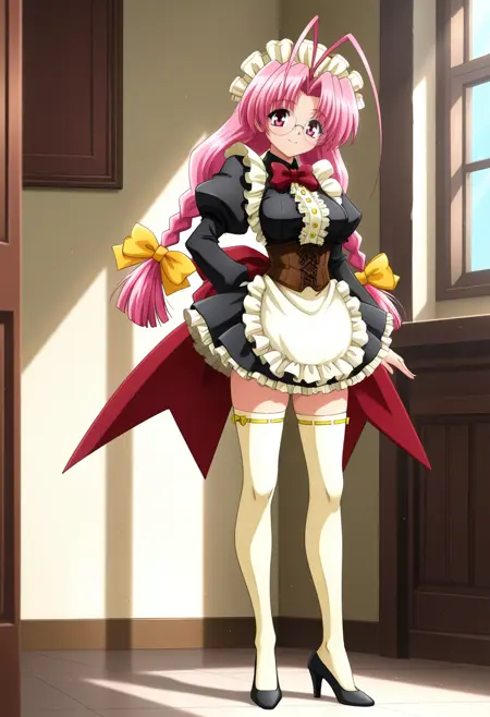 메이드, 메이드 헤어 액세서리, 분홍색 넥타이, 검은 드레스, 짧은 드레스, 프릴 드레스, 중앙 프릴, 볼륨 있는 긴 소매, 줄리엣 소매, 갈색 코르셋, 분홍색 뒷단 매듭, 큰 매듭, 허리 앞치마, 메이드 앞치마, 연노랑 앞치마, 제타이 류오키, 연노랑 허벅지 양말, 리본 장식 허벅지 양말, 펌프스, 하이힐,