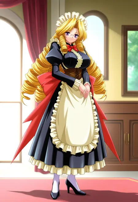 메이드, 메이드 헤어 액세서리, 연한 빨강 넥타이, 검은 드레스, 긴 드레스, 프릴 드레스, 중앙 프릴, 볼륨 있는 긴 소매, 줄리엣 소매, 갈색 코르셋, 연한 빨강 뒷단 매듭, 큰 매듭, 허리 앞치마, 메이드 앞치마, 연노랑 앞치마, 펌프스, 하이힐,