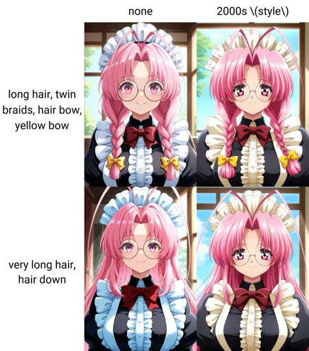 프롬프트에 "2000s (style)"를 사용하면 일러스트가 고전 게임 스타일에 더 가까워집니다.