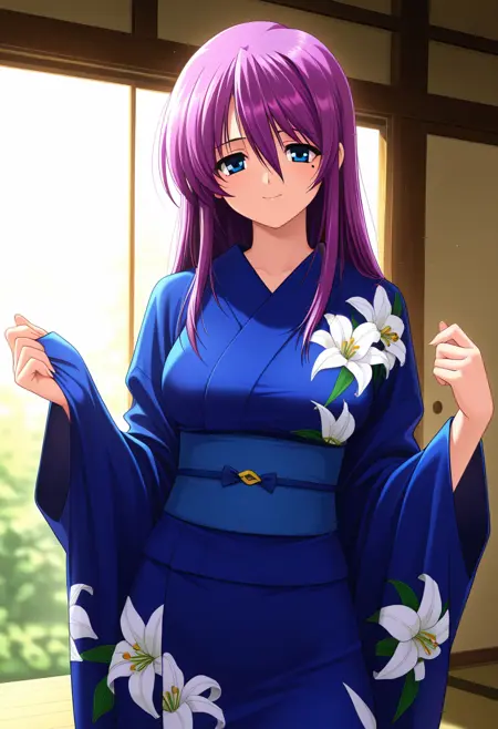 일본 전통 복장, 파란색 키모노, 유카타, 무늬 키모노, 릴리 무늬, 긴 소매, 넓은 소매, 파란색 띠,