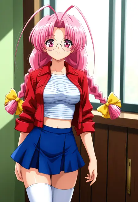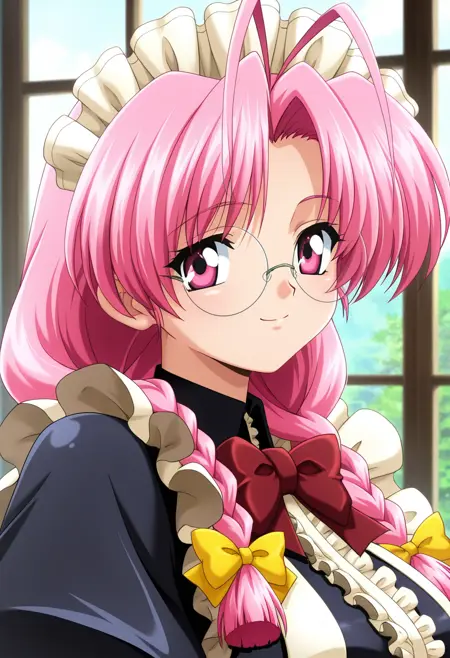 ayaneww, 분홍색 눈, 둥근 안경, 분홍색 머리, 긴 머리, 두 개의 땋은 머리, 머리 리본, 노랑 리본, 갈라진 앞머리, 안테나 머리, 중간 크기의 가슴,