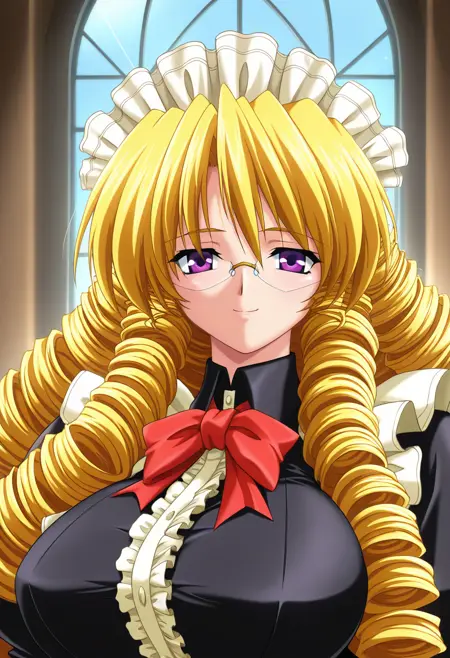 - mariww, 보라색 눈, 프레임 없는 안경, 금발, 매우 긴 머리, 드릴 머리, 큰 가슴,