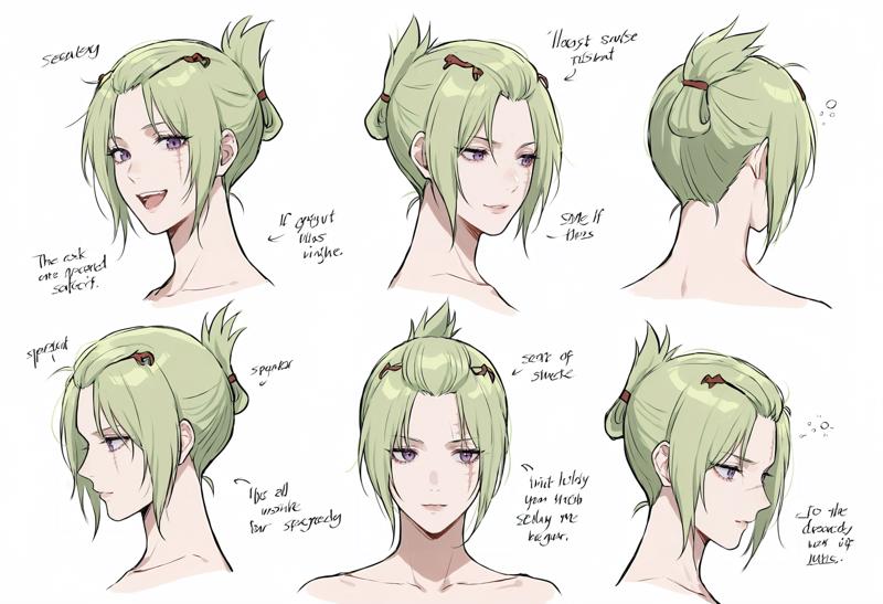 1人女の子、紫の目、傷、顔の傷、緑の髪、金髪、短い髪、折りたたんだポニーテール