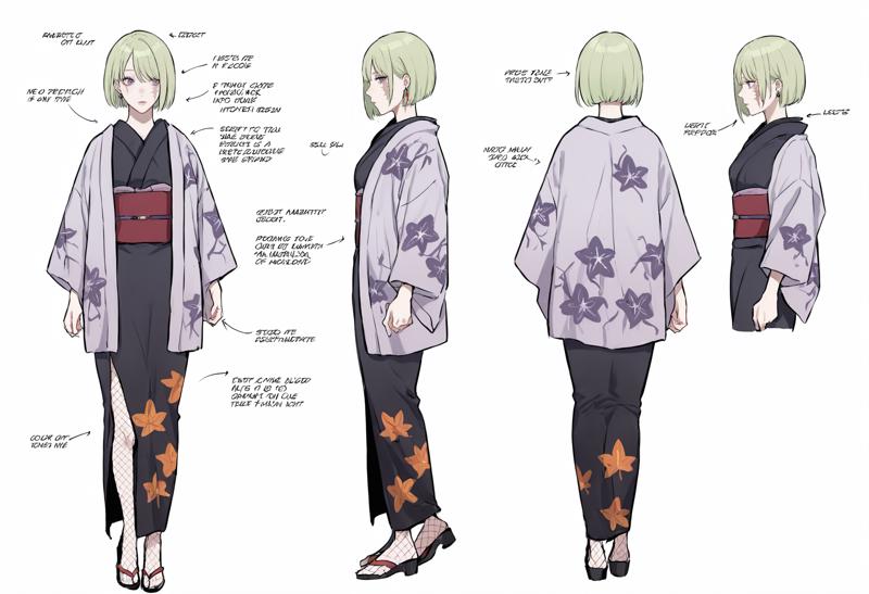 1人女の子、紫の目、傷、顔の傷、緑の髪、金髪、前髪、眉間の髪、ボブカット、やけどによる傷、頬の傷、和服、着物、黒い着物、短い髪、煙草管、帯締め、花柄、帯、葉柄、フィッシュネット、羽織、肩にかけるジャケット、長袖、イヤリング、ジュエリー