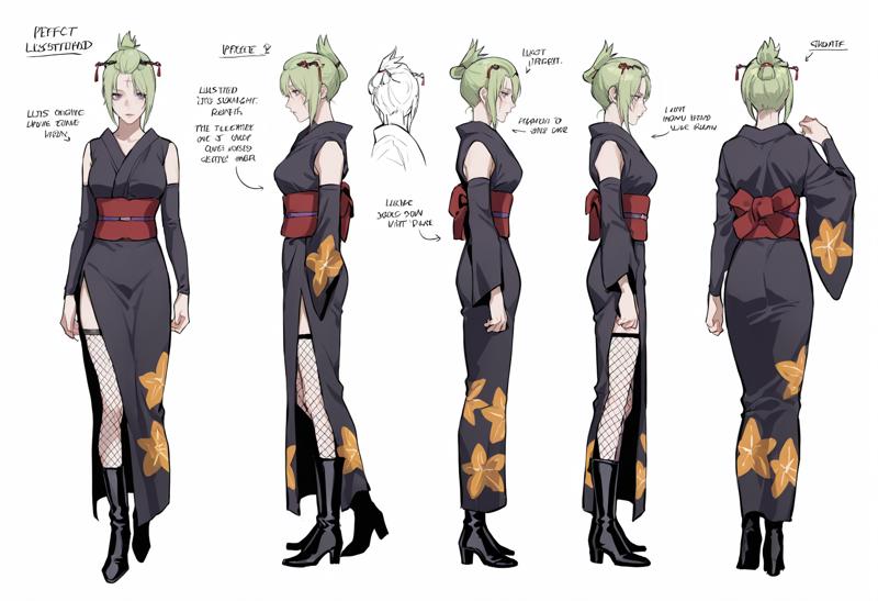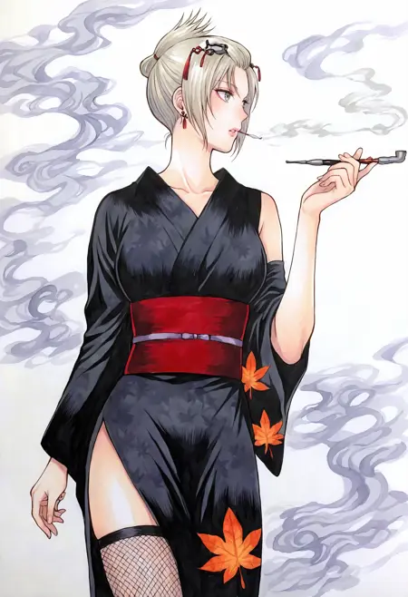 髪飾り、太ももハイソックス、煙草管、和服、着物、フィッシュネット、ブーツ、取り外し可能な袖、フィッシュネット太ももハイソックス、黒い着物、帯、帯締め、胸、黒い靴