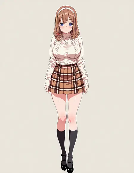 mai_ktsl,mai_koharukt,medium_hair,brown_hair,blue_eyes,large_breasts,hairband,heart_necklace,necklace,sweater,cable_knit,plaid_skirt,black_kneehighs,mary_janes